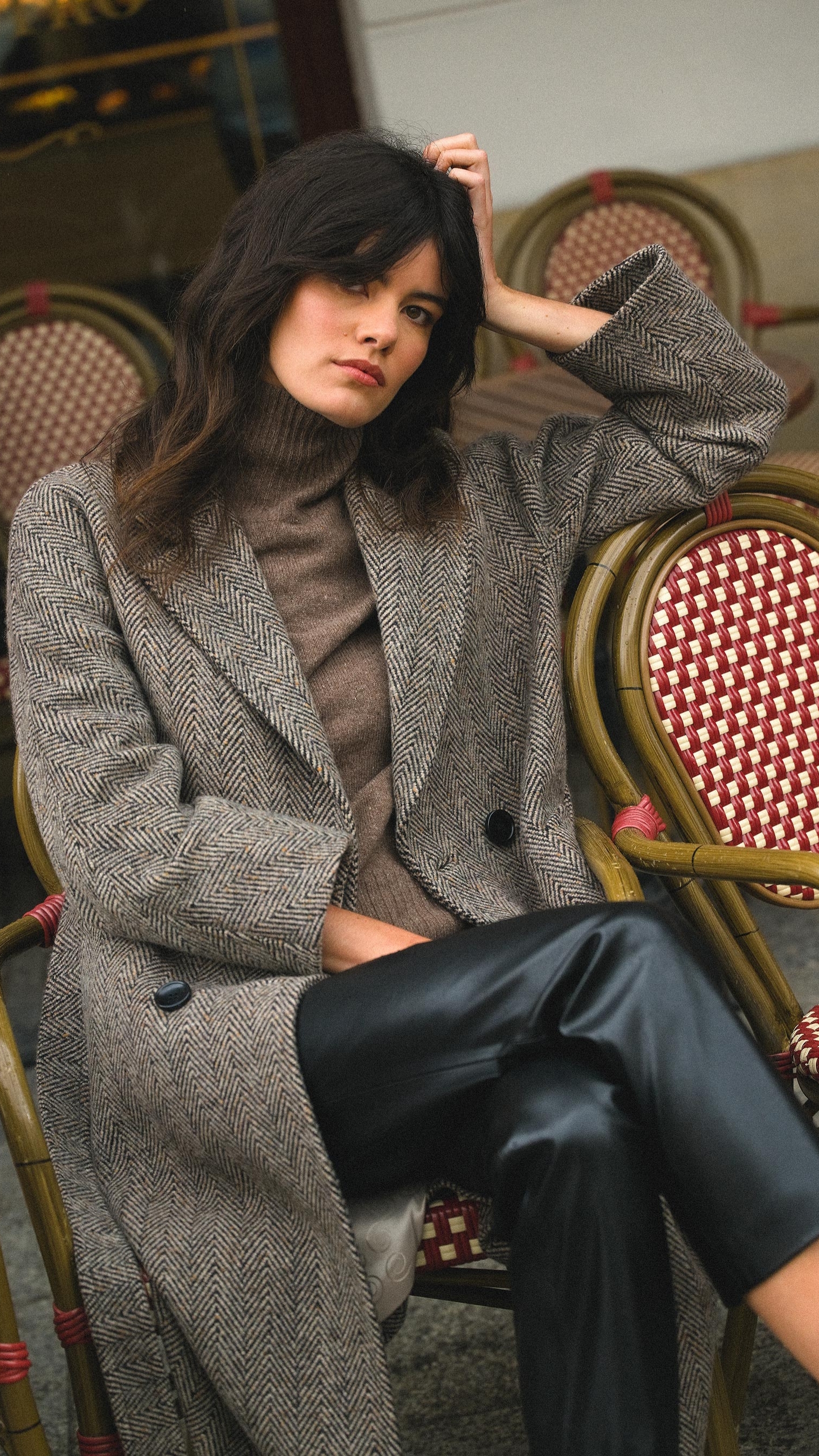 Czekoladowy garnitur damski, wełniane płaszcze i kaszmirowe swetry otulają sylwetkę, pozwalając poczuć komfort i spokój, podczas gdy burgundowe i intensywne czerwone detale pojawiają się jako mocny akcent, podkreślający pewność siebie i siłę charakteru. Neutralne szarości kontrastują z mocnymi skórzanymi akcentami, odzwierciedlając zmienność kobiety i rytm miejskiego życia – czasem dynamicznego, czasem spokojnego, pełnego refleksji i przyjemności małych chwil. To połączenie paryskiego, miejskiego szyku, nowoczesnej elegancji i ciepła jesiennej palety kolorów, które razem tworzą kolekcję pełną życia, charakteru i stylu.