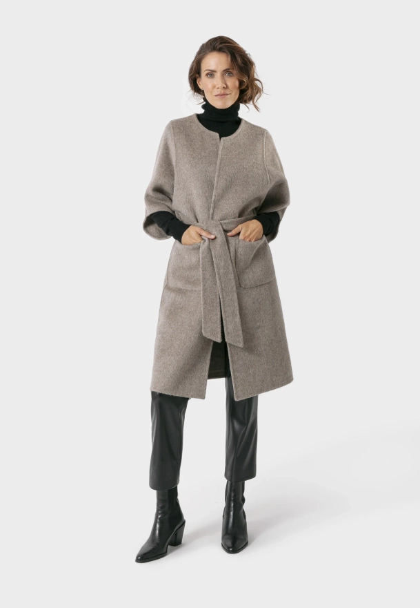 Beżowy wełniany płaszcz z wiązaniem