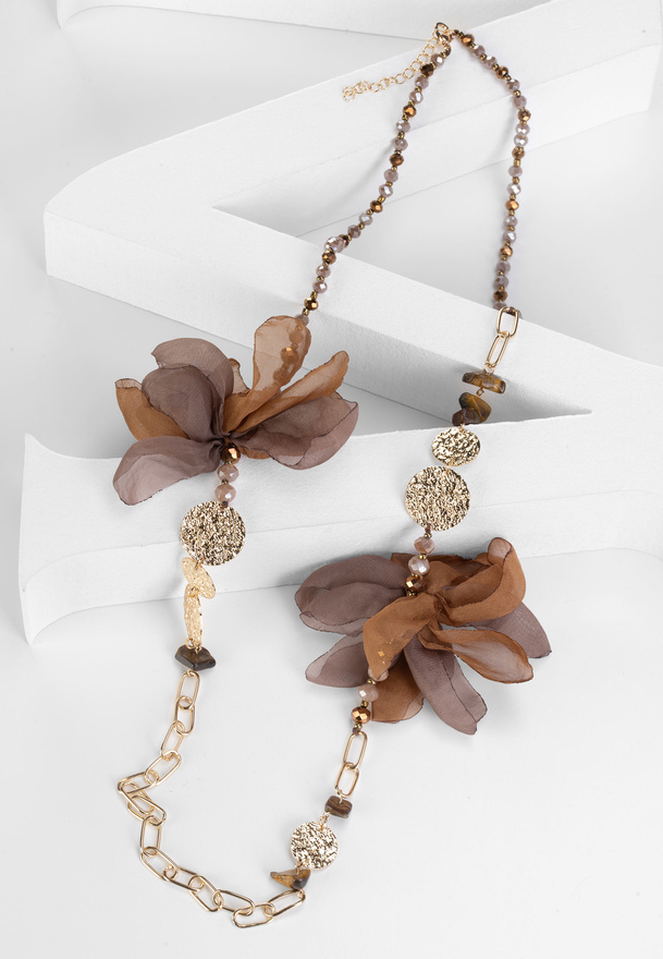 Długi naszyjnik z tiulowymi brązowymi kwiatami