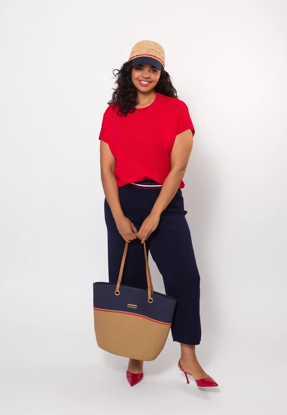 Beżowa czapka z granatowym daszkiem to funkcjonalny i modny dodatek do codziennych stylizacji. Jej uniwersalny design czapki z daszkiem przełamuje faktura, kolorystyka i czerwona wstawka biegnąca wokół obwodu czapki, nadając całości wyrazistego charakteru.  Czapka została wyposażona w regulowane wiązanie z tyłu, które pozwala precyzyjnie dopasować obwód do kształtu głowy, zapewniając komfort i stabilność noszenia przez cały dzień. Czapka stanowi świetny komplet z dużą letnią torbą MOLTON w tej samej kolorystyce.