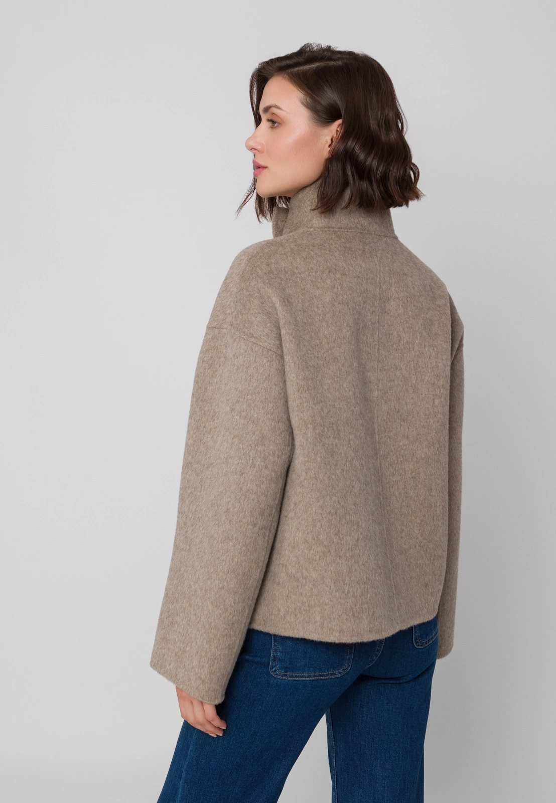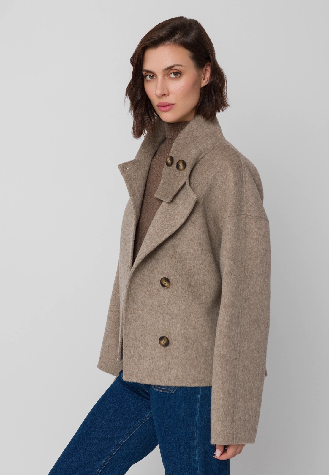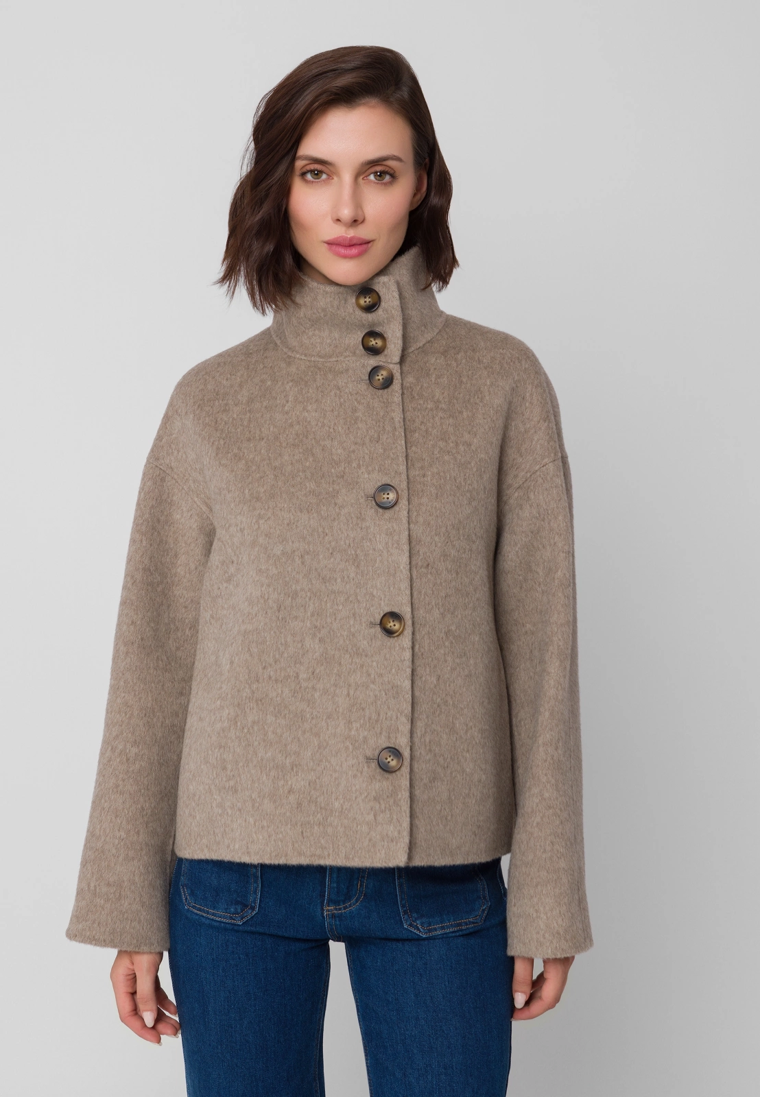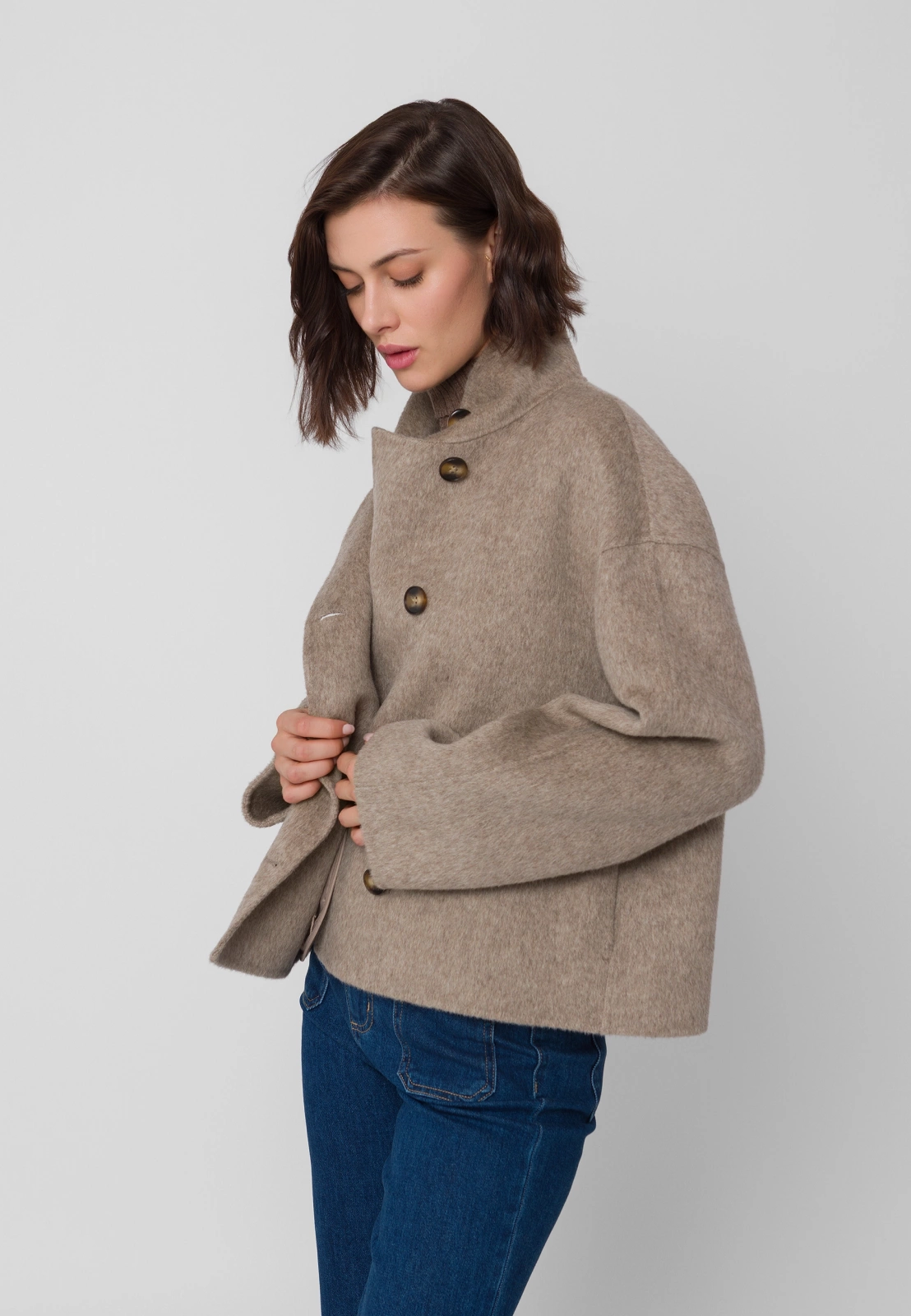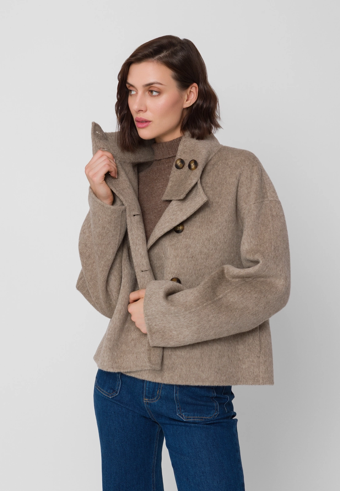 Beżowa kurtka typu double face wykonana w 100% z wełny to stylowa propozycja dla kobiet, które cenią połączenie klasyki i współczesnego designu. Krótki fason z wysokim kołnierzem i asymetrycznym zapięciem na guziki tworzy elegancki, nowoczesny look, idealny na chłodniejsze dni. Dzięki swojej strukturze kurtka pięknie układa się na sylwetce, a praktyczne kieszenie dodają jej funkcjonalności. Zapięta pod szyję skutecznie chroni przed wiatrem, a rozpięta prezentuje się nonszalancko, podkreślając ponadczasowy charakter modelu. Kurtka dostępna także w kolorze czarnym.