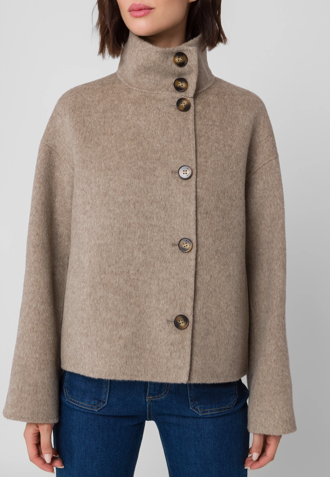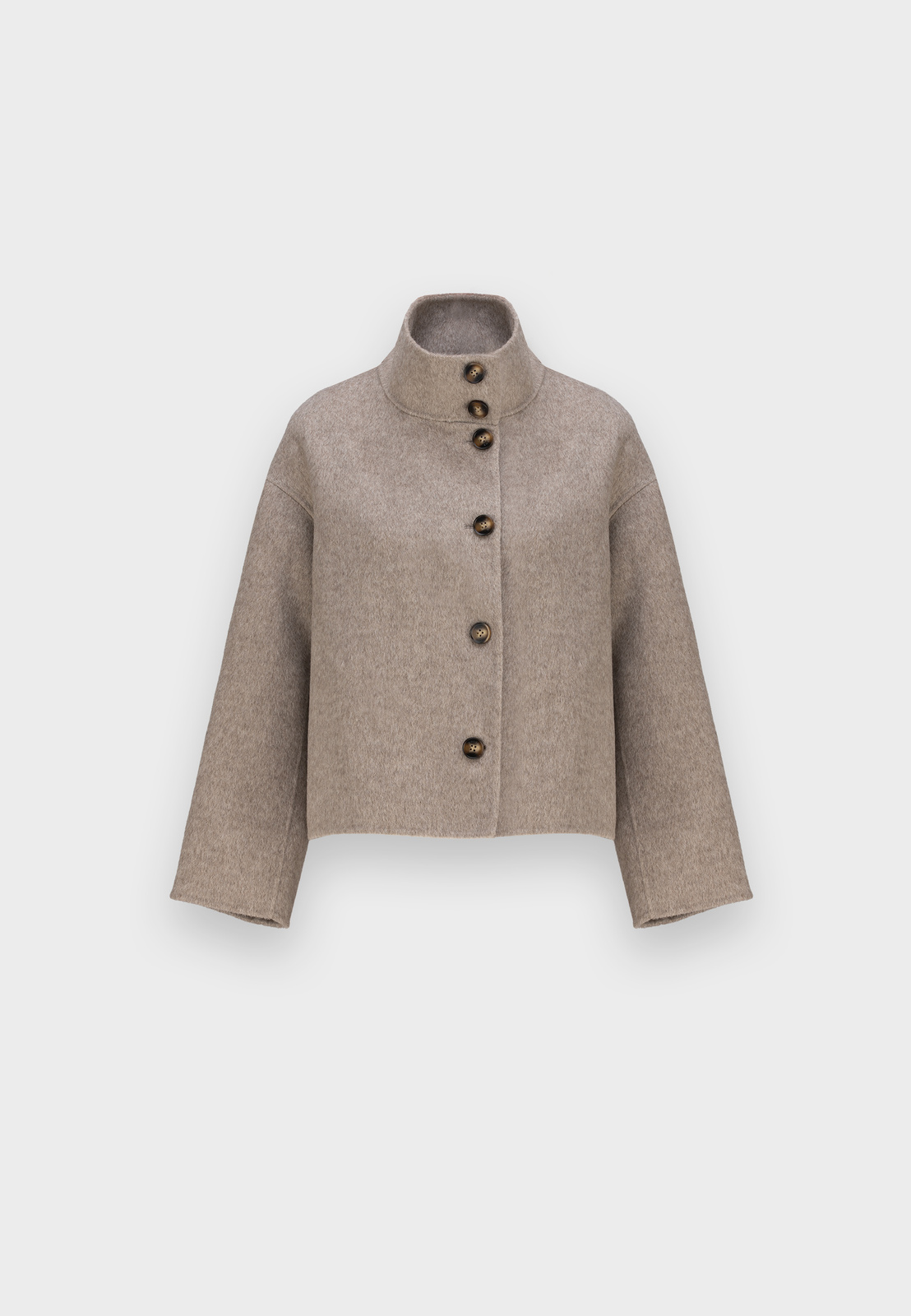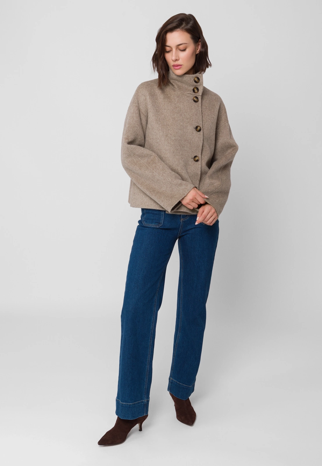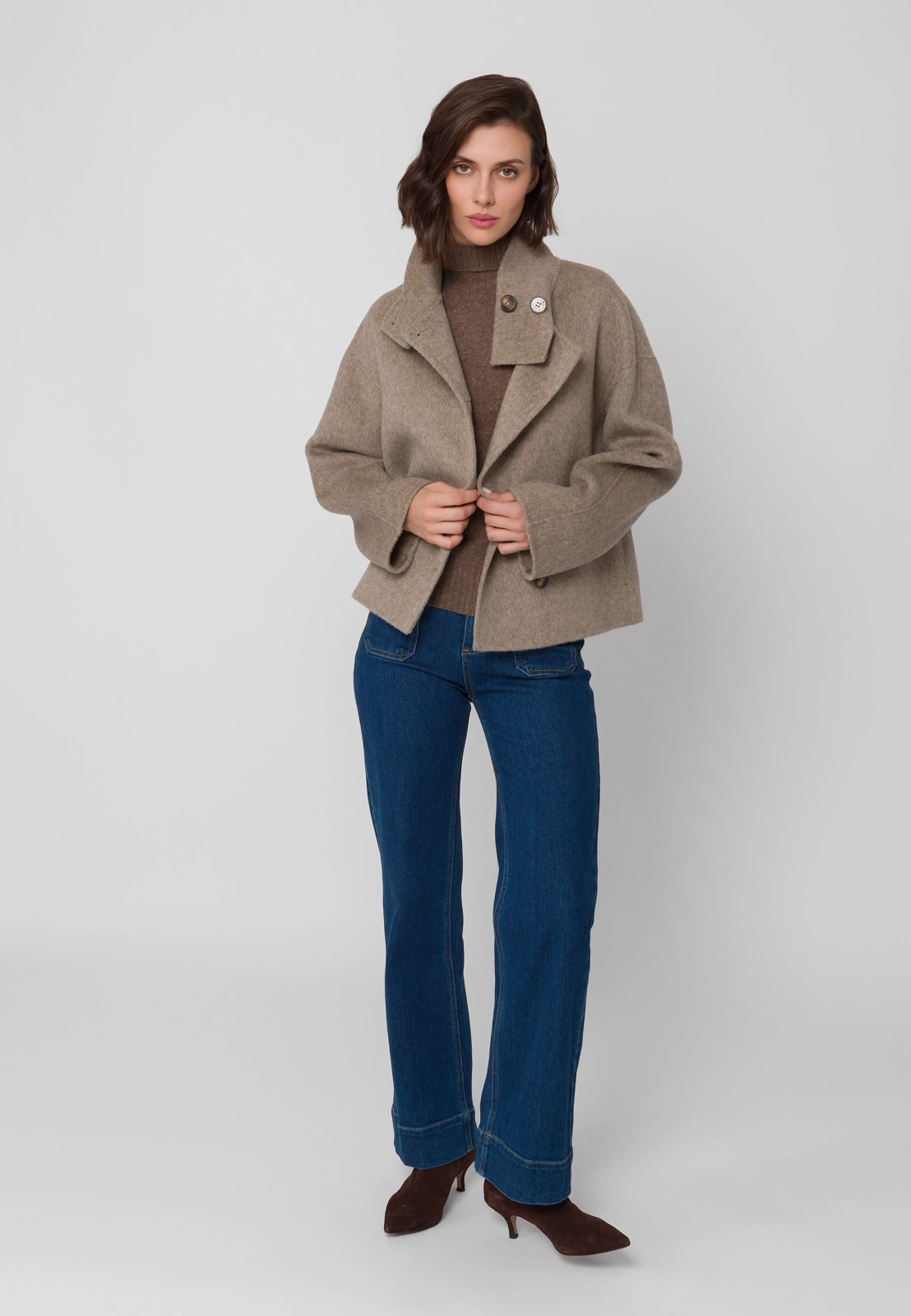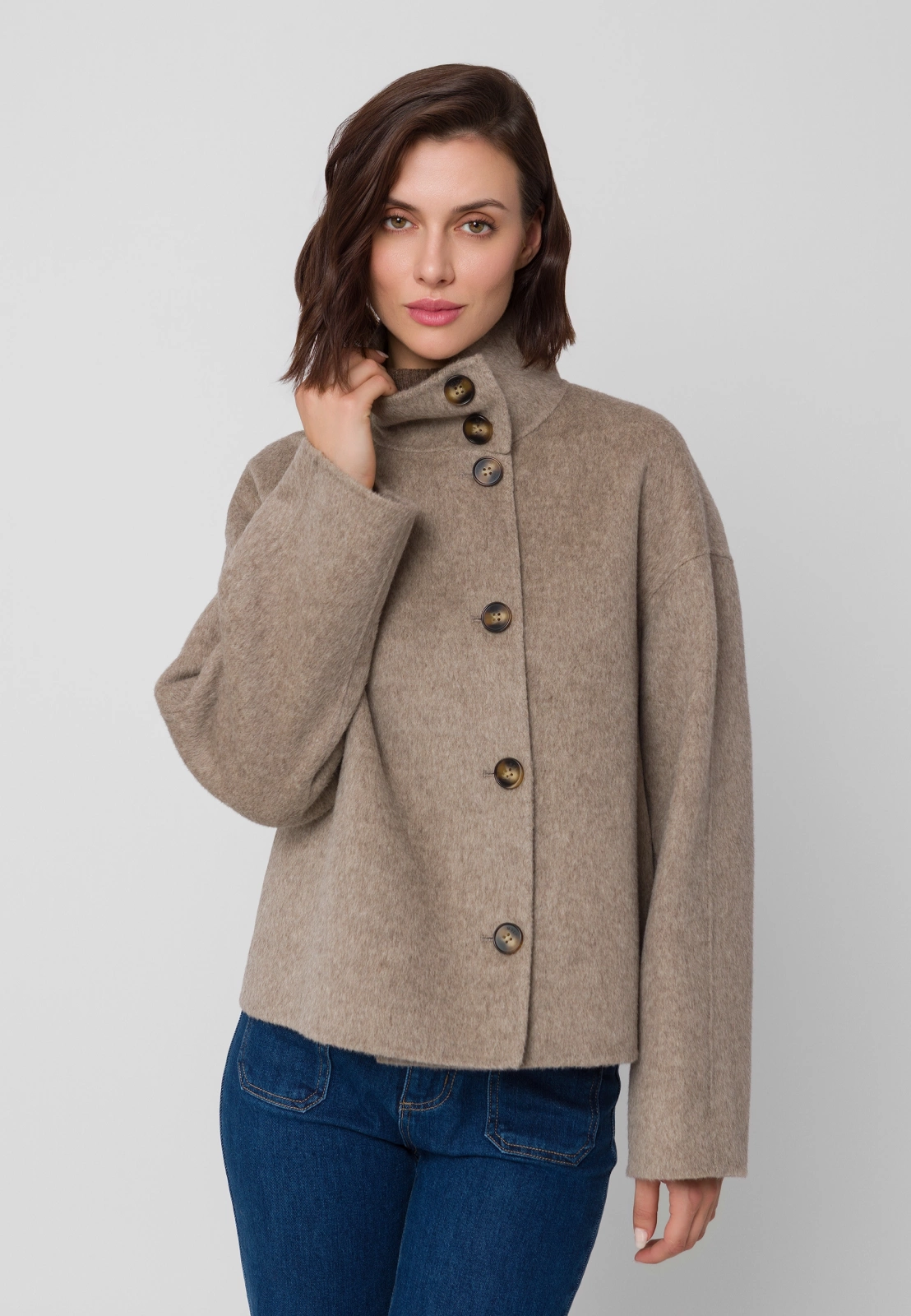 Beżowa kurtka typu double face wykonana w 100% z wełny to stylowa propozycja dla kobiet, które cenią połączenie klasyki i współczesnego designu. Krótki fason z wysokim kołnierzem i asymetrycznym zapięciem na guziki tworzy elegancki, nowoczesny look, idealny na chłodniejsze dni. Dzięki swojej strukturze kurtka pięknie układa się na sylwetce, a praktyczne kieszenie dodają jej funkcjonalności. Zapięta pod szyję skutecznie chroni przed wiatrem, a rozpięta prezentuje się nonszalancko, podkreślając ponadczasowy charakter modelu. Kurtka dostępna także w kolorze czarnym.