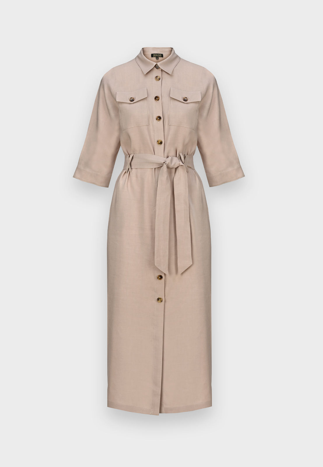 Beżowa sukienka szmizjerka została wykonana z wysokiej jakości dzianiny z wiskozy i lnu. Ma klasycznie elegancki odcień kawy z mlekiem, który pasuje do różnych typów urody. Jest zapinana na szylkretowe guziki, ma elegancki kołnierzyk i rękawy ¾. W talii znajduje się pasek, który podkreśla sylwetkę i jej proporcje. Sukienka ma długość midi, a na dole znajduje się efektowne i praktyczne rozcięcie.