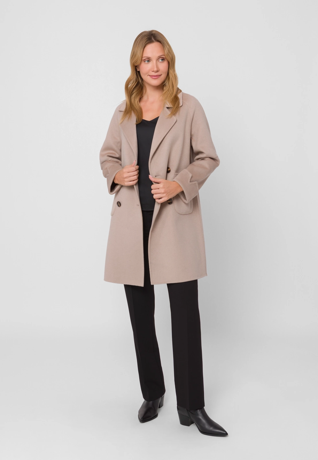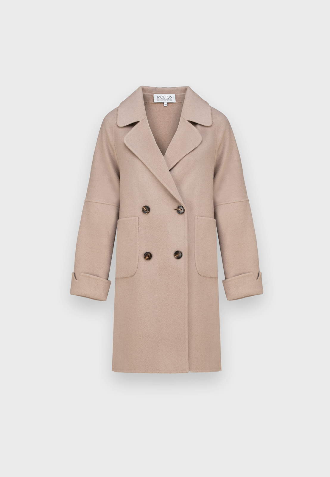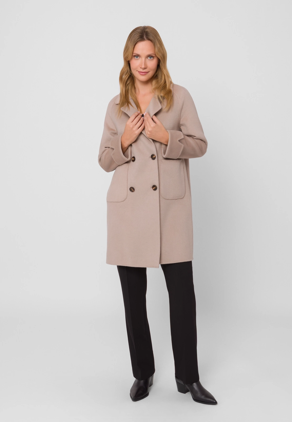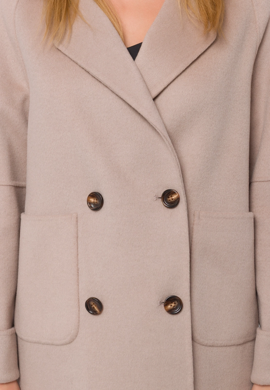 Krótki beżowy płaszcz to doskonałe uzupełnienie miejskich stylizacji na co dzień, zarówno tych w wersji biurowej, jak i zupełnie casualowej. Został wykonany w 100% z mięsistej wełny double face. Ma doskonale skrojony fason z dwurzędowym zapięciem na kontrastowe, ciemne guziki o szylkretowym wykończeniu, raglanowe rękawy, wywinięte mankiety i naszywane kieszenie. Dobrze leży na kobiecej sylwetce.