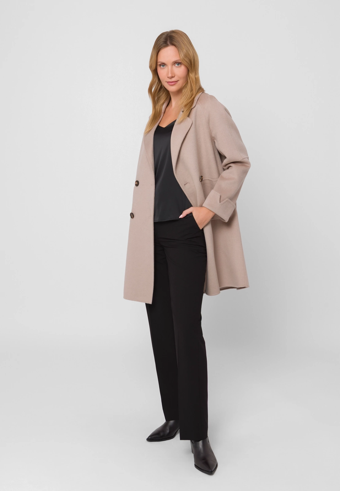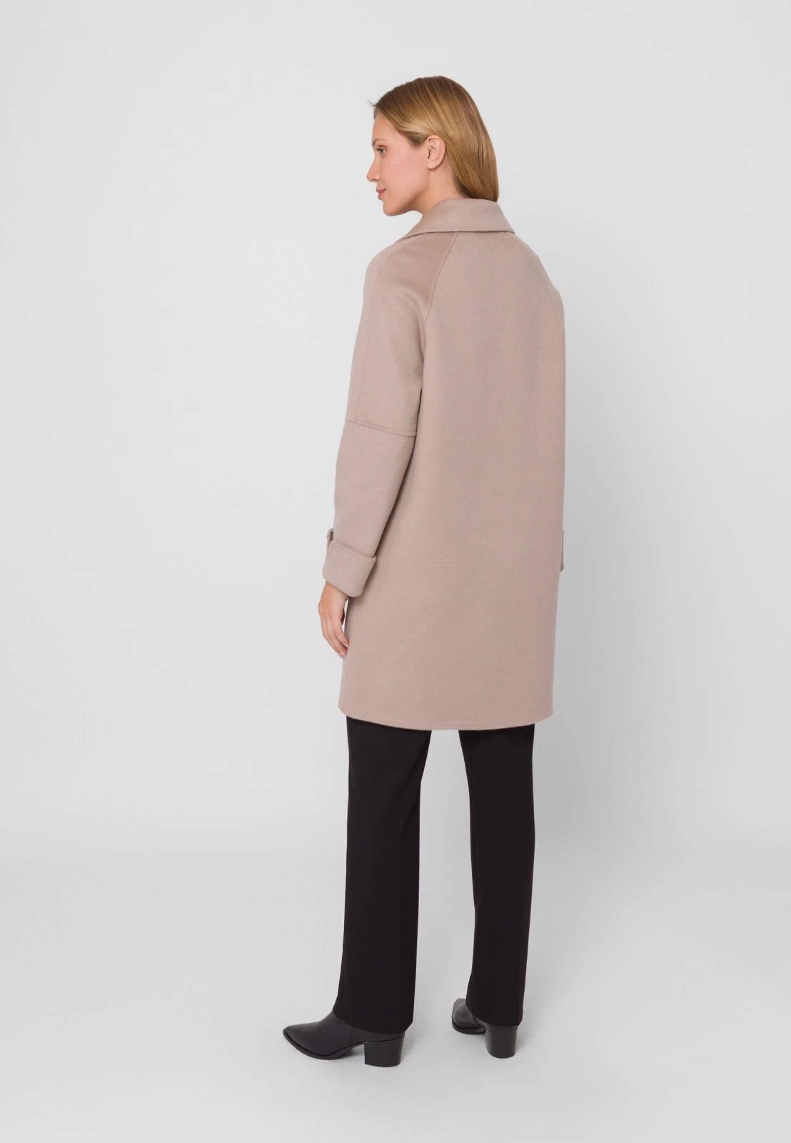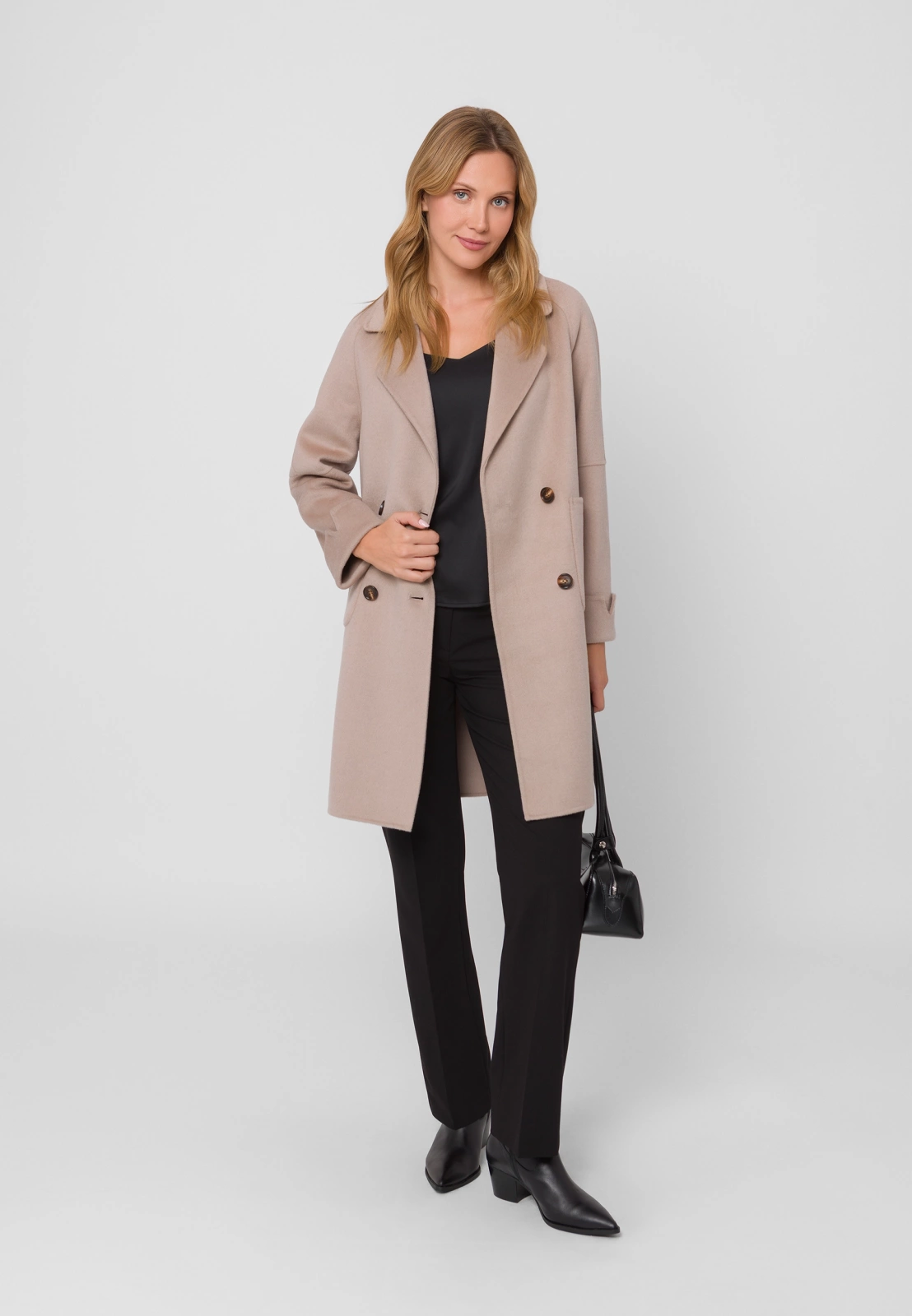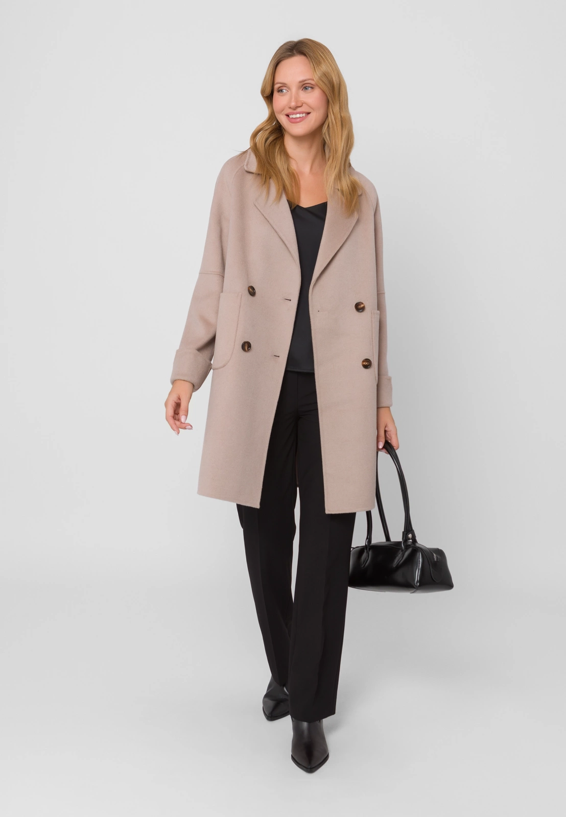 Krótki beżowy płaszcz to doskonałe uzupełnienie miejskich stylizacji na co dzień, zarówno tych w wersji biurowej, jak i zupełnie casualowej. Został wykonany w 100% z mięsistej wełny double face. Ma doskonale skrojony fason z dwurzędowym zapięciem na kontrastowe, ciemne guziki o szylkretowym wykończeniu, raglanowe rękawy, wywinięte mankiety i naszywane kieszenie. Dobrze leży na kobiecej sylwetce.