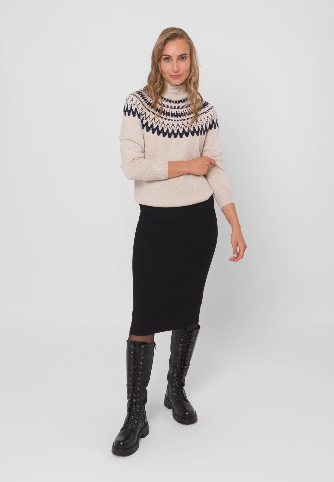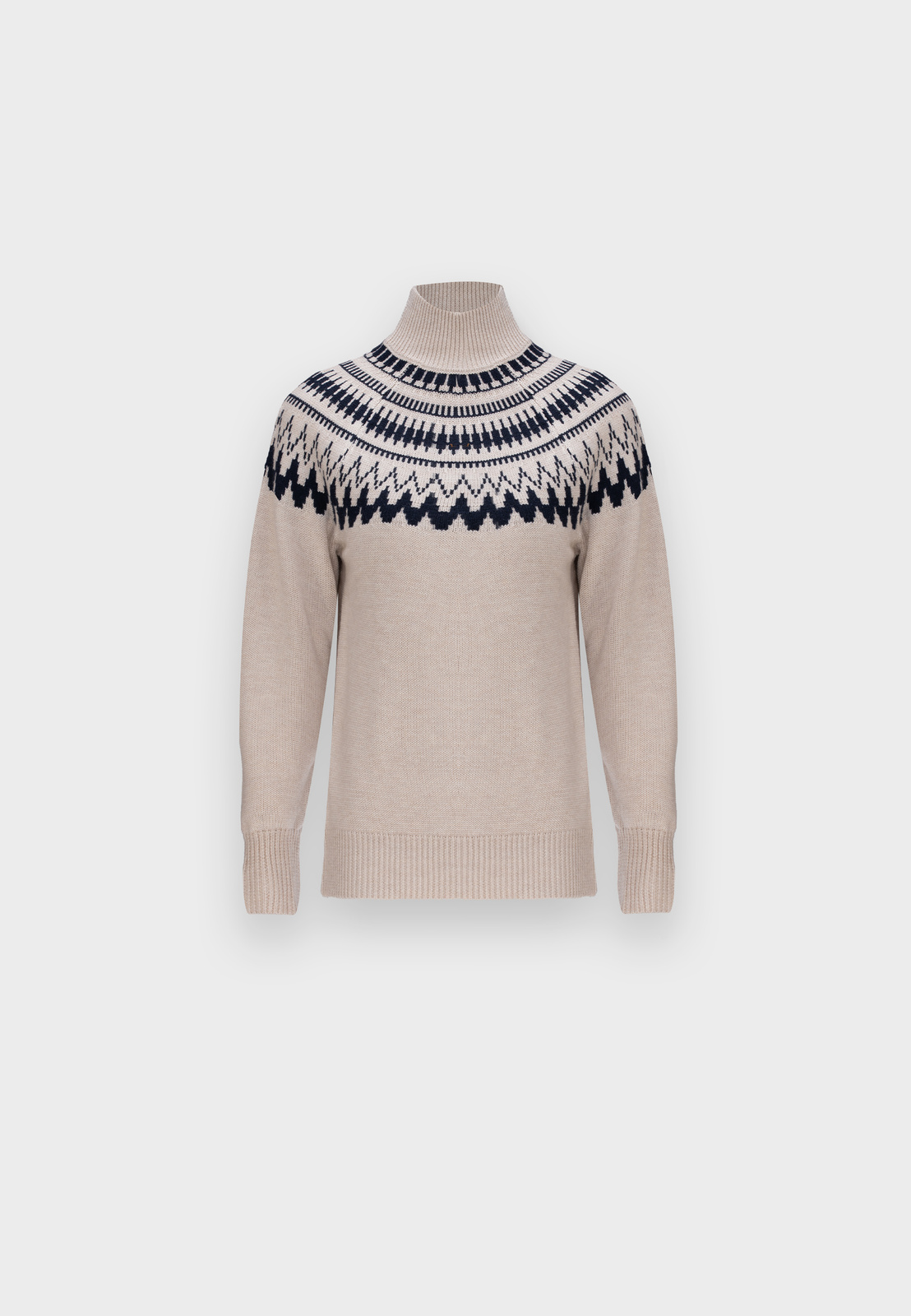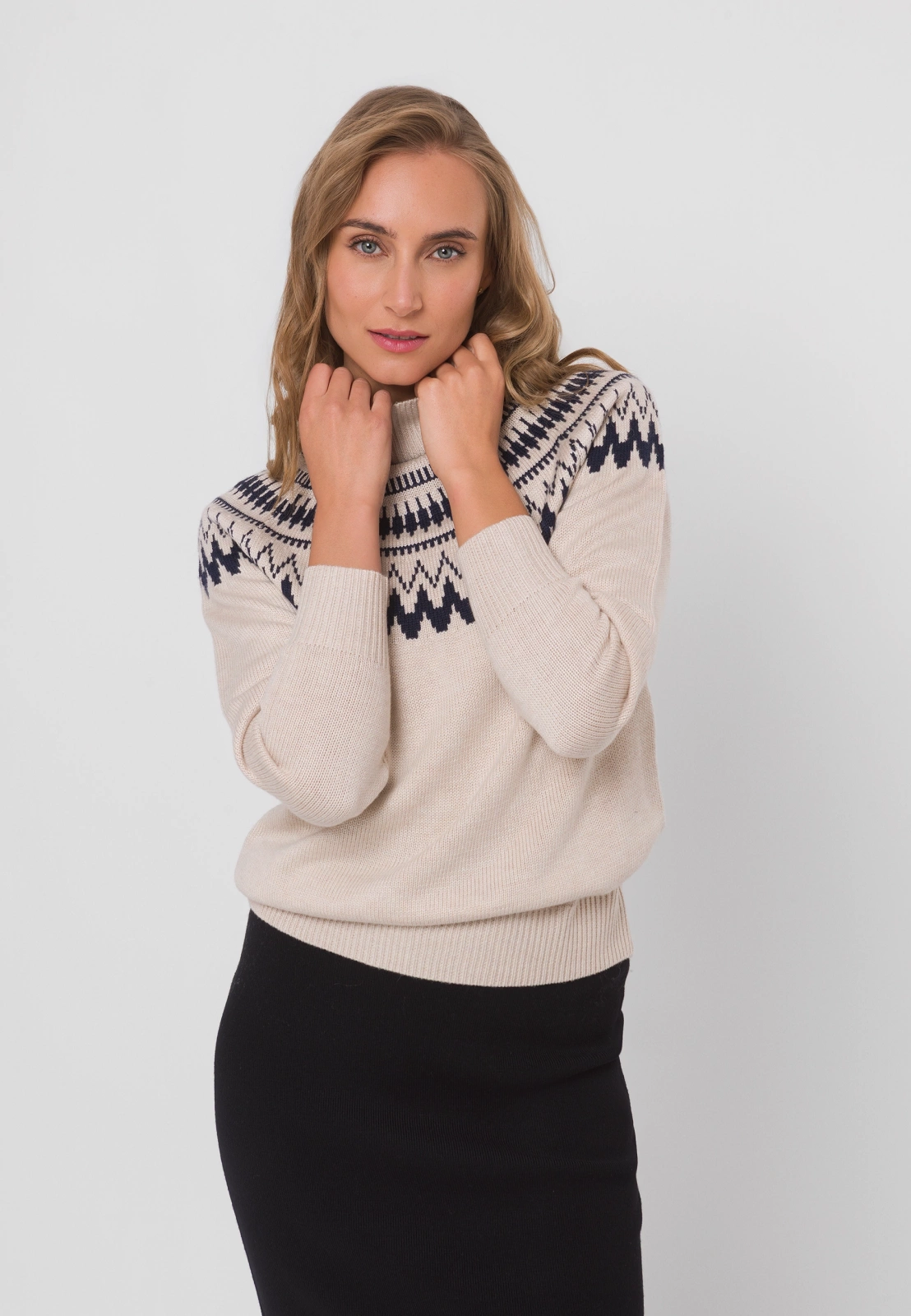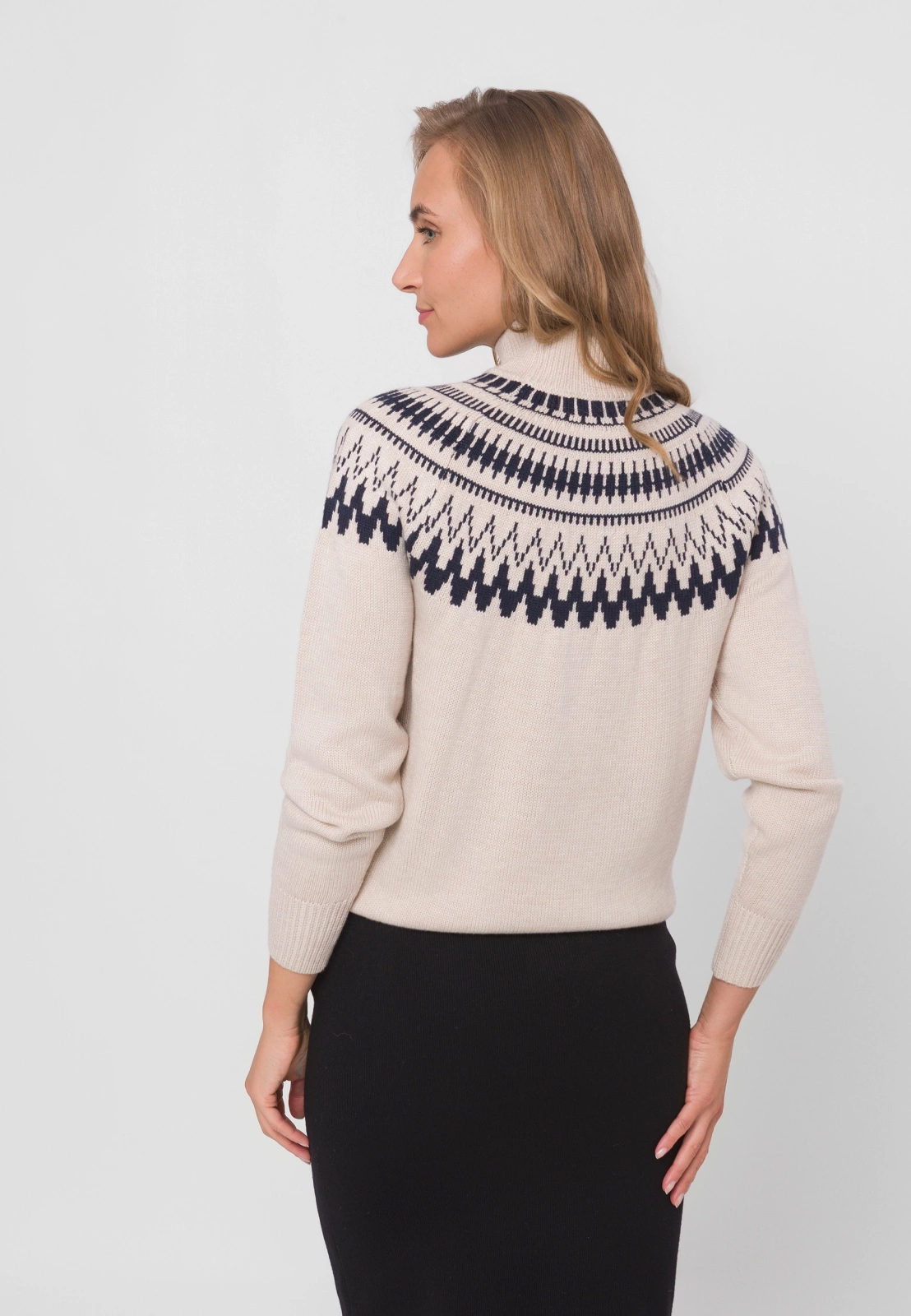 Ecru sweter damski w norweski granatowy wzór to idealny wybór na chłodne dni. Półgolf doskonale chroni przed zimnem, a dodatek wełny sprawia, że model jest wyjątkowo ciepły, miękki i przyjemny w dotyku. Klasyczny krój w połączeniu z ponadczasowym wzorem tworzy stylowy i komfortowy element zimowej garderoby. Sweter świetnie sprawdzi się zarówno w codziennych stylizacjach z jeansami, jak i w bardziej eleganckim wydaniu ze spódnicą. Postaw na jakość i ciepło — wybierz ecru sweter w norweskie wzory z kolekcji MOLTON. Model dostępny jest także w wersji bordowej.
