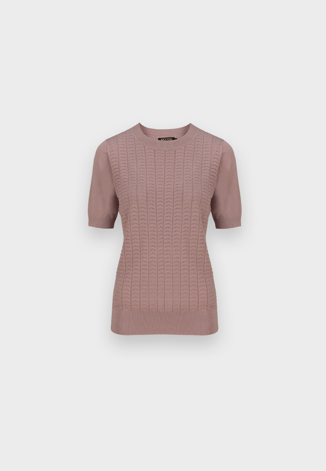 Bluzka z krótkim rękawem została wykonana z miękkiej dzianiny o ażurowym splocie. Materiał bazuje na wiskozie i jest niezwykle miękki oraz przewiewny. Dopasowany krój z okrągłym dekoltem podkreśla sylwetkę i dobrze się na niej układa. Średni, kawowy odcień brązu pięknie prezentuje się przy twarzy i pasuje do wielu barw. Ten model bluzki jest dostępny także w kolorze granatowym i écru.