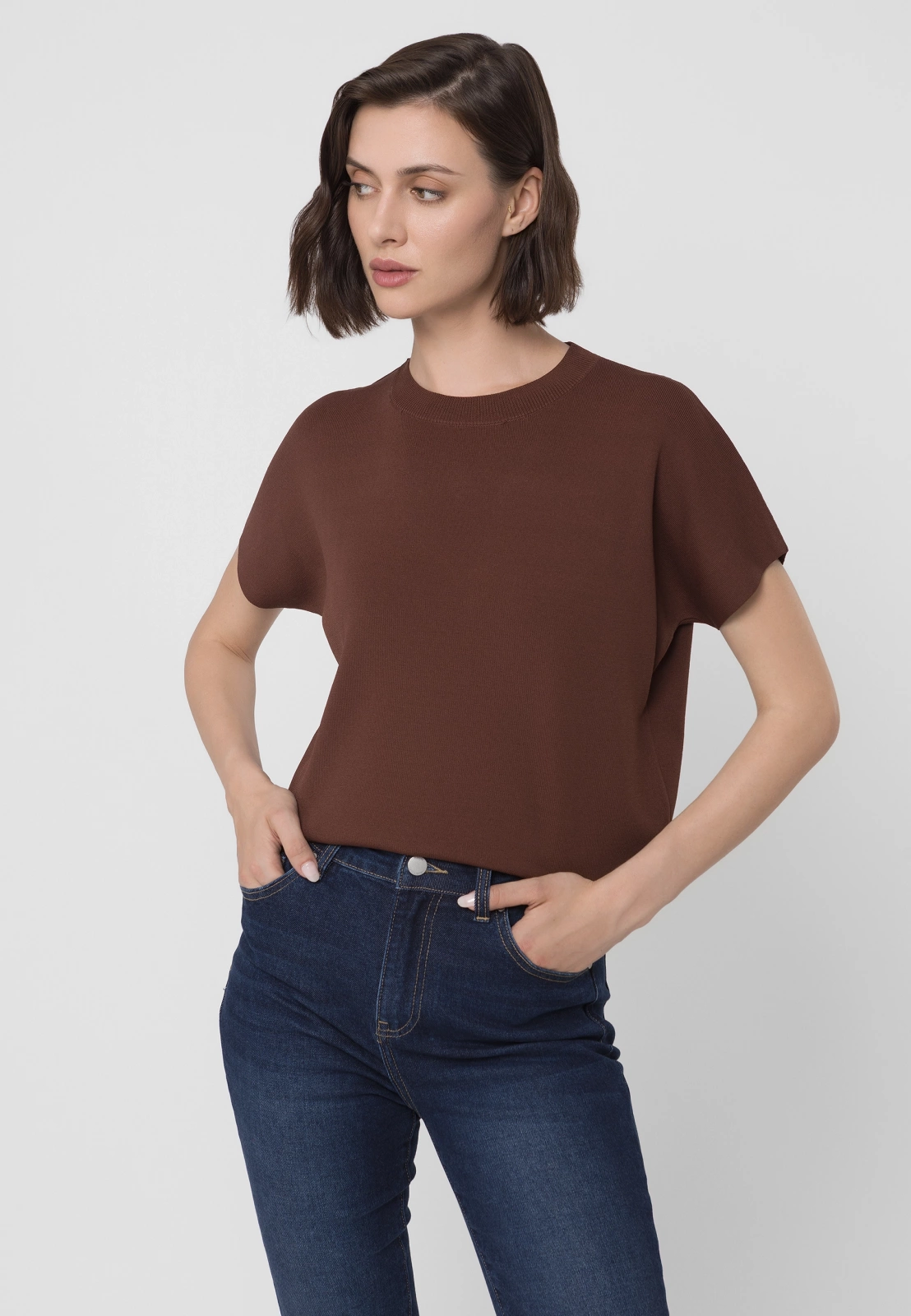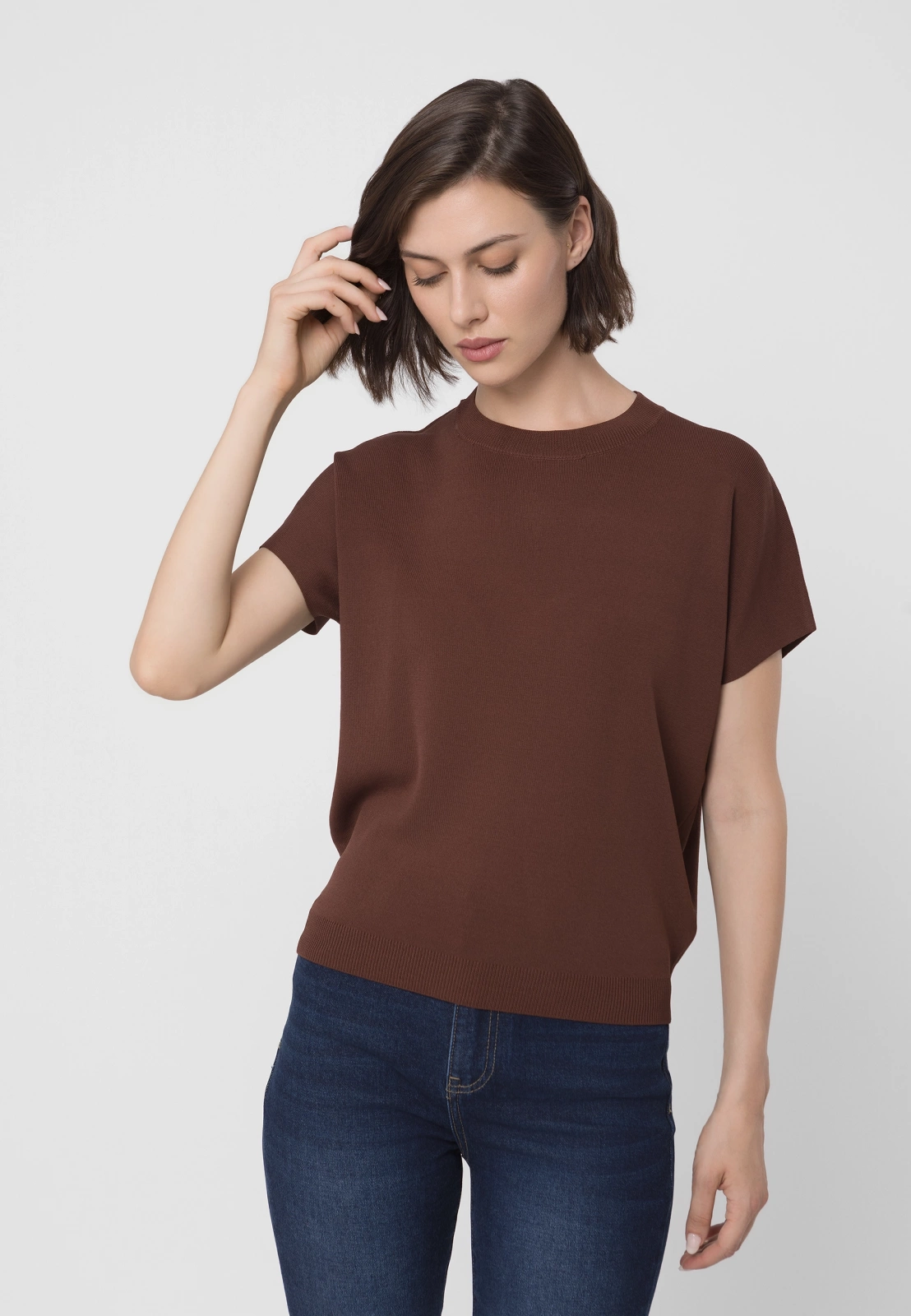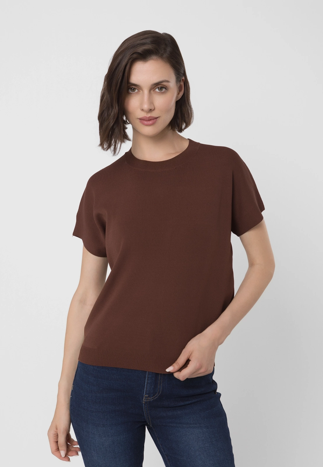 Brązowa bluzka dzianinowa wykonana z miękkiej wiskozy z krótkim rękawem i ze ściągaczem, który nadaje lekko sportowego charakteru bluzki. Luźny, wygodny fason sprawia, że bluzka świetnie sprawdzi się zarówno pod marynarkę, sweter czy bluzę, otwierając wiele możliwości codziennych stylizacji. Dostępna w szerokiej gamie kolorów, stanowi bazowy element garderoby, który łatwo dopasować do różnych zestawów – od casualowych po bardziej eleganckie looki.