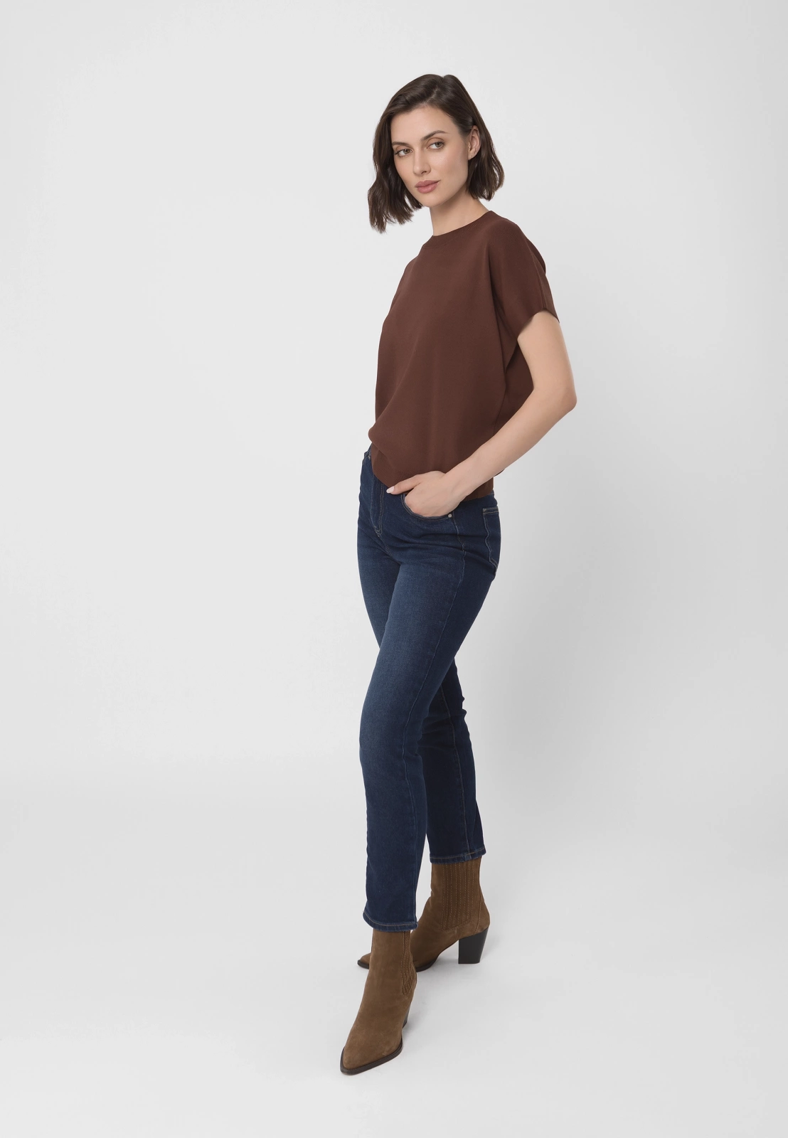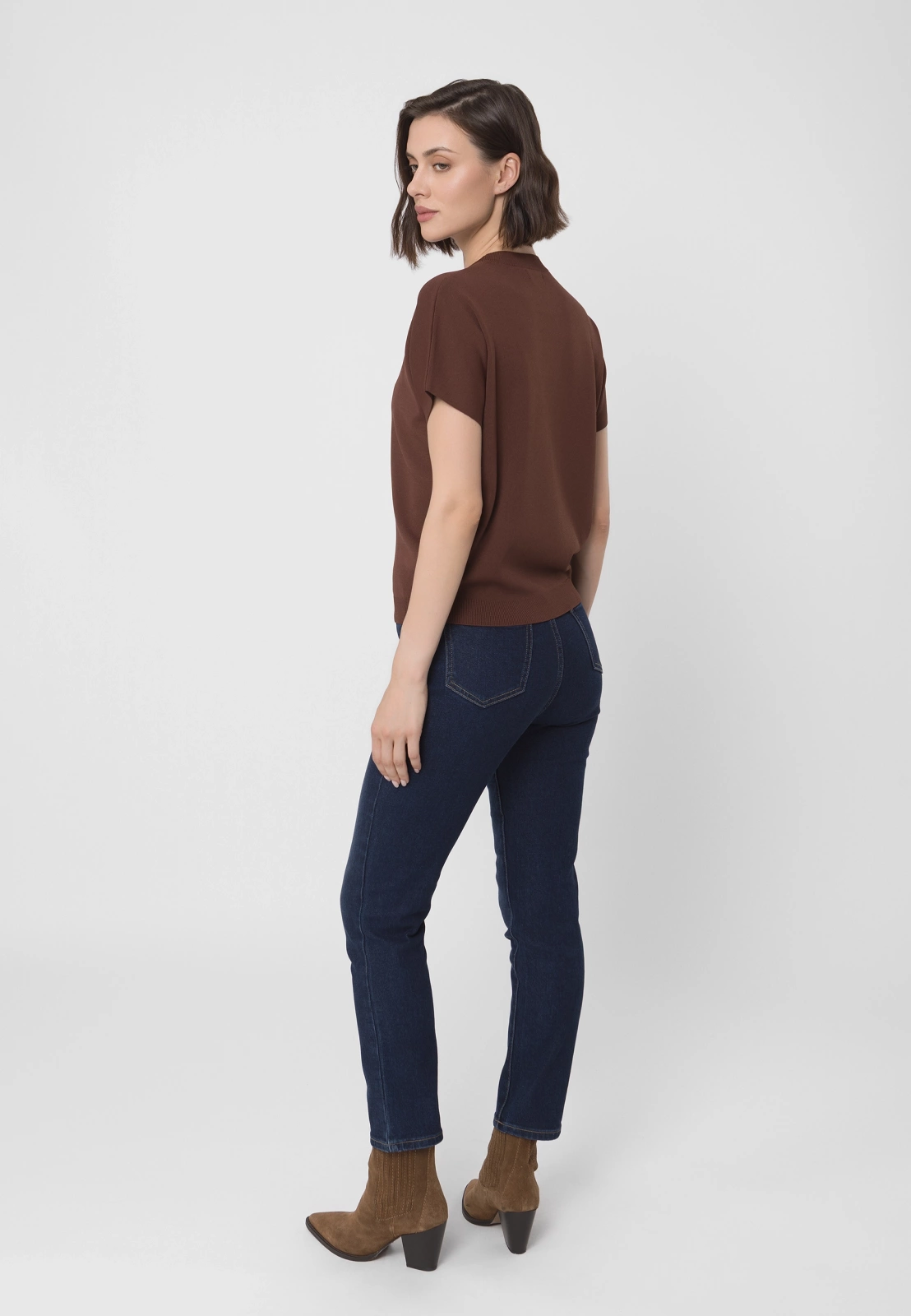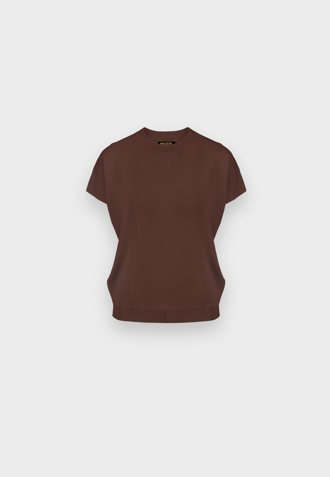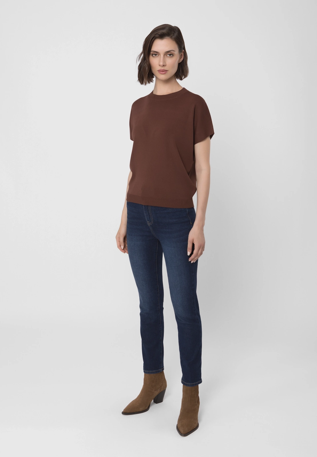 Brązowa bluzka dzianinowa wykonana z miękkiej wiskozy z krótkim rękawem i ze ściągaczem, który nadaje lekko sportowego charakteru bluzki. Luźny, wygodny fason sprawia, że bluzka świetnie sprawdzi się zarówno pod marynarkę, sweter czy bluzę, otwierając wiele możliwości codziennych stylizacji. Dostępna w szerokiej gamie kolorów, stanowi bazowy element garderoby, który łatwo dopasować do różnych zestawów – od casualowych po bardziej eleganckie looki.