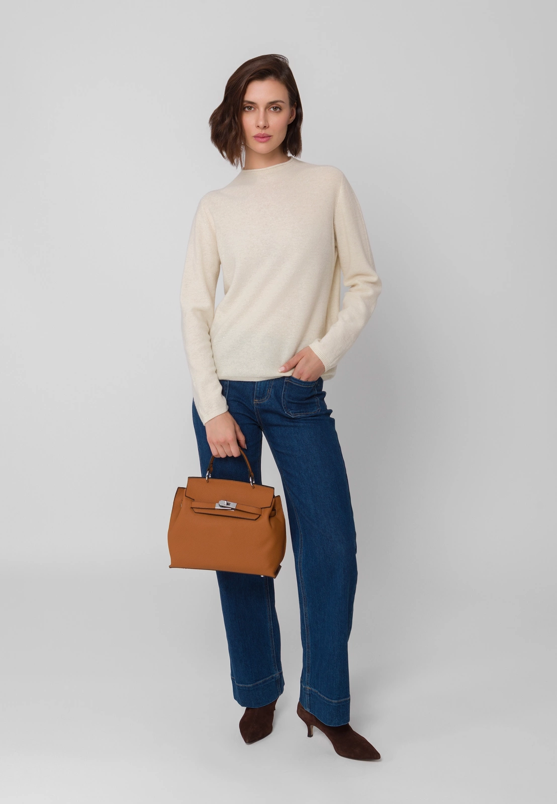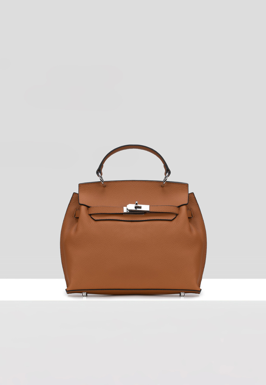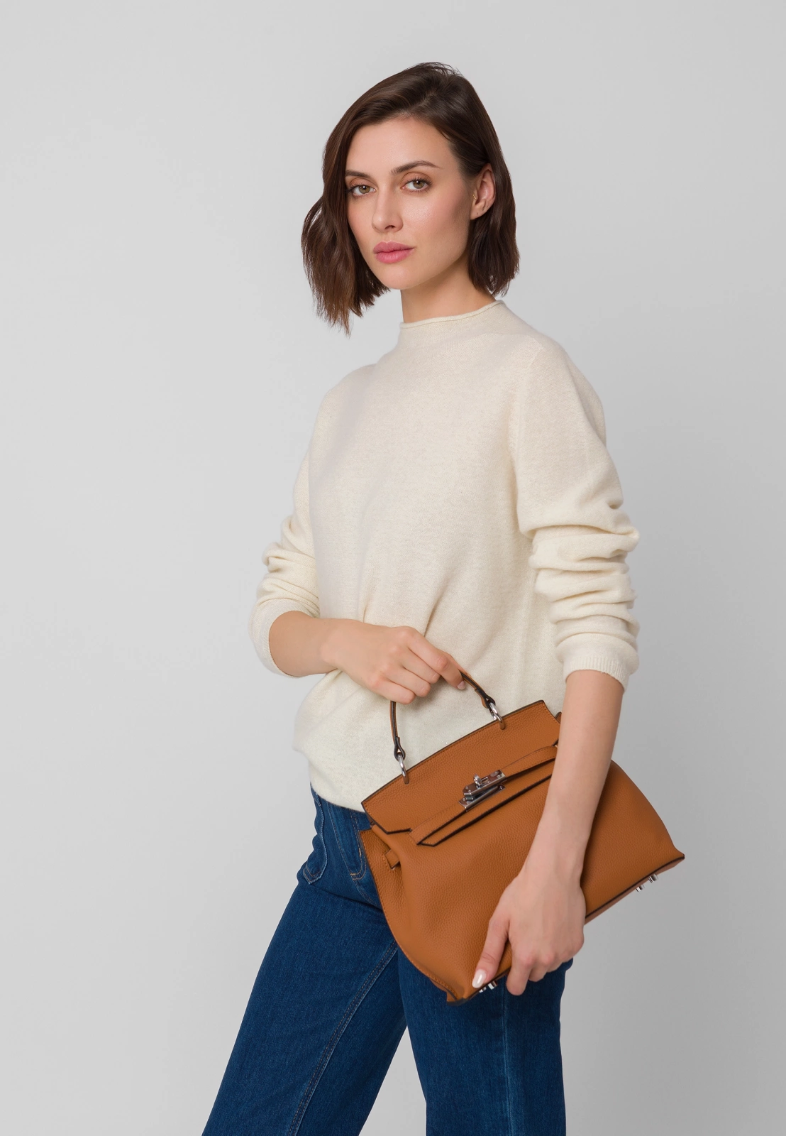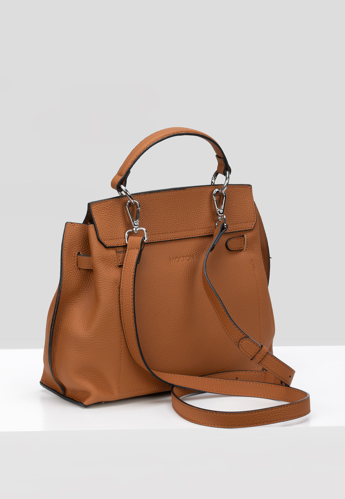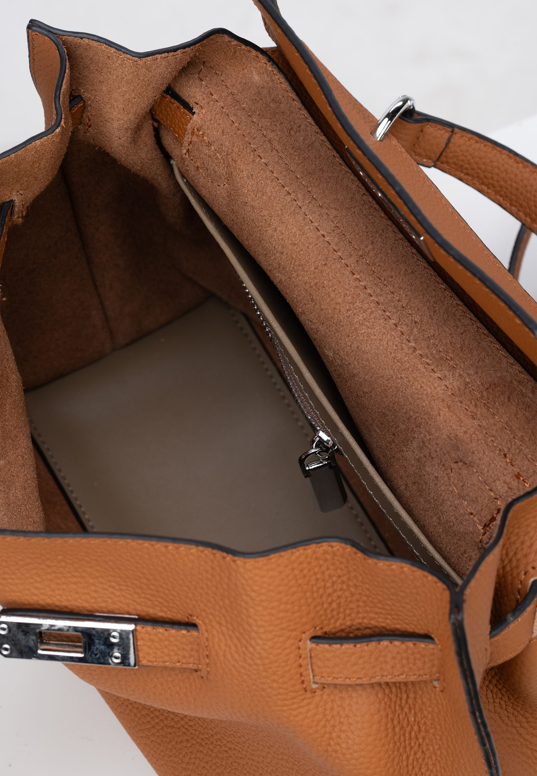 Praktyczna torebka kuferek w camelowym odcieniu, wykonana z naturalnej skóry o delikatnej fakturze. Torebka posiada klasyczne ucho do ręki oraz odpinany, dłuższy pasek, który pozwala nosić ją na ramieniu. Jej oryginalne zapięcie nadaje charakteru i sprawia, że torebka wyróżnia się wśród innych modeli. W środku znajduje się jedna duża kieszeń oraz mniejsza na suwak, idealna na drobne przedmioty. Model nie mieści formatu A4, co czyni go kompaktowym, a jednocześnie bardzo praktycznym dodatkiem do codziennych stylizacji. Kuferek dostępny jest również w klasycznej czerni.