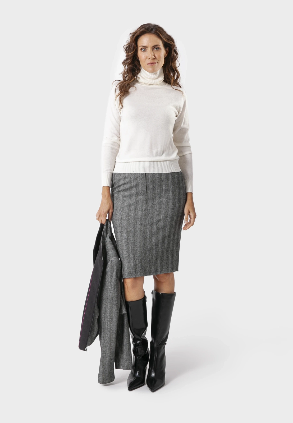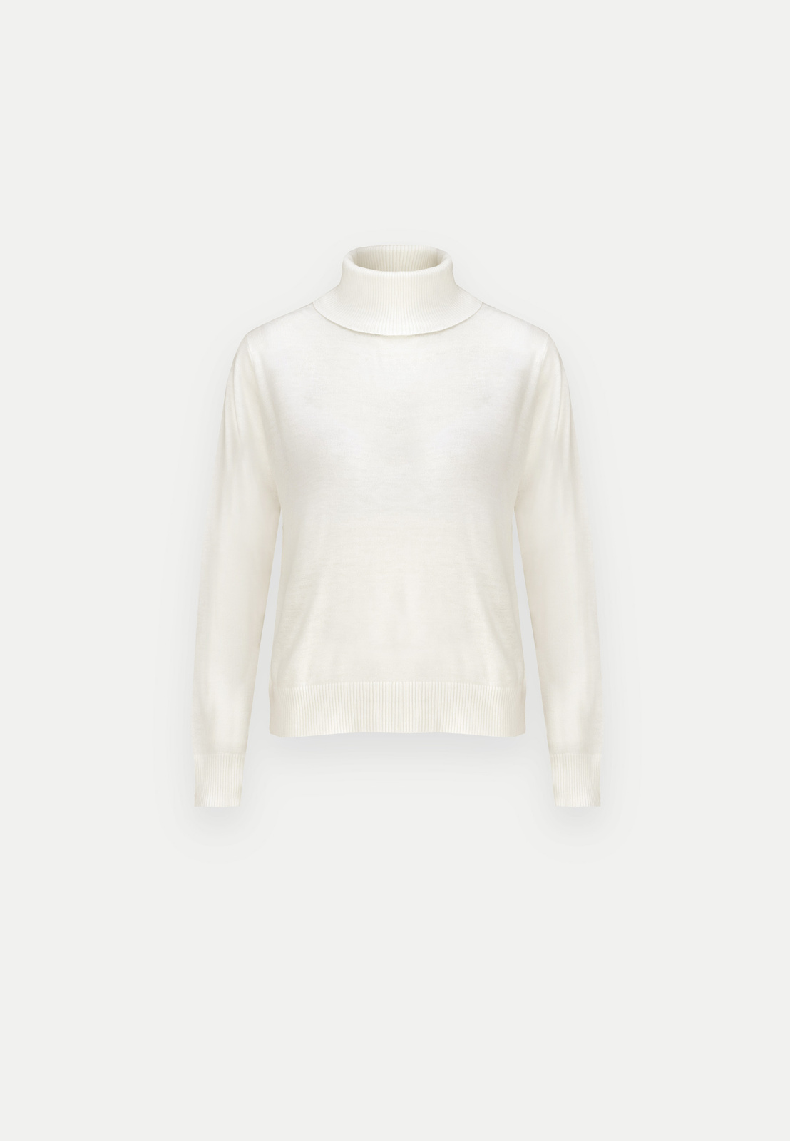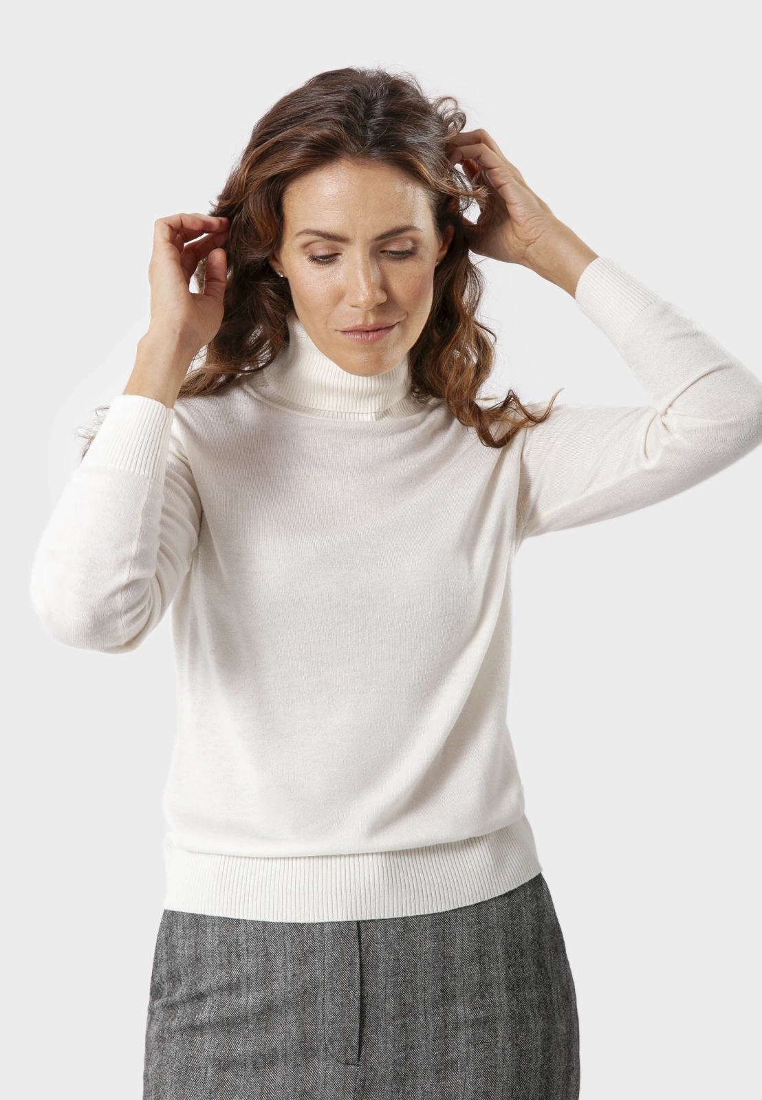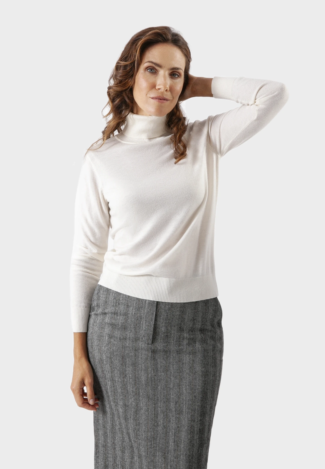 Klasyczny cienki golf w kolorze ecru, wykonany z miękkiej mieszanki z dodatkiem wełny, która zapewnia komfort i elegancki wygląd. Doskonale dopasowuje się do sylwetki, stanowiąc bazę wielu stylizacji – zarówno casualowych, jak i bardziej formalnych. Idealny pod marynarkę, płaszcz czy solo do spódnicy lub spodni. Dostępny również w wersji w kolorze bordo, czarnym i camelowym.