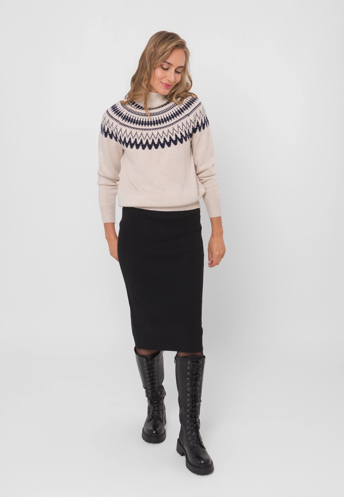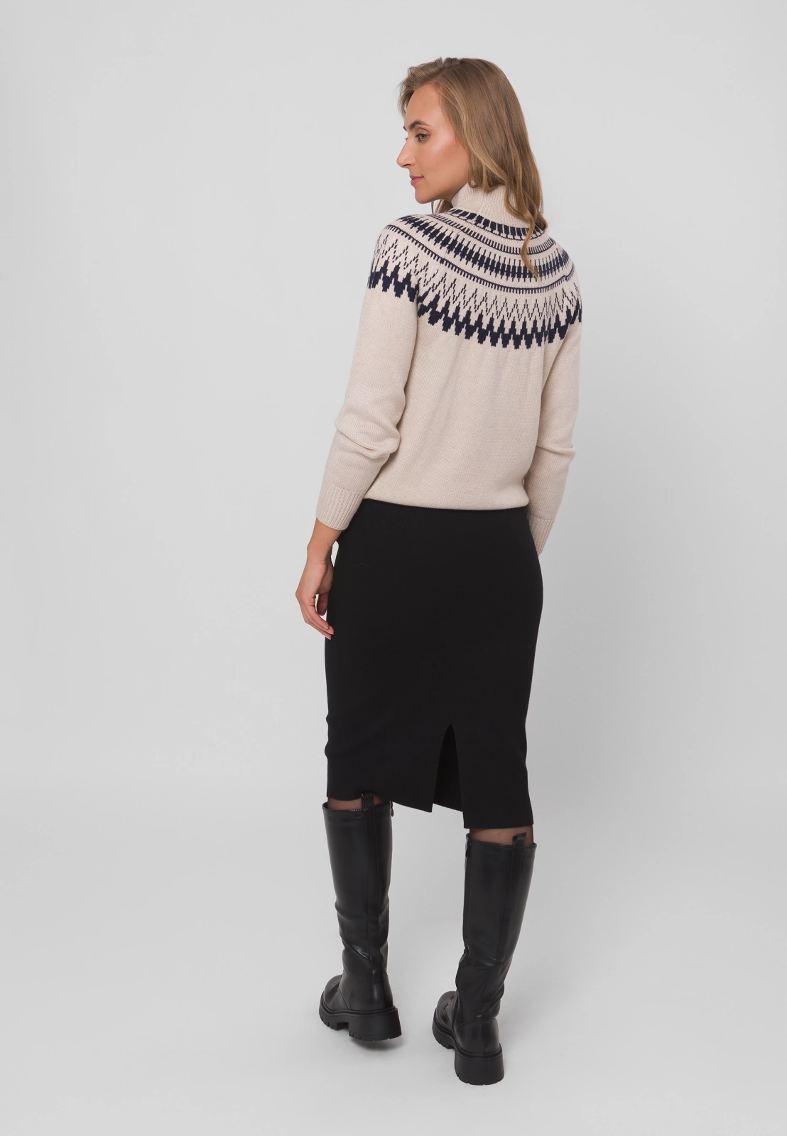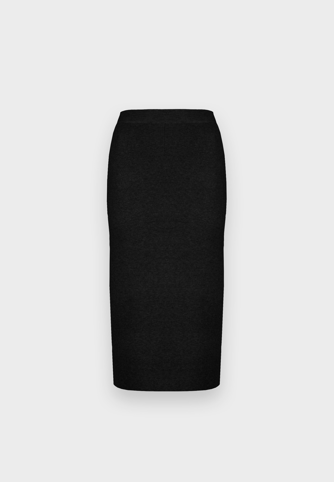 Czarna spódnica ołówkowa za kolano wykonana z miękkiej dzianiny z domieszką wełny łączy komfort noszenia z eleganckim stylem. Elastyczna gumka w pasie zapewnia idealne dopasowanie i swobodę ruchów, a dopasowany fason podkreśla sylwetkę, tworząc ponadczasowe, kobiece stylizacje. Doskonała zarówno do pracy, jak i do codziennych, miejskich outfitów.