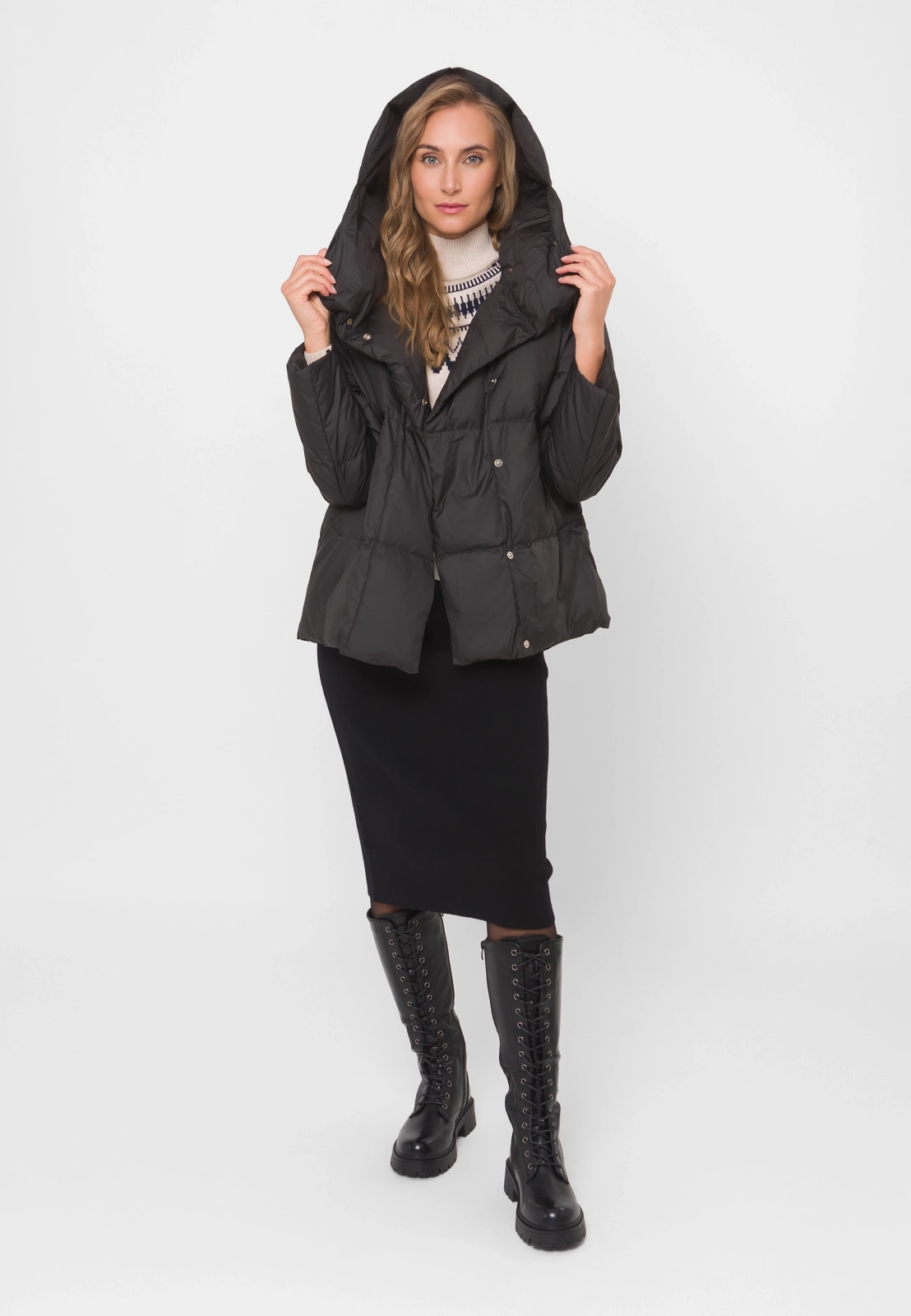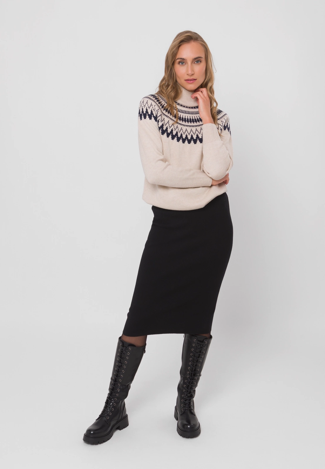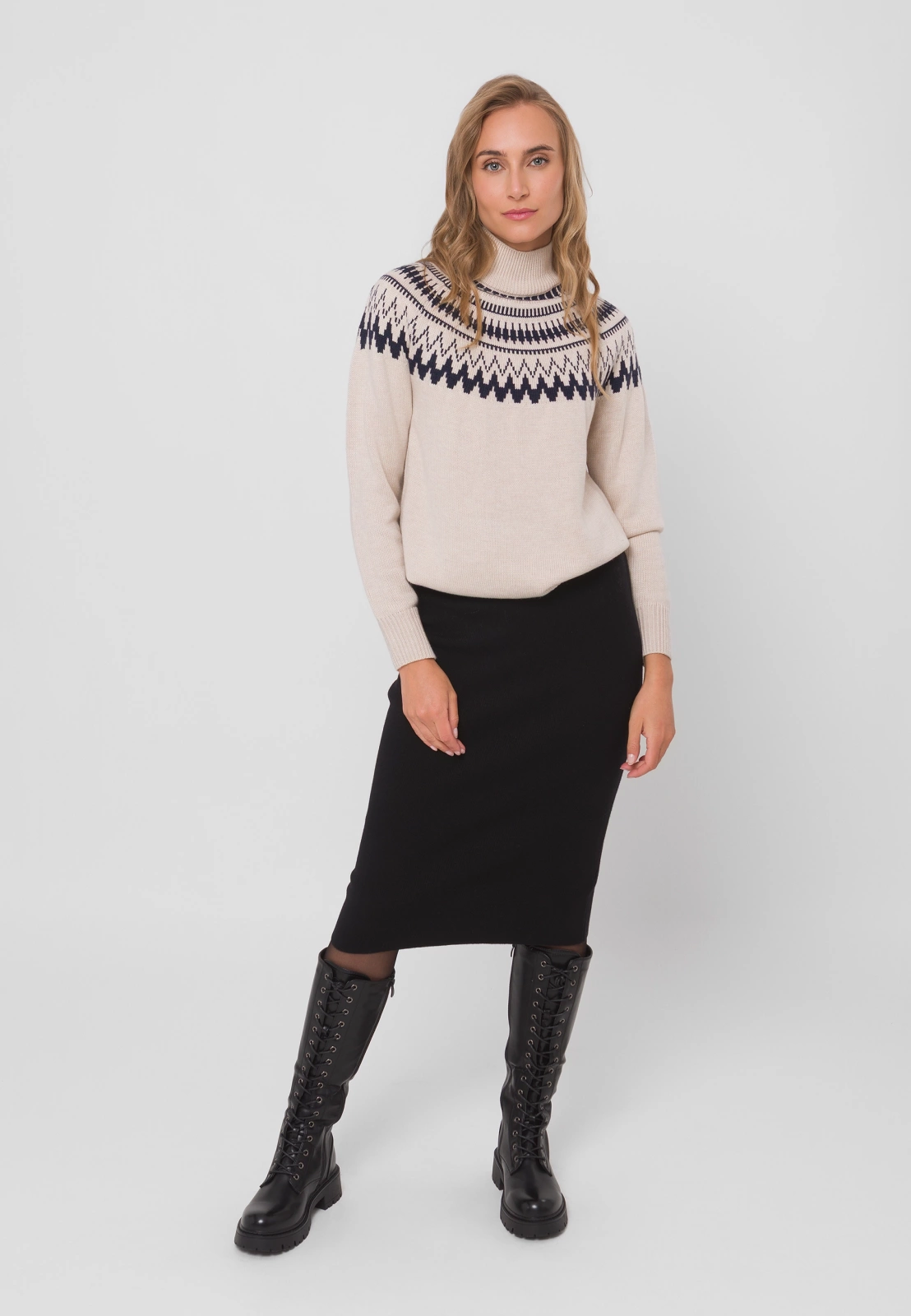 Czarna spódnica ołówkowa za kolano wykonana z miękkiej dzianiny z domieszką wełny łączy komfort noszenia z eleganckim stylem. Elastyczna gumka w pasie zapewnia idealne dopasowanie i swobodę ruchów, a dopasowany fason podkreśla sylwetkę, tworząc ponadczasowe, kobiece stylizacje. Doskonała zarówno do pracy, jak i do codziennych, miejskich outfitów.