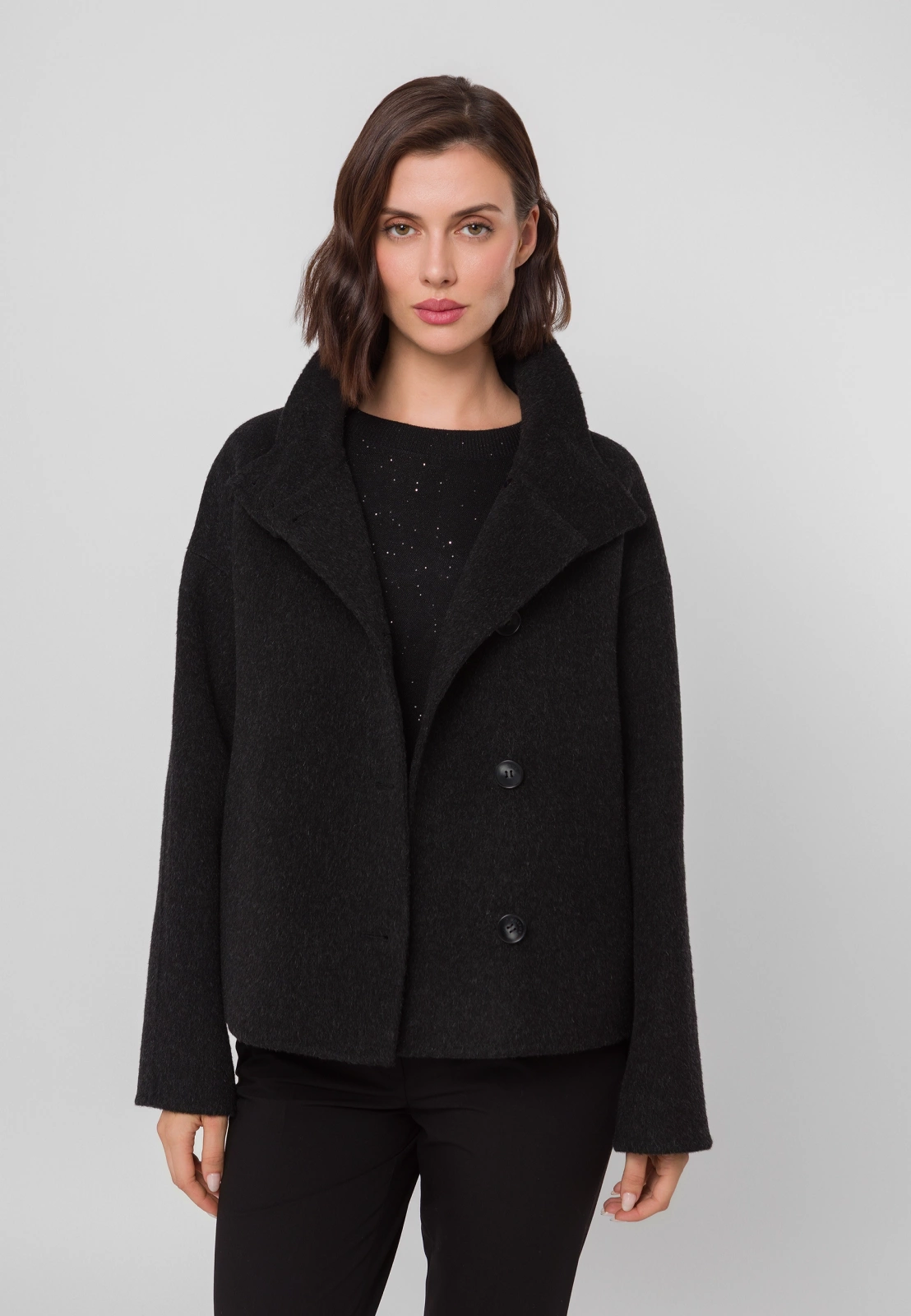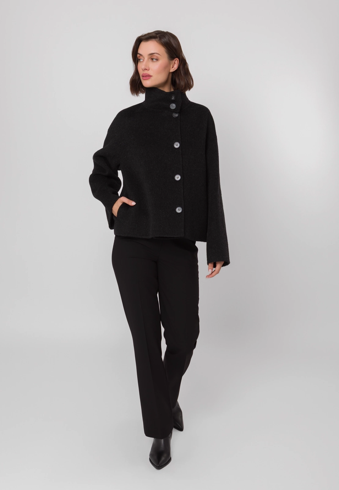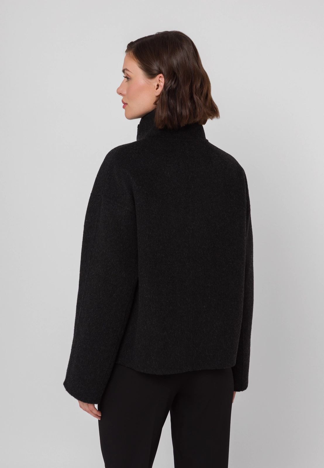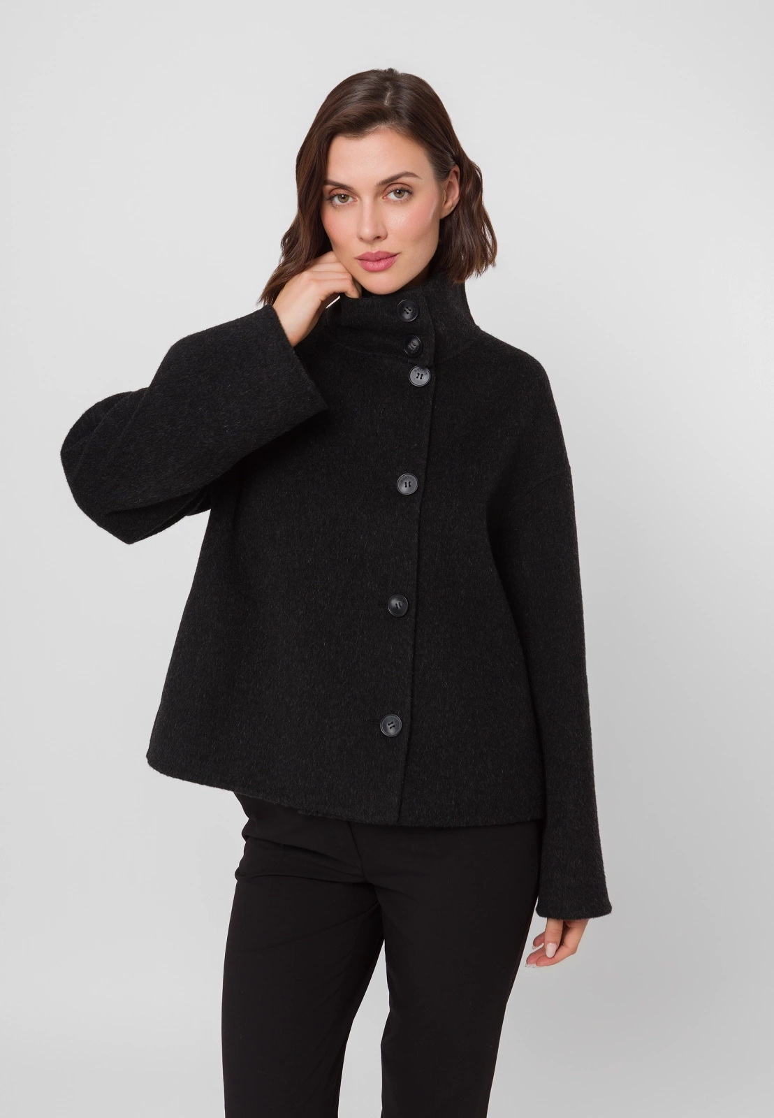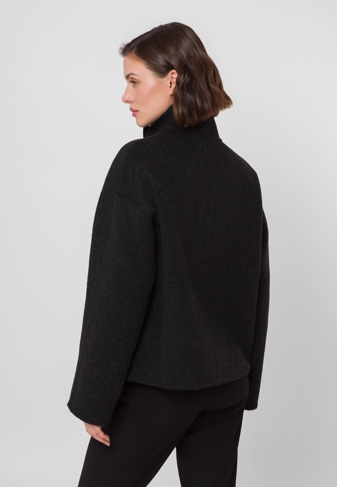 Czarna kurtka typu double face wykonana w 100% z wełny to wyjątkowe połączenie elegancji i nowoczesnego designu. Krótszy fason i dopracowany krój nadają sylwetce lekkości, a wysoki kołnierz i asymetryczne zapięcie na guziki dodają całości modowego charakteru. Kurtka posiada praktyczne kieszenie i prezentuje się doskonale zarówno zapięta pod samą szyję — chroniąc skutecznie przed wiatrem, jak i rozpięta, w nonszalnckiej formie. Idealna na chłodniejsze dni, stanowi stylowy wybór dla kobiet ceniących minimalizm i klasę. Model dostępny jest także w eleganckim kolorze beżowym.