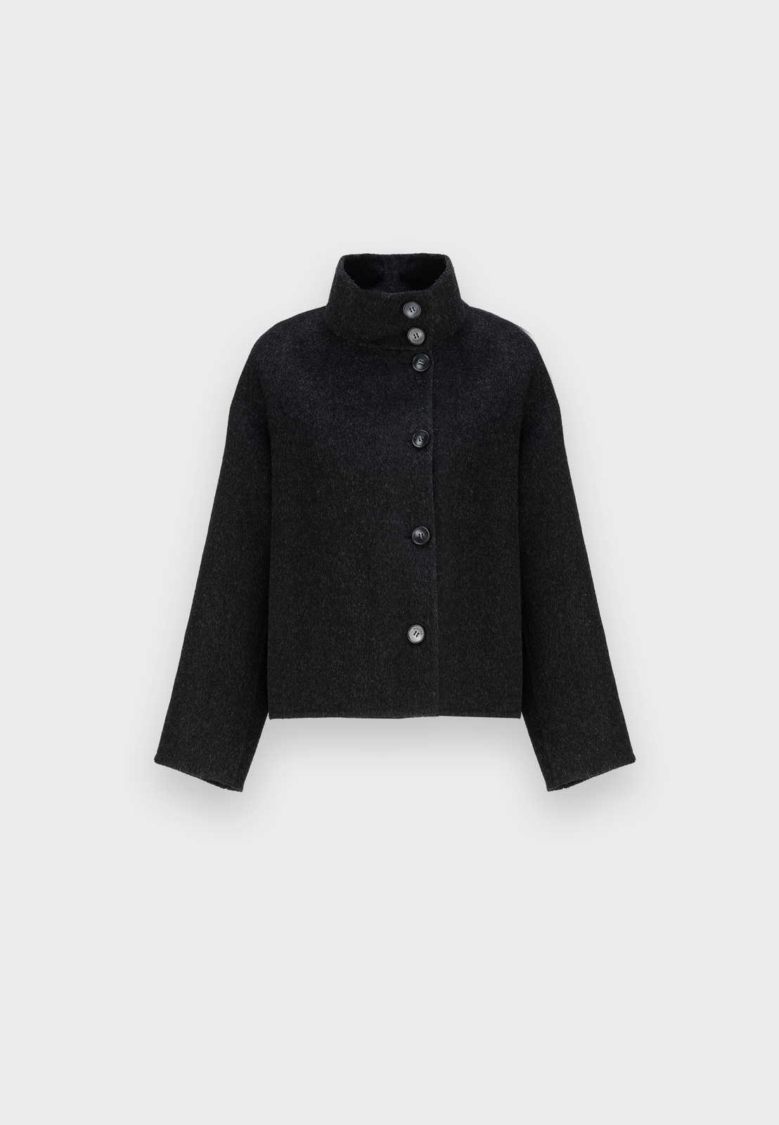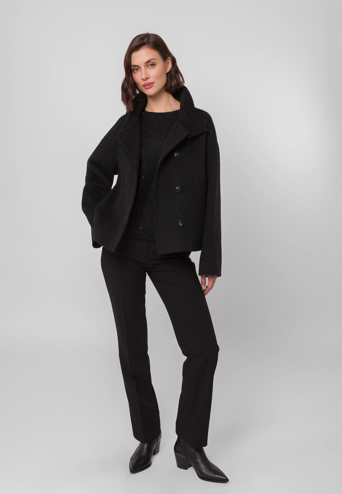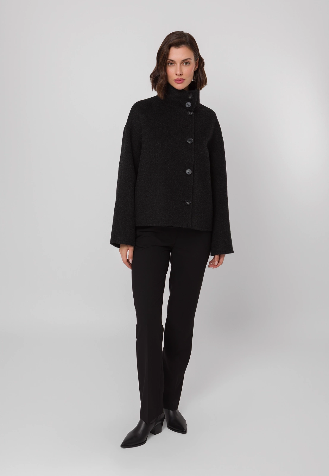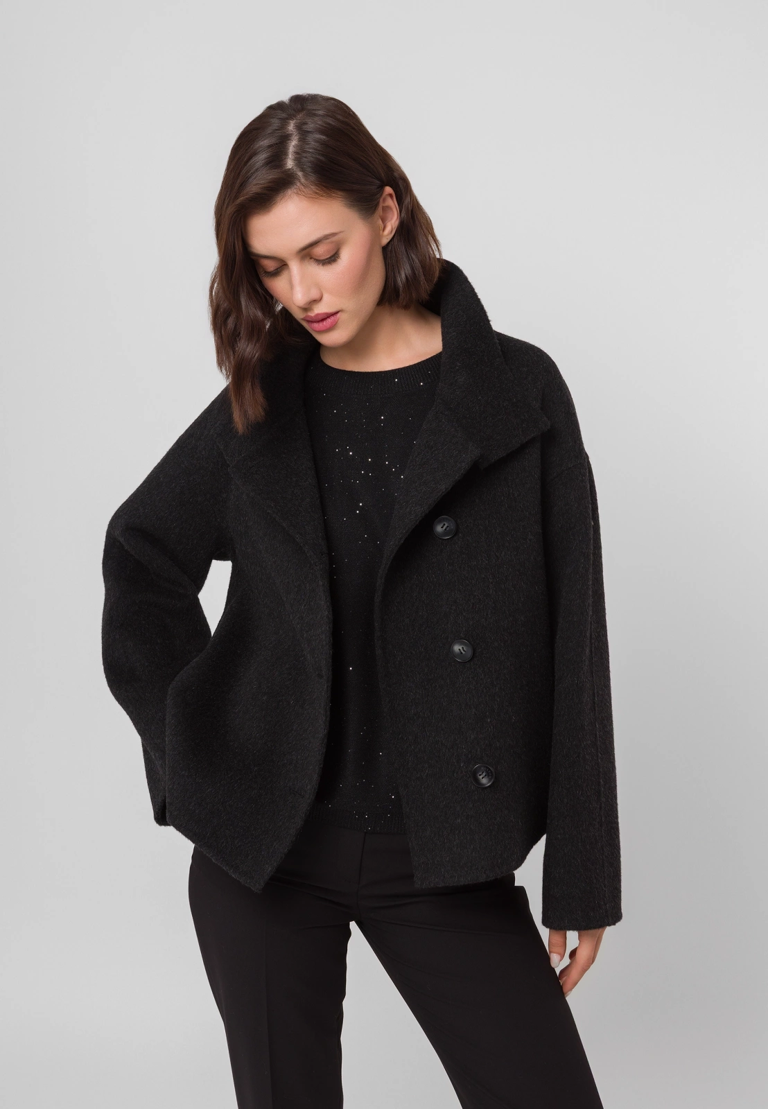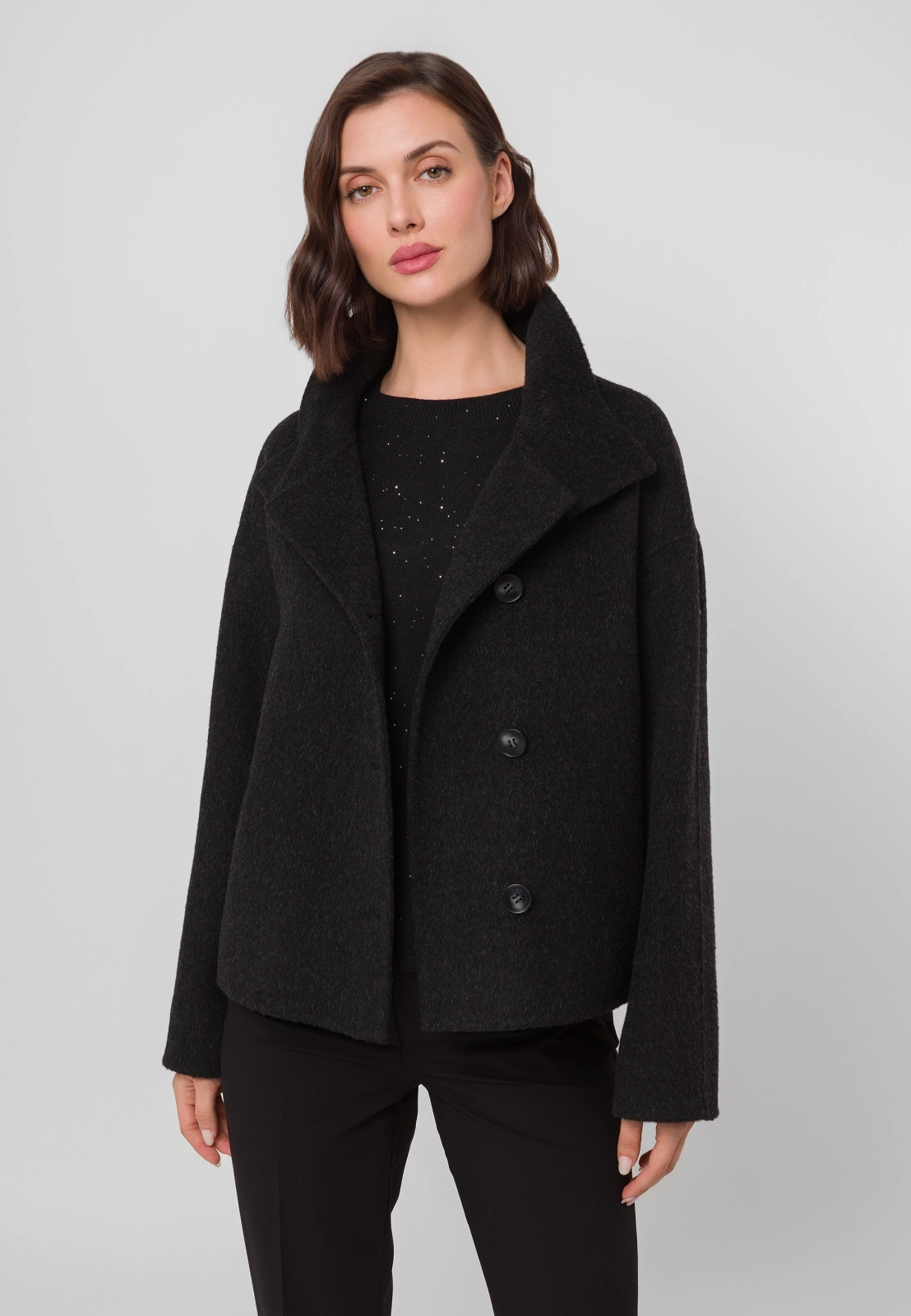 Czarna kurtka typu double face wykonana w 100% z wełny to wyjątkowe połączenie elegancji i nowoczesnego designu. Krótszy fason i dopracowany krój nadają sylwetce lekkości, a wysoki kołnierz i asymetryczne zapięcie na guziki dodają całości modowego charakteru. Kurtka posiada praktyczne kieszenie i prezentuje się doskonale zarówno zapięta pod samą szyję — chroniąc skutecznie przed wiatrem, jak i rozpięta, w nonszalnckiej formie. Idealna na chłodniejsze dni, stanowi stylowy wybór dla kobiet ceniących minimalizm i klasę. Model dostępny jest także w eleganckim kolorze beżowym.