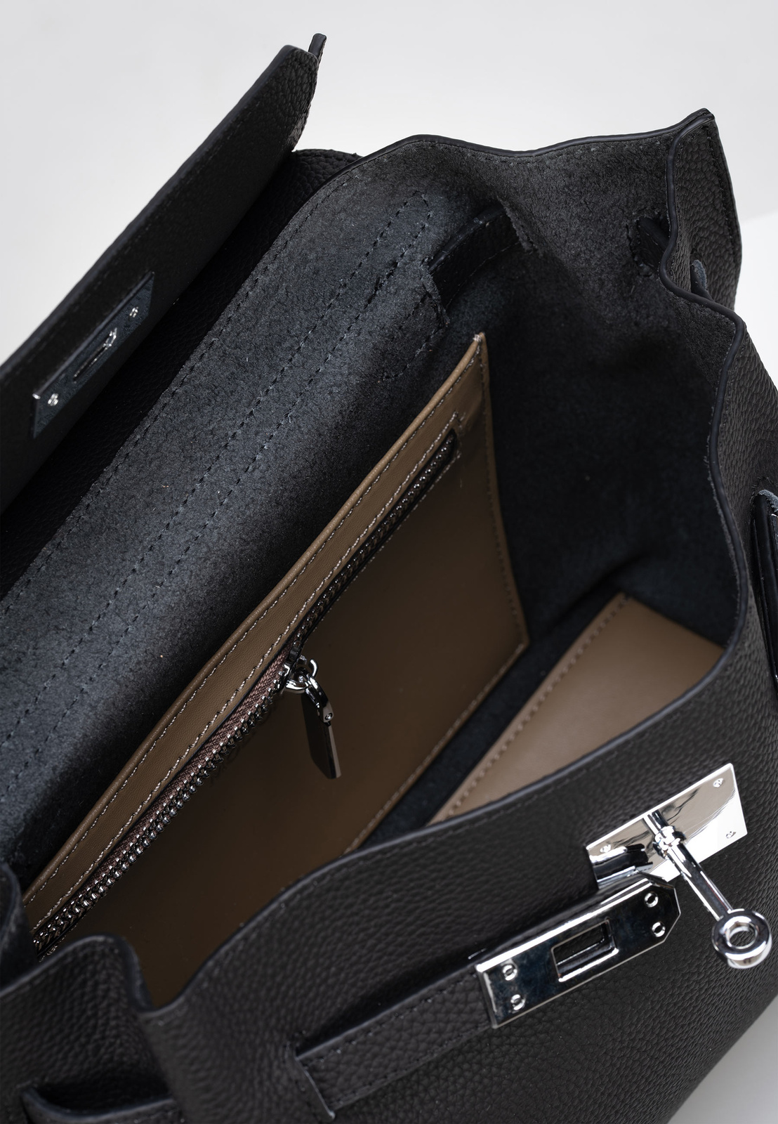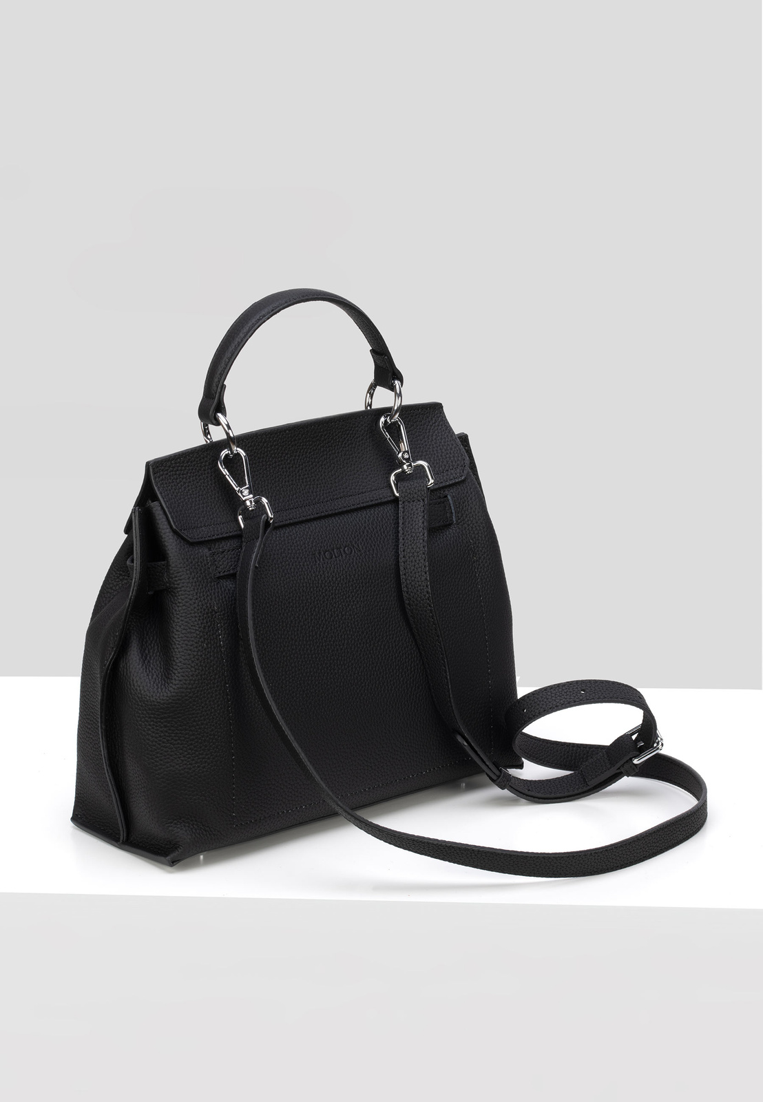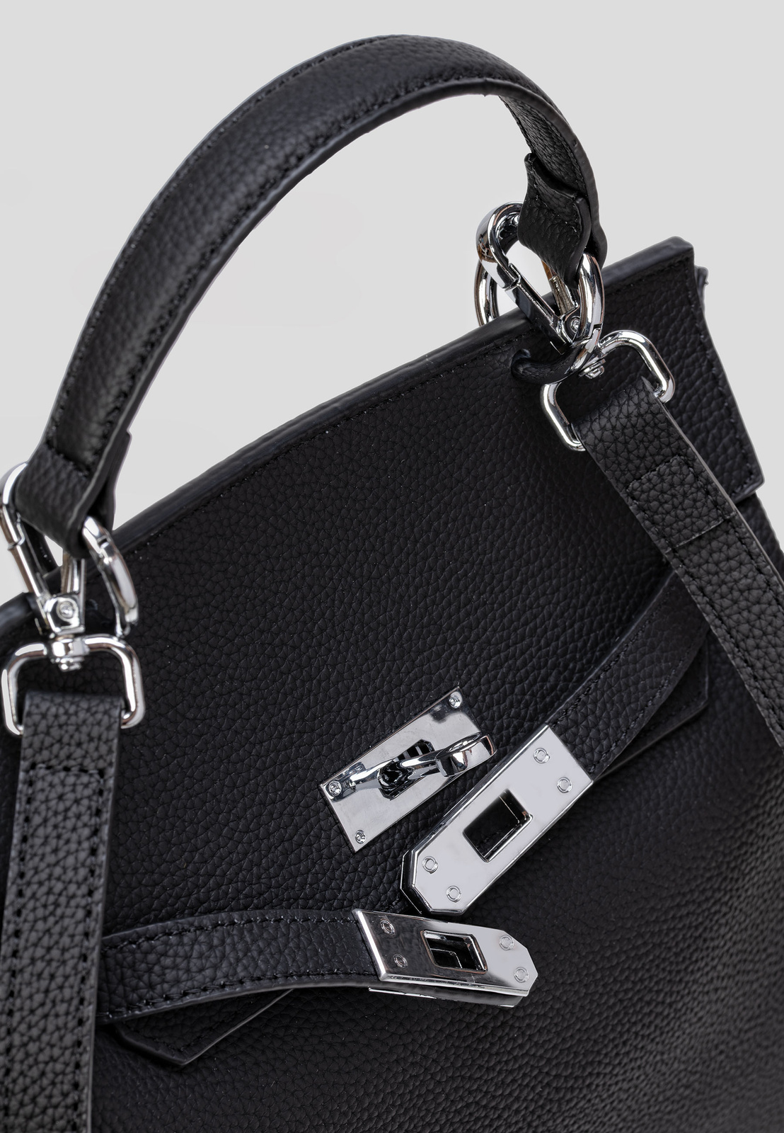 Oryginalna mała torebka typu kuferek w głębokiej czerni, wykonana z naturalnej skóry o subtelnej fakturze. Torebka wyposażona jest w wygodne ucho do ręki oraz odpinany, regulowany pasek na ramię, co daje możliwość noszenia jej w różny sposób. Wyjątkowe, designerskie zapięcie sprawia, że model przyciąga spojrzenia i wyróżnia się oryginalnym stylem. W środku znajduje się jedna pojemna kieszeń oraz mniejsza kieszonka na suwak. Kompaktowy rozmiar - nie mieści formatu A4, a jednocześnie pozostaje niezwykle funkcjonalny na co dzień. Model dostępny także w eleganckim, camelowym odcieniu.