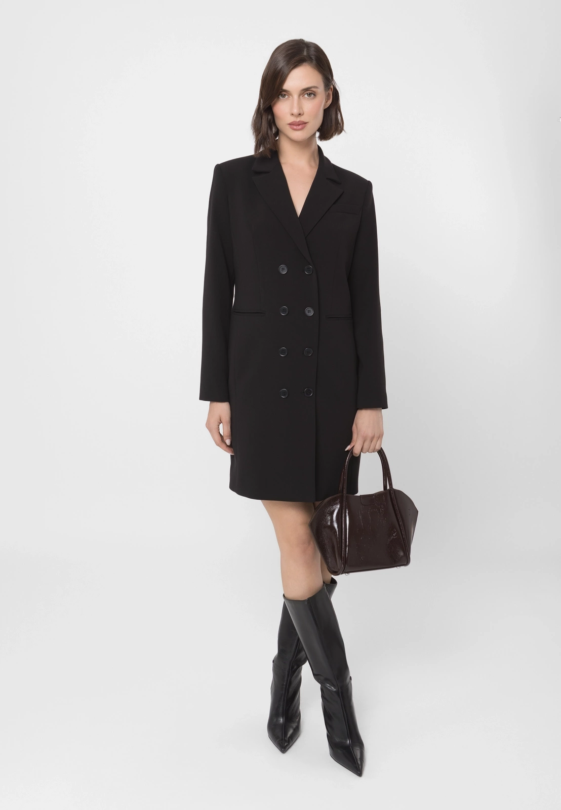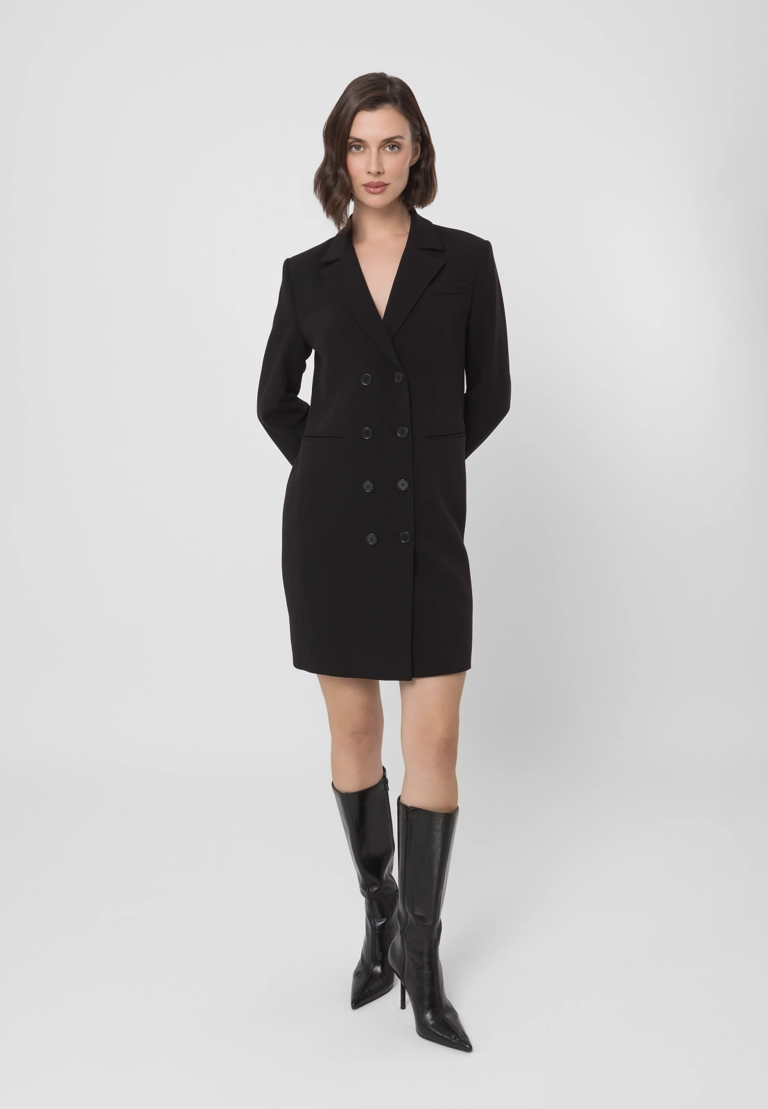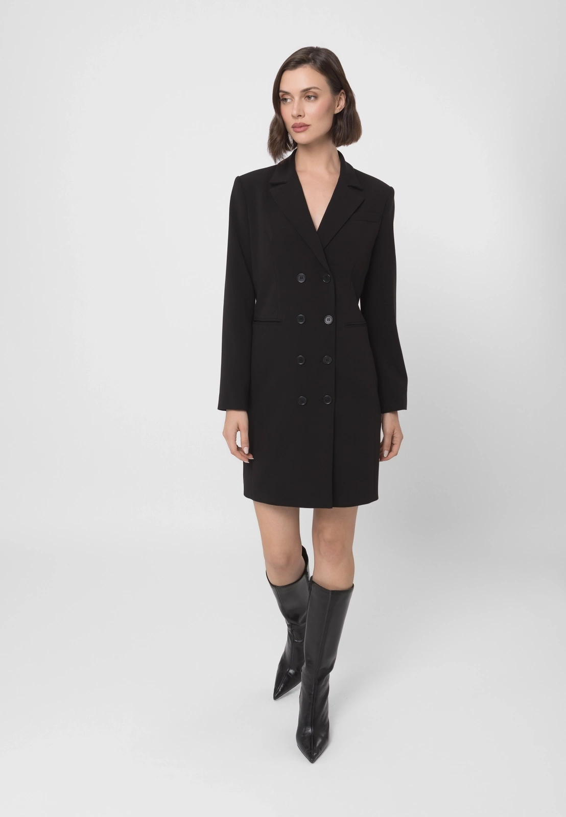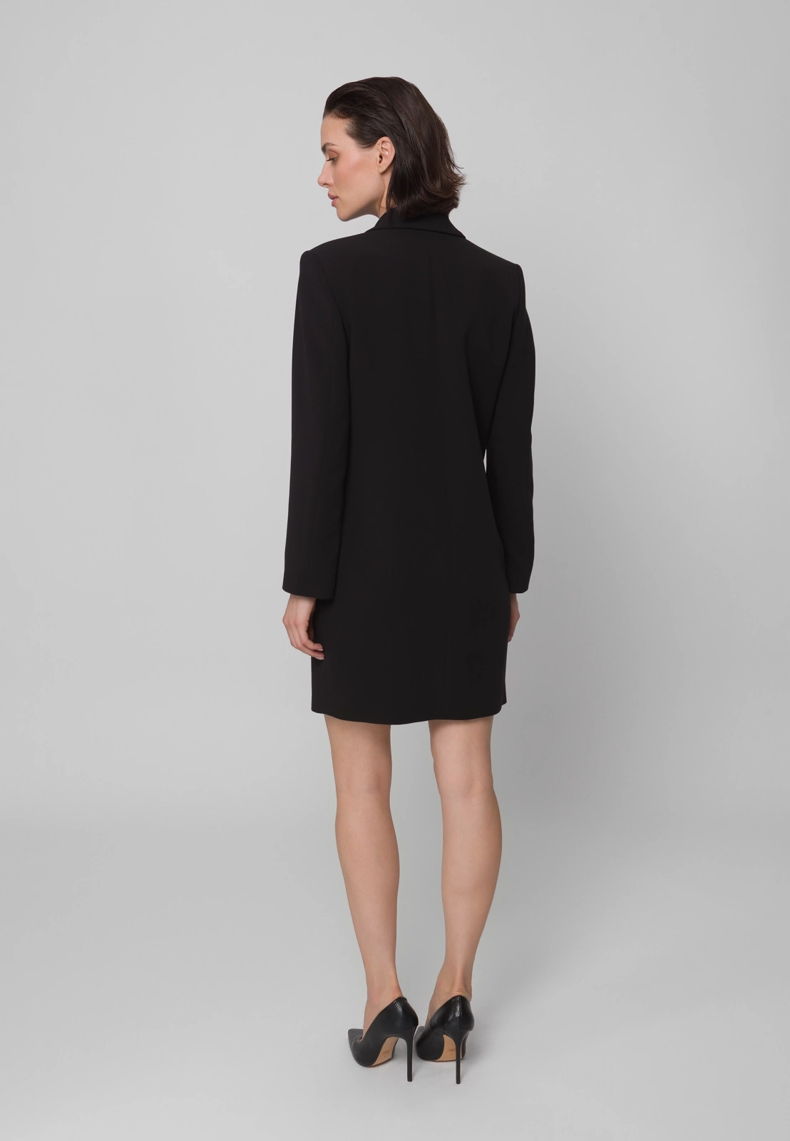 Czarna sukienka żakietowa, dwurzędowa o eleganckim kroju, inspirowanym klasyczną marynarką. Wykonana z wysokogatunkowej tkaniny, zapewnia doskonałe dopasowanie i komfort noszenia. Podszewka z przewagą wiskozy sprawia, że model jest przyjemny w kontakcie ze skórą i układa się perfekcyjnie. Fason o prostych liniach z klapami marynarki i długością mini podkreśla nowoczesny, kobiecy charakter. To idealny wybór na eleganckie wyjścia, spotkania biznesowe czy wieczorne okazje – łączy w sobie szyk żakietu i zmysłowość sukienki.