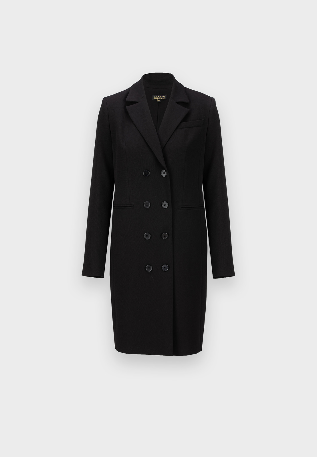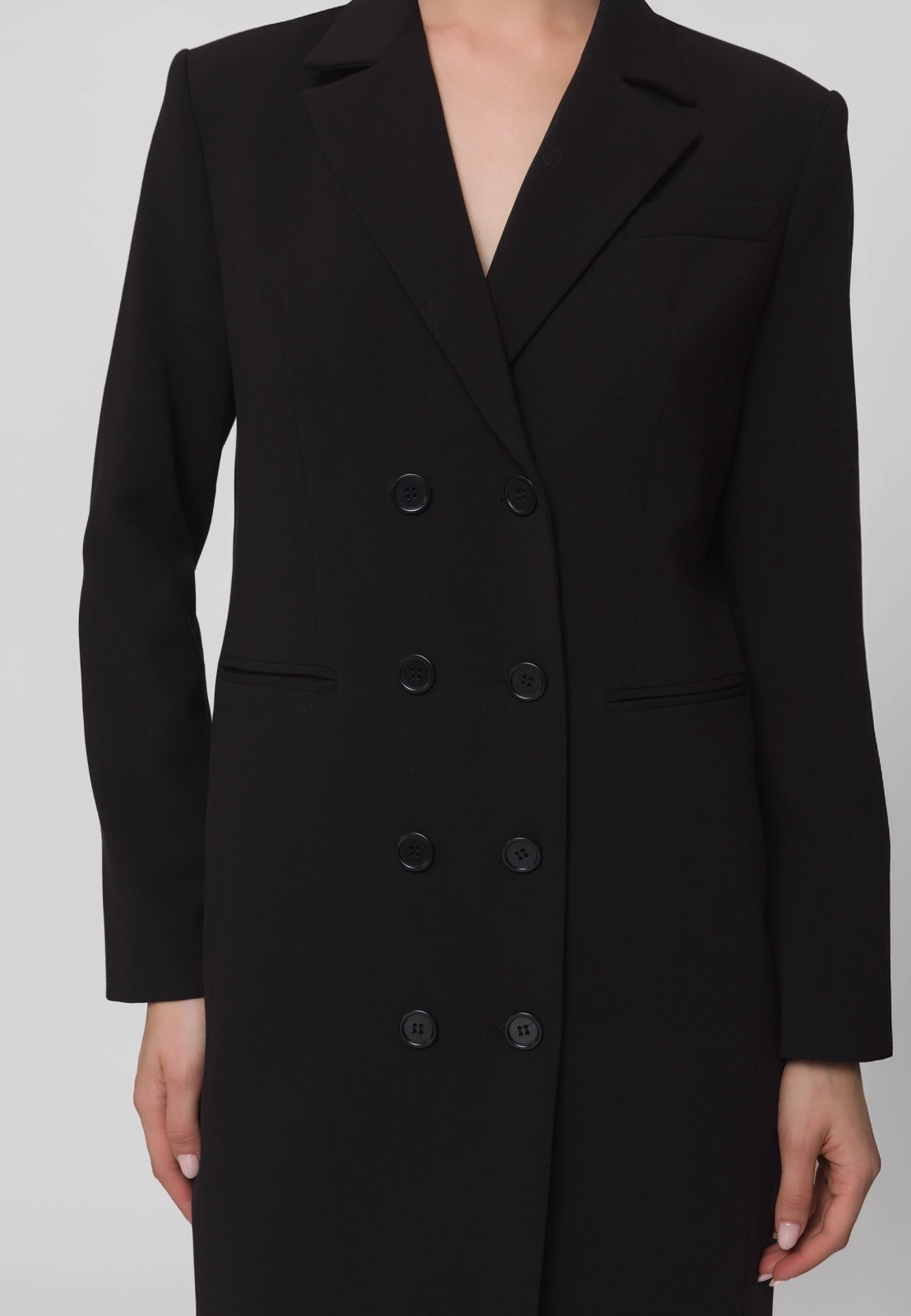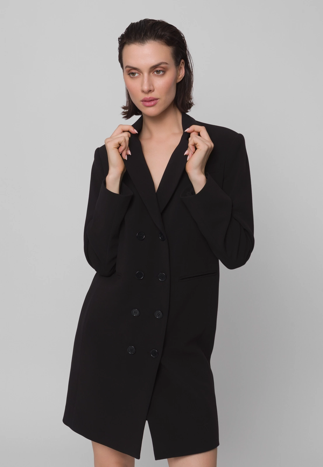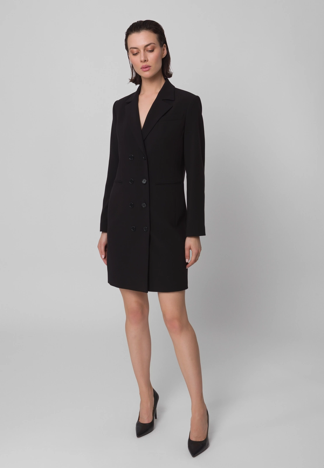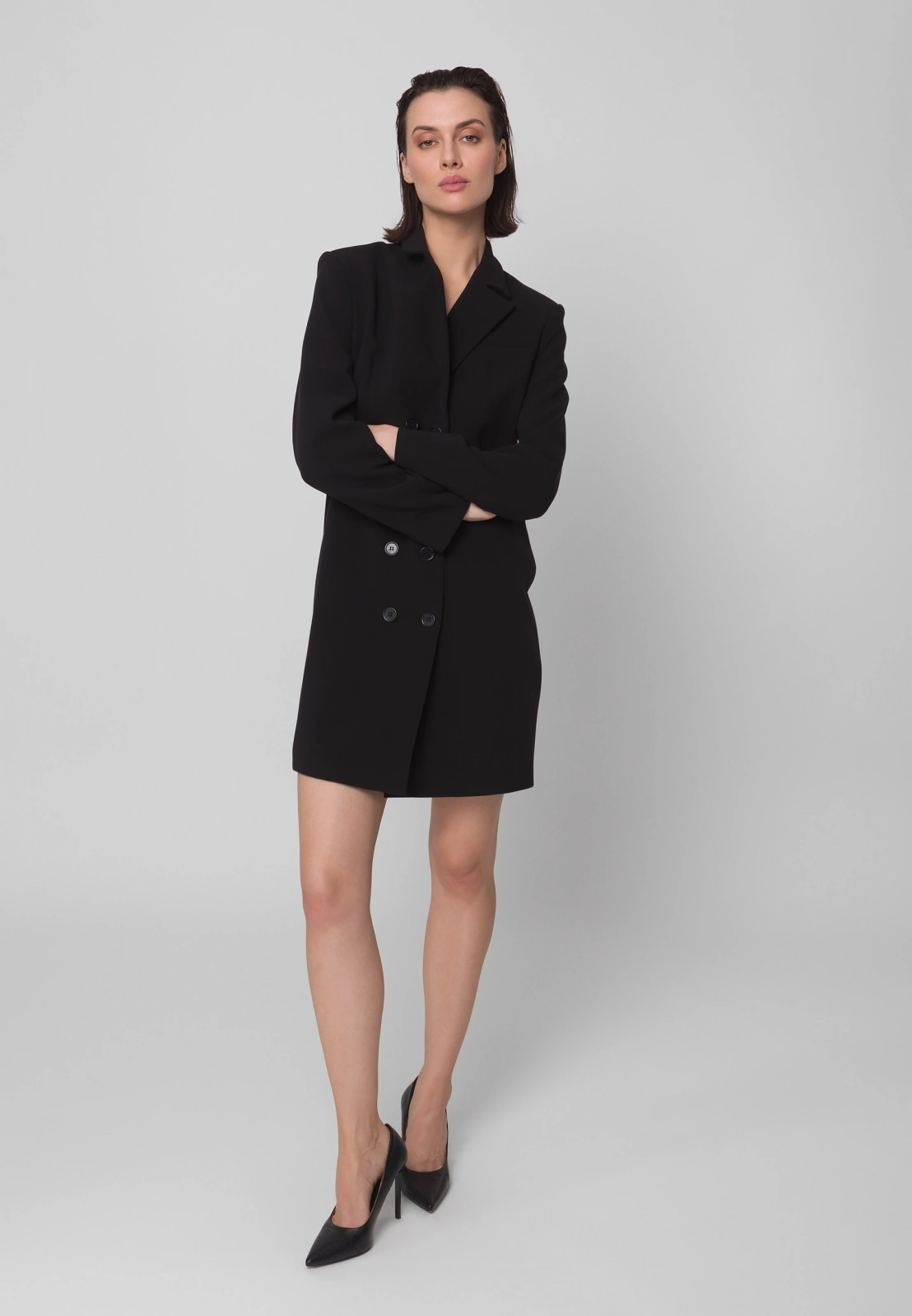 Czarna sukienka żakietowa, dwurzędowa o eleganckim kroju, inspirowanym klasyczną marynarką. Wykonana z wysokogatunkowej tkaniny, zapewnia doskonałe dopasowanie i komfort noszenia. Podszewka z przewagą wiskozy sprawia, że model jest przyjemny w kontakcie ze skórą i układa się perfekcyjnie. Fason o prostych liniach z klapami marynarki i długością mini podkreśla nowoczesny, kobiecy charakter. To idealny wybór na eleganckie wyjścia, spotkania biznesowe czy wieczorne okazje – łączy w sobie szyk żakietu i zmysłowość sukienki.