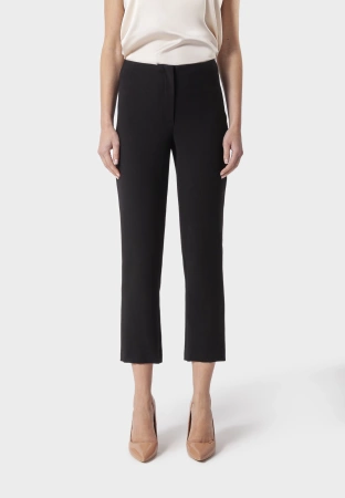 Eleganckie czarne spodnie o skróconym kroju. Proste, dopasowane nogawki długości ⅞ dodają sylwetce lekkości i pięknie podkreślają kostki. Świetnie prezentują się z różnymi fasonami obuwia. Mają podwyższony stan, optycznie wysmuklający nogi. Klasyczny czarny kolor pasuje niemal do wszystkiego. Spodnie zostały wykonane z wysokogatunkowej tkaniny z dodatkiem wiskozy.