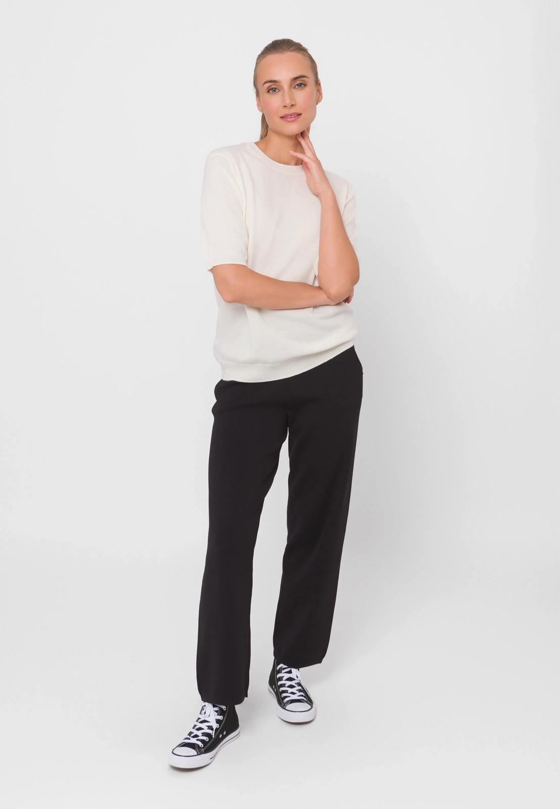 Czarne dzianinowe spodnie to połączenie niemal dresowego komfortu z klasycznym fasonem i kolorem. Zostały wykonane z niezwykle miękkiej i przyjemnej w dotyku dzianiny na bazie wiskozy, która doskonale dopasowuje się do kształtów sylwetki. Spodnie mają praktyczny i wygodny wysoki stan z gumką oraz proste nogawki. Ten fason jest również dostępny w czerwonej wersji kolorystycznej.