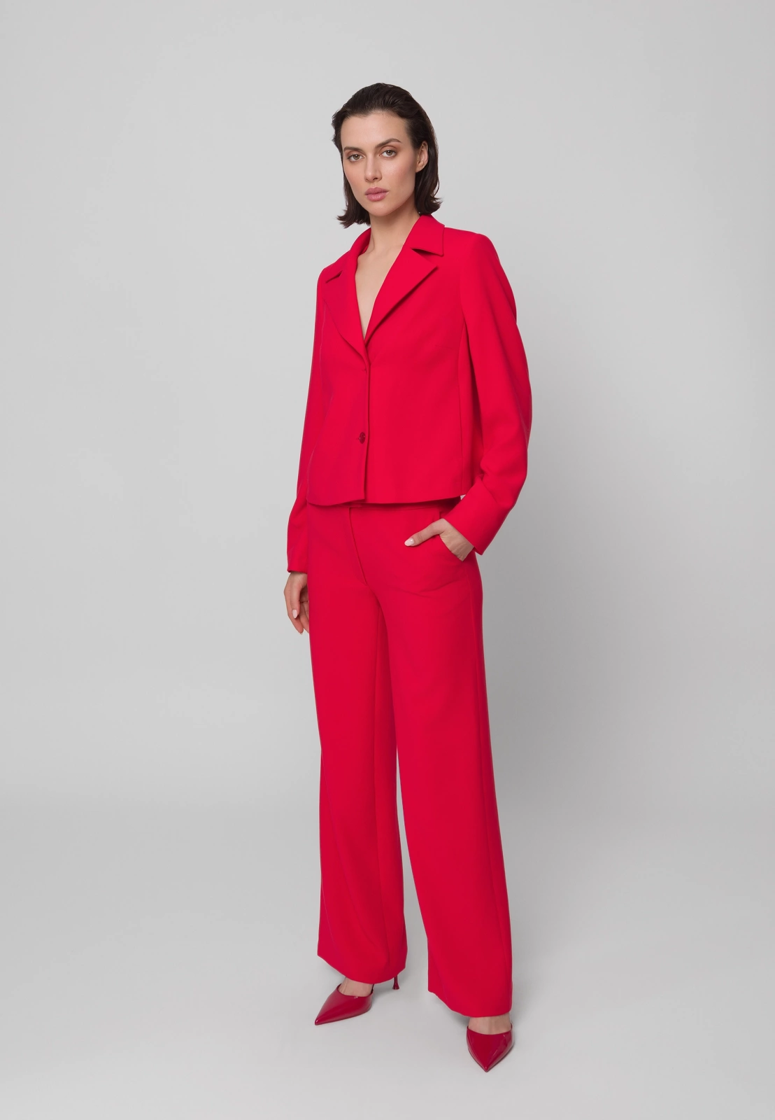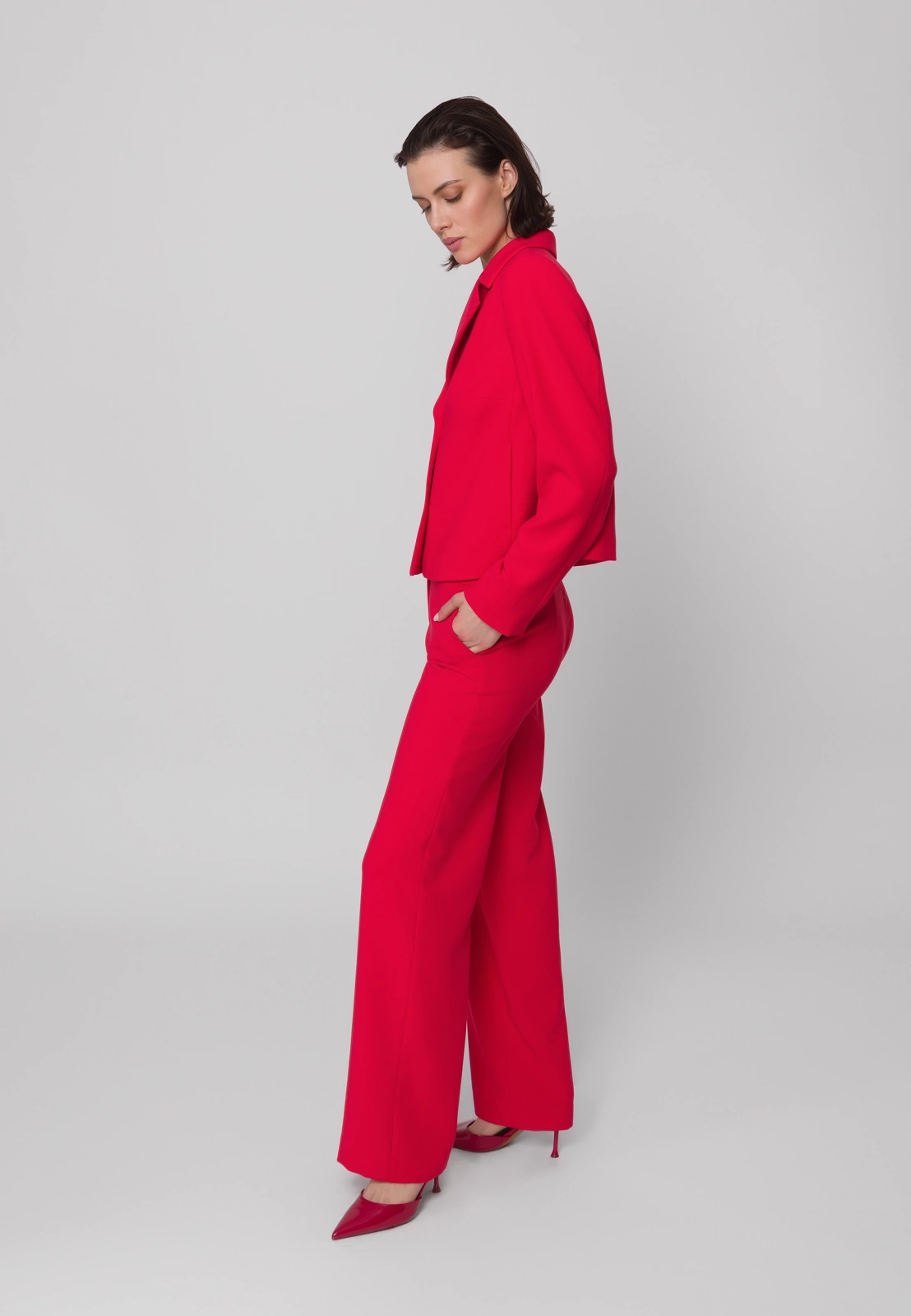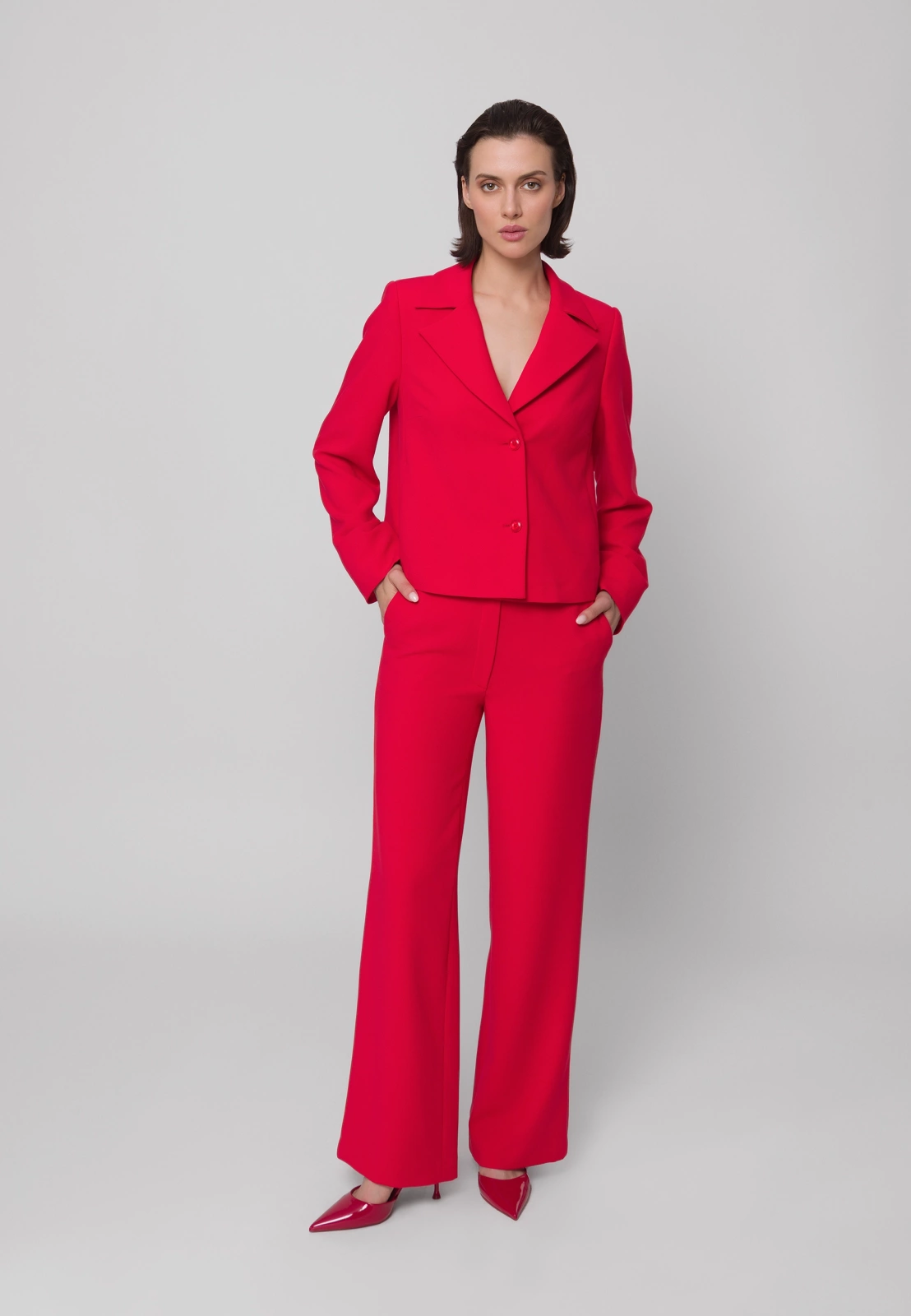 Czerwone spodnie garniturowe o szerokiej nogawce to odważny i elegancki wybór do każdej kobiecej garderoby. Wykonane z wysokiej jakości tkaniny z domieszką wiskozy i elastanu, zapewniają komfort noszenia i swobodę ruchów. Model posiada praktyczne kieszenie, a w połączeniu z pudełkowym żakietem uszytym z tej samej tkaniny i w tym samym intensywnym odcieniu tworzą efektowny, spójny damski garnitur – idealny zarówno na biznesowe okazje, jak i wyjścia w bardziej eleganckim stylu.