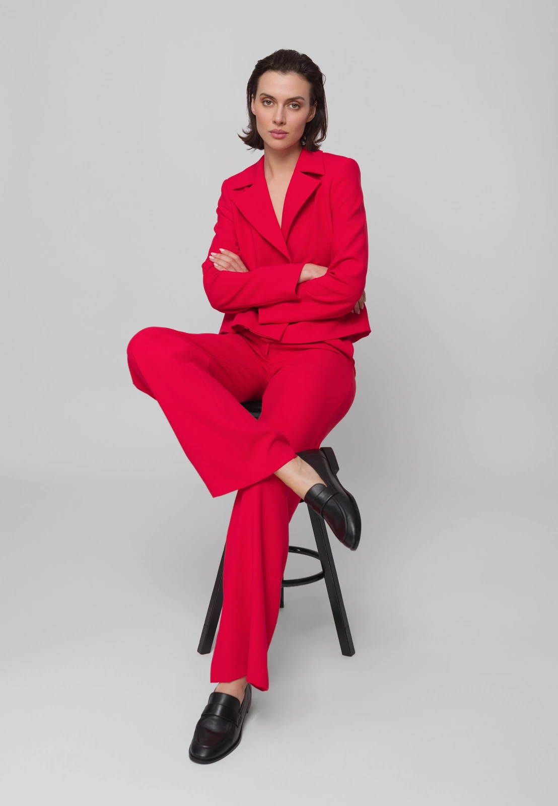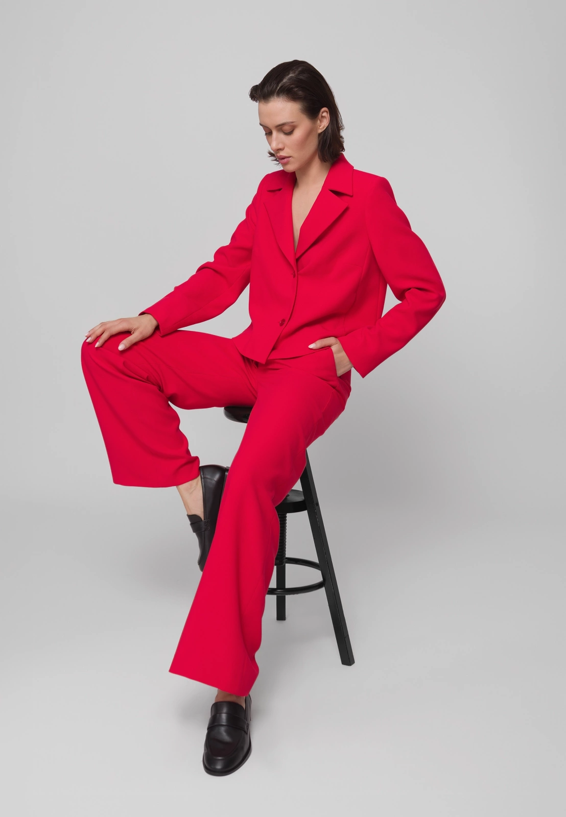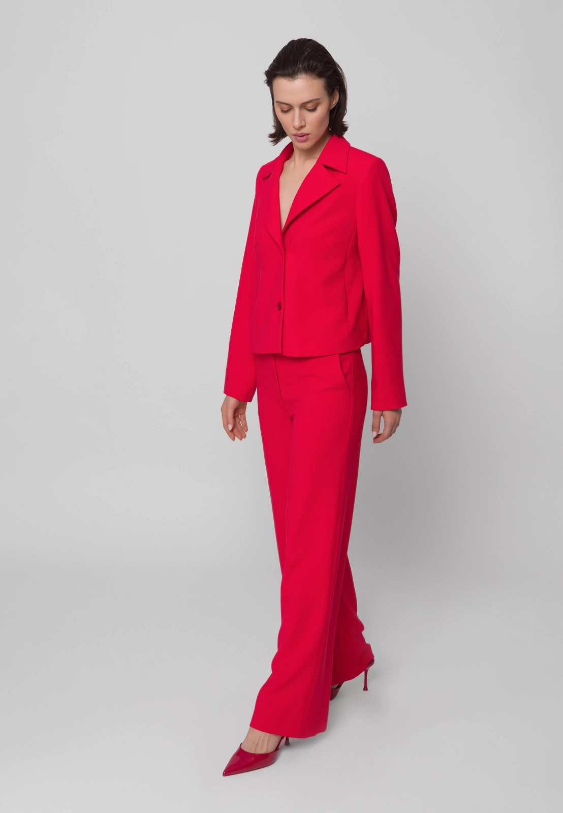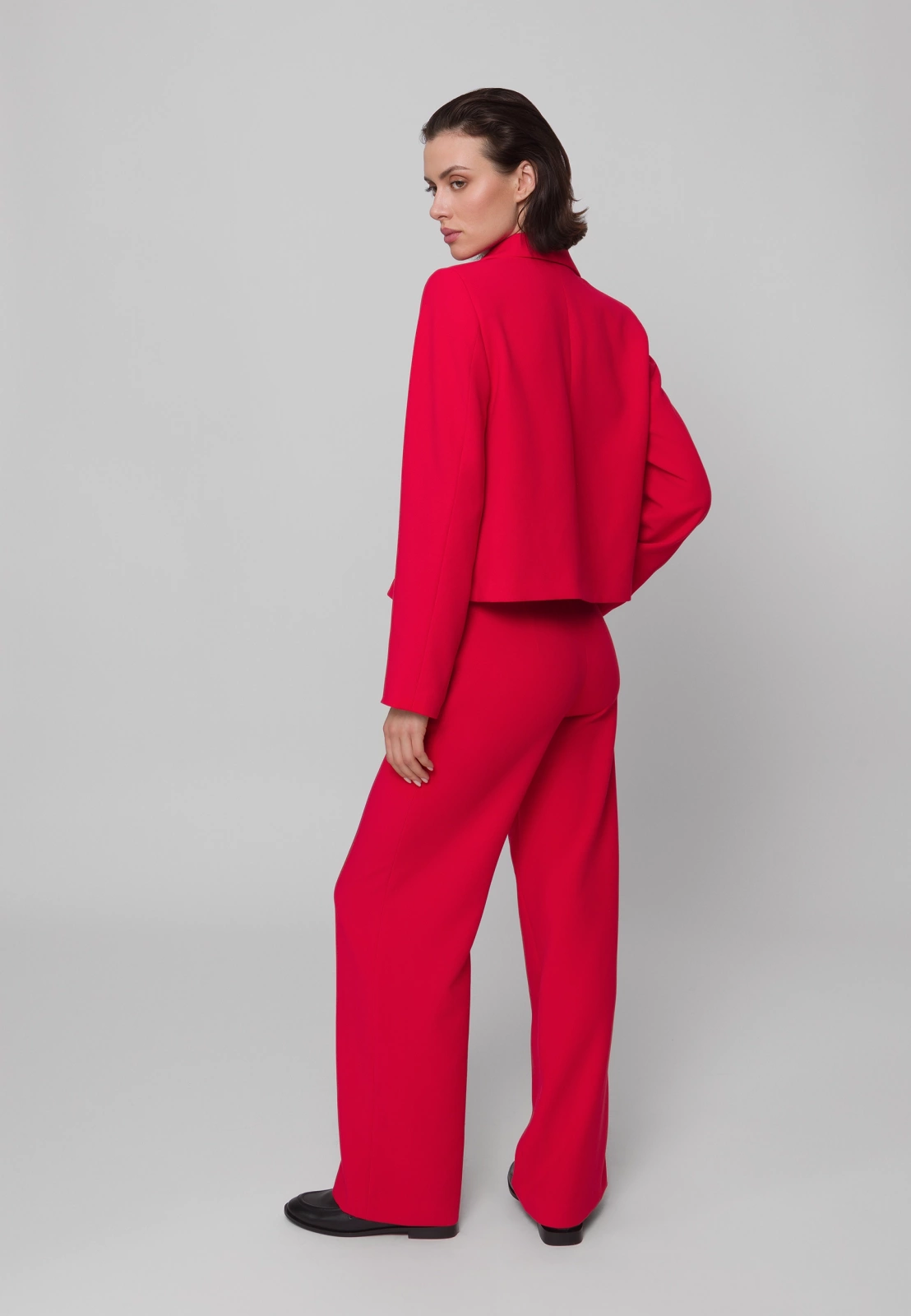 Czerwone spodnie garniturowe o szerokiej nogawce to odważny i elegancki wybór do każdej kobiecej garderoby. Wykonane z wysokiej jakości tkaniny z domieszką wiskozy i elastanu, zapewniają komfort noszenia i swobodę ruchów. Model posiada praktyczne kieszenie, a w połączeniu z pudełkowym żakietem uszytym z tej samej tkaniny i w tym samym intensywnym odcieniu tworzą efektowny, spójny damski garnitur – idealny zarówno na biznesowe okazje, jak i wyjścia w bardziej eleganckim stylu.