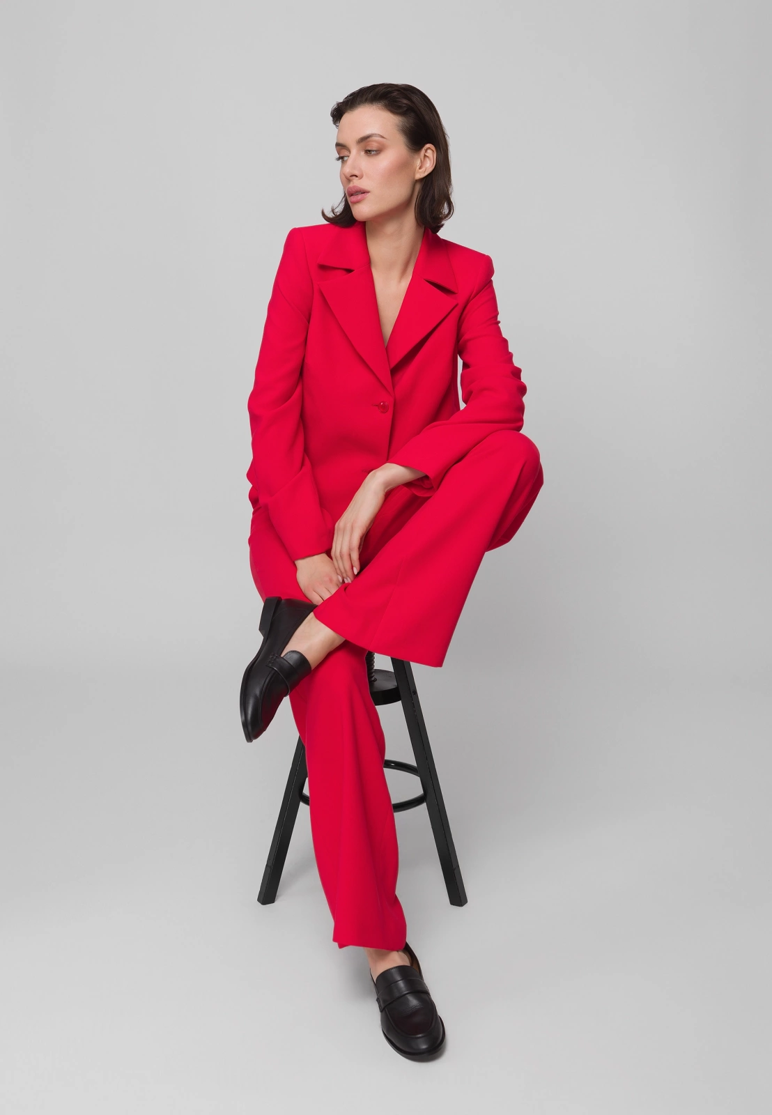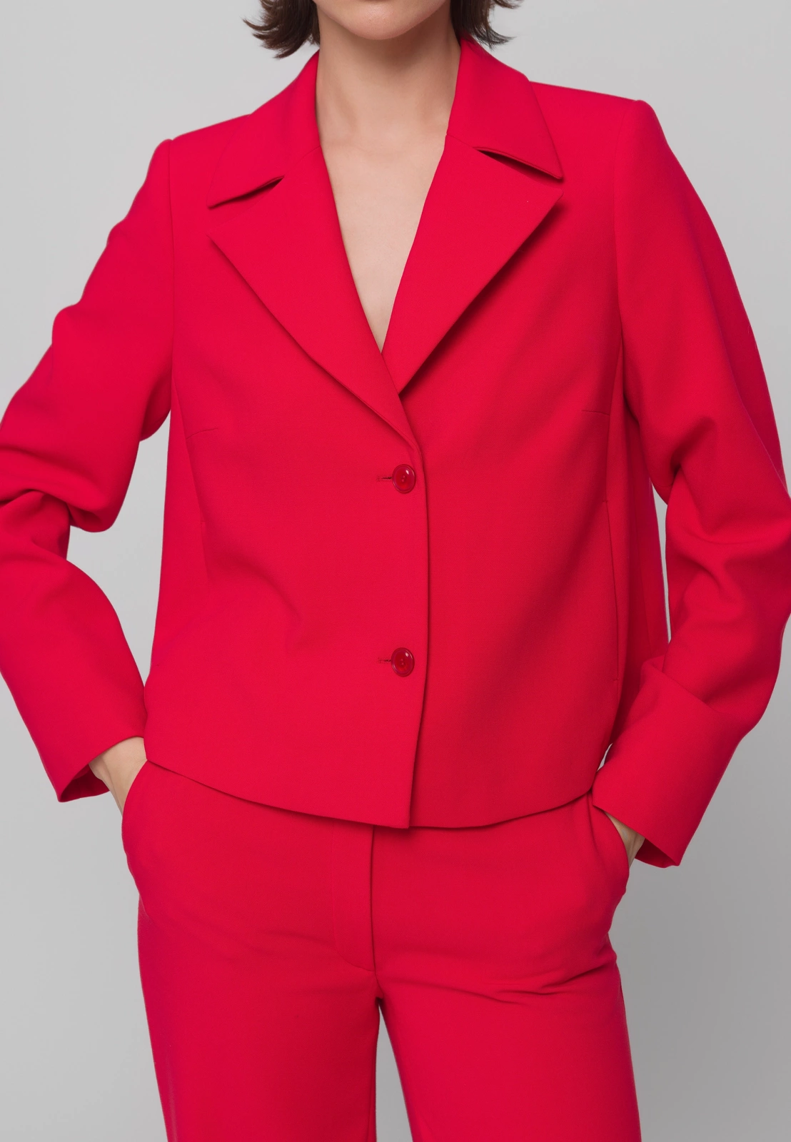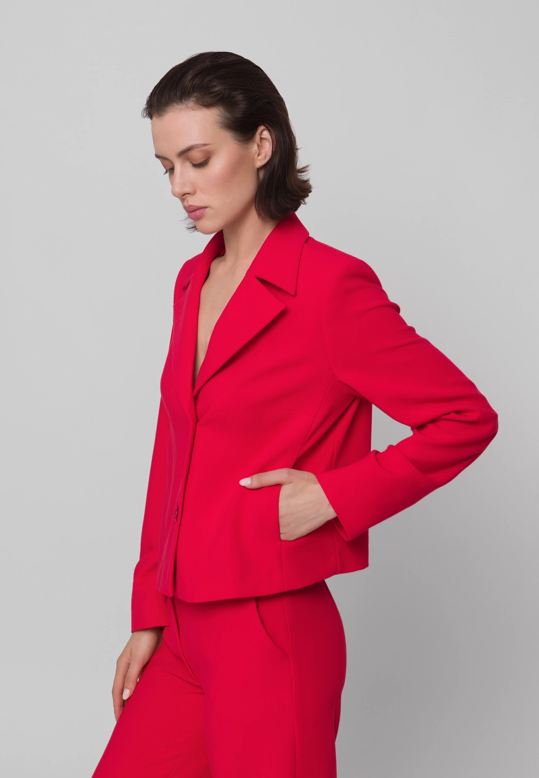 Żakiet damski o pudełkowym kroju w intensywnej czerwieni to propozycja dla kobiet, które cenią elegancję w nowoczesnym wydaniu. Wykonany z wysokiej jakości tkaniny z domieszką wiskozy i elastanu, łączy komfort noszenia z trwałością. Pudełkowy krój z klasycznymi klapami i prostą linią nadaje marynarce ponadczasowy charakter, a intensywny czerwony kolor dodaje energii i wyrazistości każdej stylizacji.