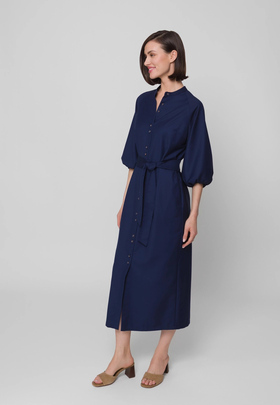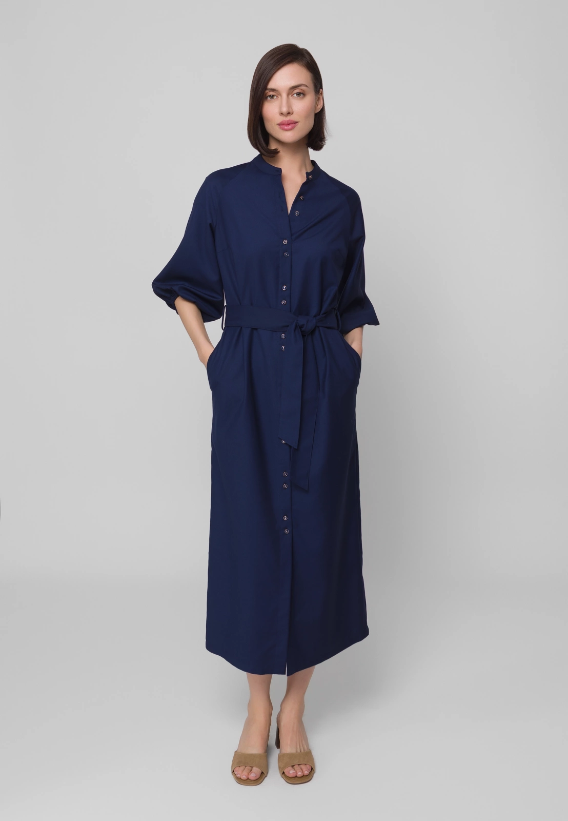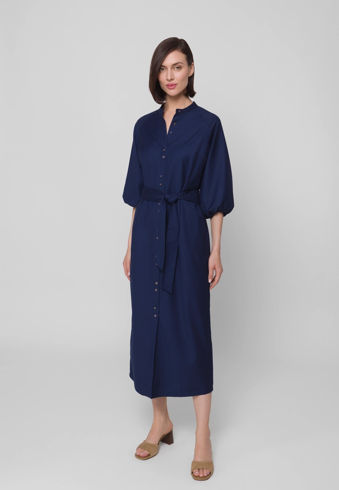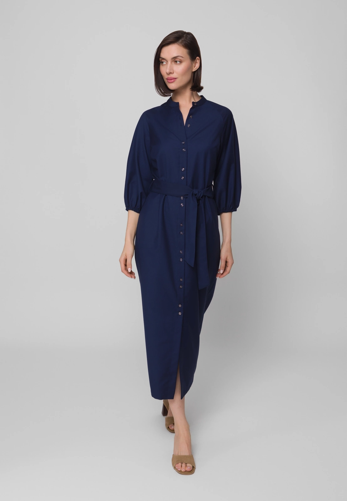 Długa granatowa sukienka to nowoczesna, stylowa interpretacja klasycznej szmizjerki. Stójka pod szyją oraz subtelnie bufowane rękawy 3/4 zakończone gumką nadają sylwetce lekkości i kobiecego wdzięku. Wiązanie w talii pięknie modeluje figurę, podkreślając jej proporcje.