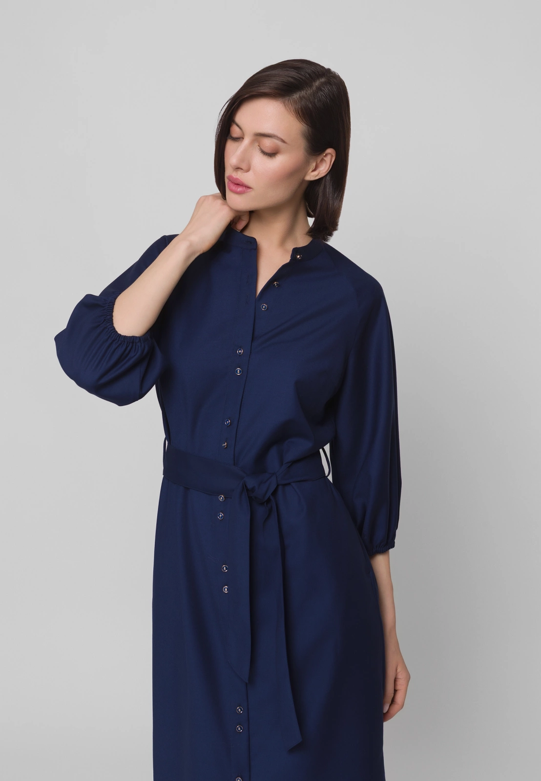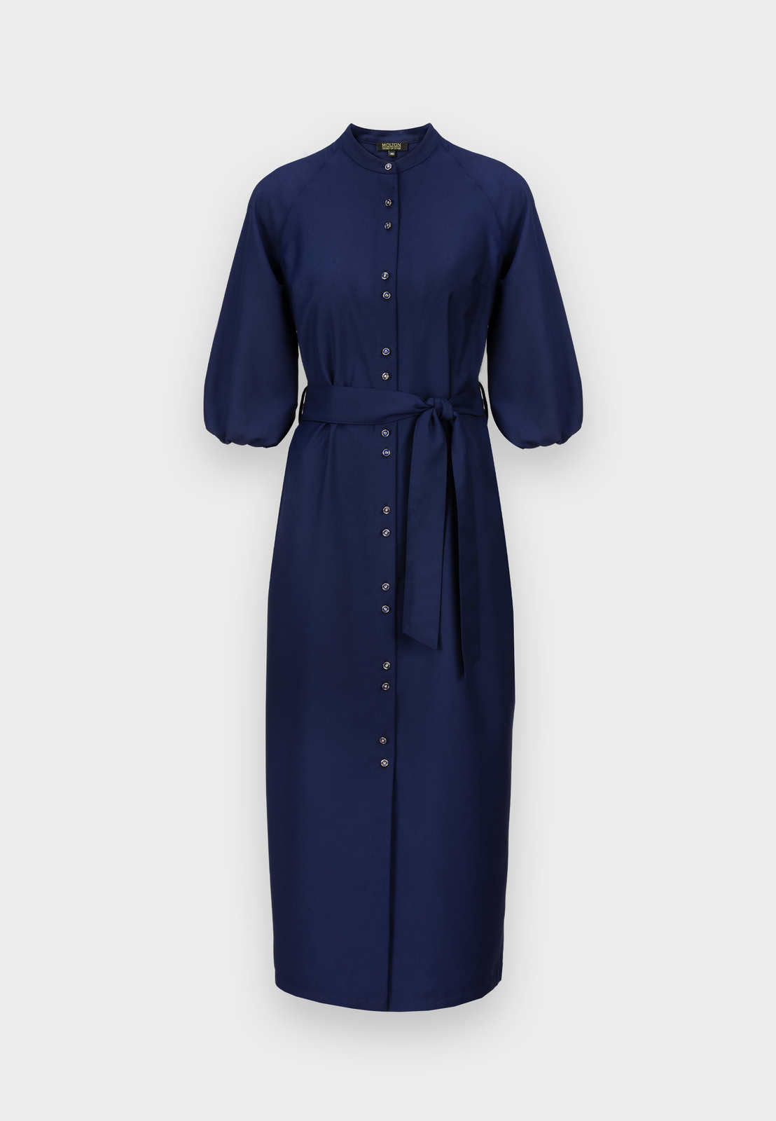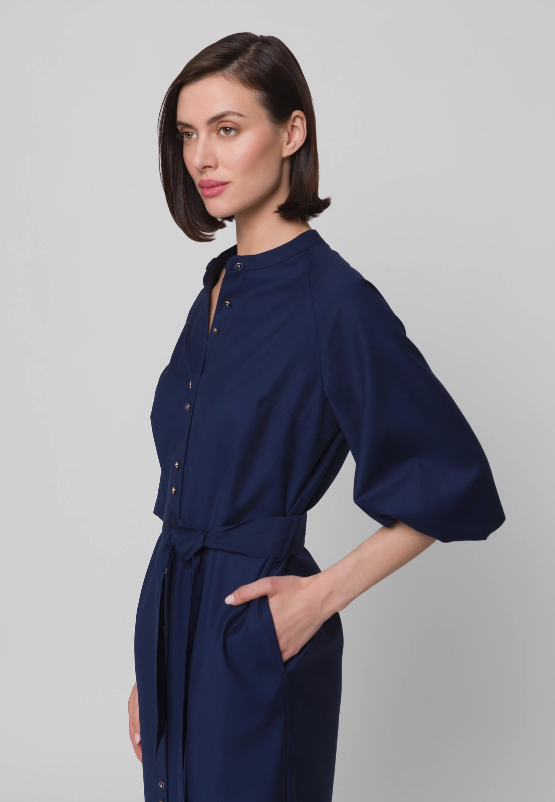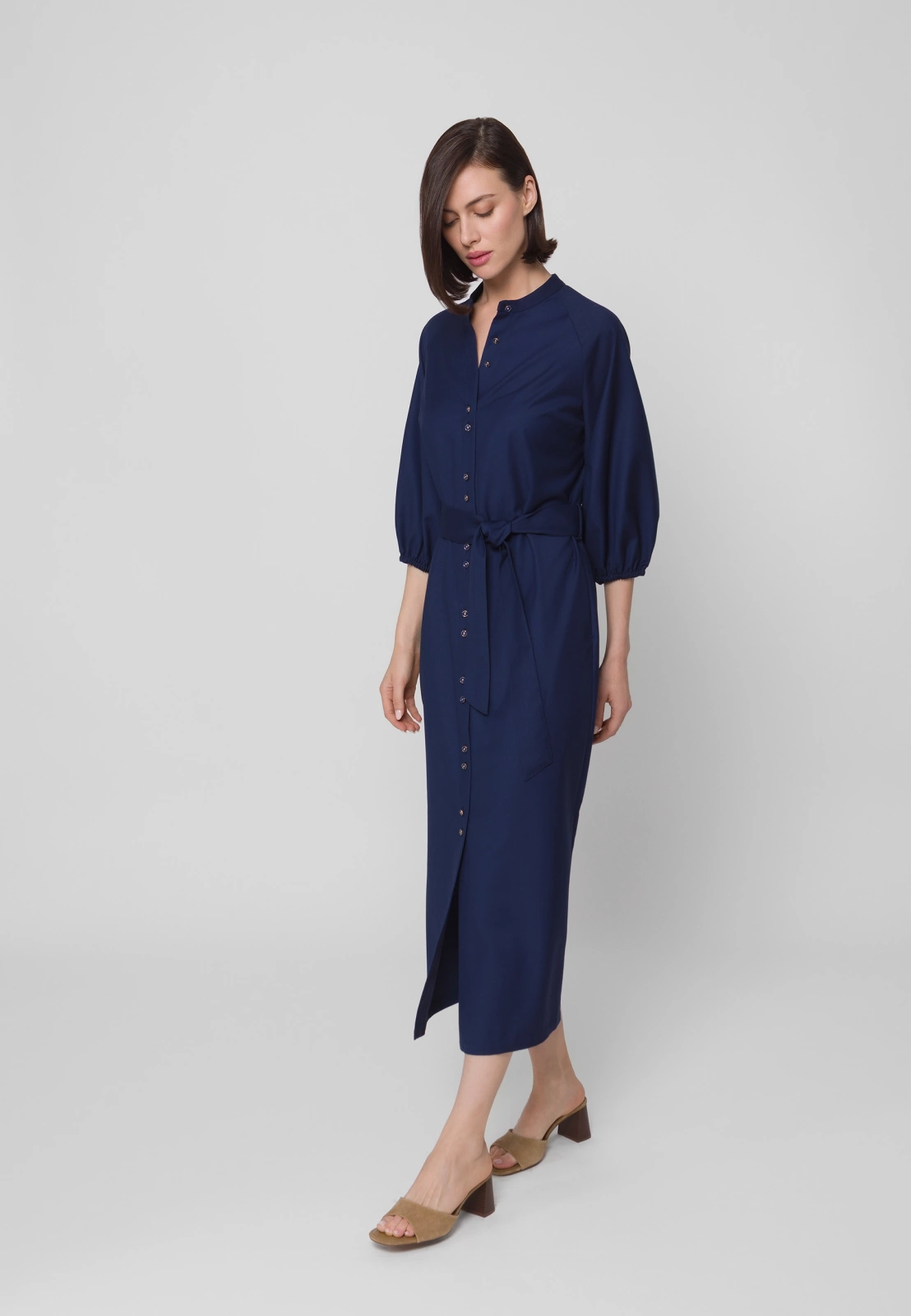 Długa granatowa sukienka to nowoczesna, stylowa interpretacja klasycznej szmizjerki. Stójka pod szyją oraz subtelnie bufowane rękawy 3/4 zakończone gumką nadają sylwetce lekkości i kobiecego wdzięku. Wiązanie w talii pięknie modeluje figurę, podkreślając jej proporcje.