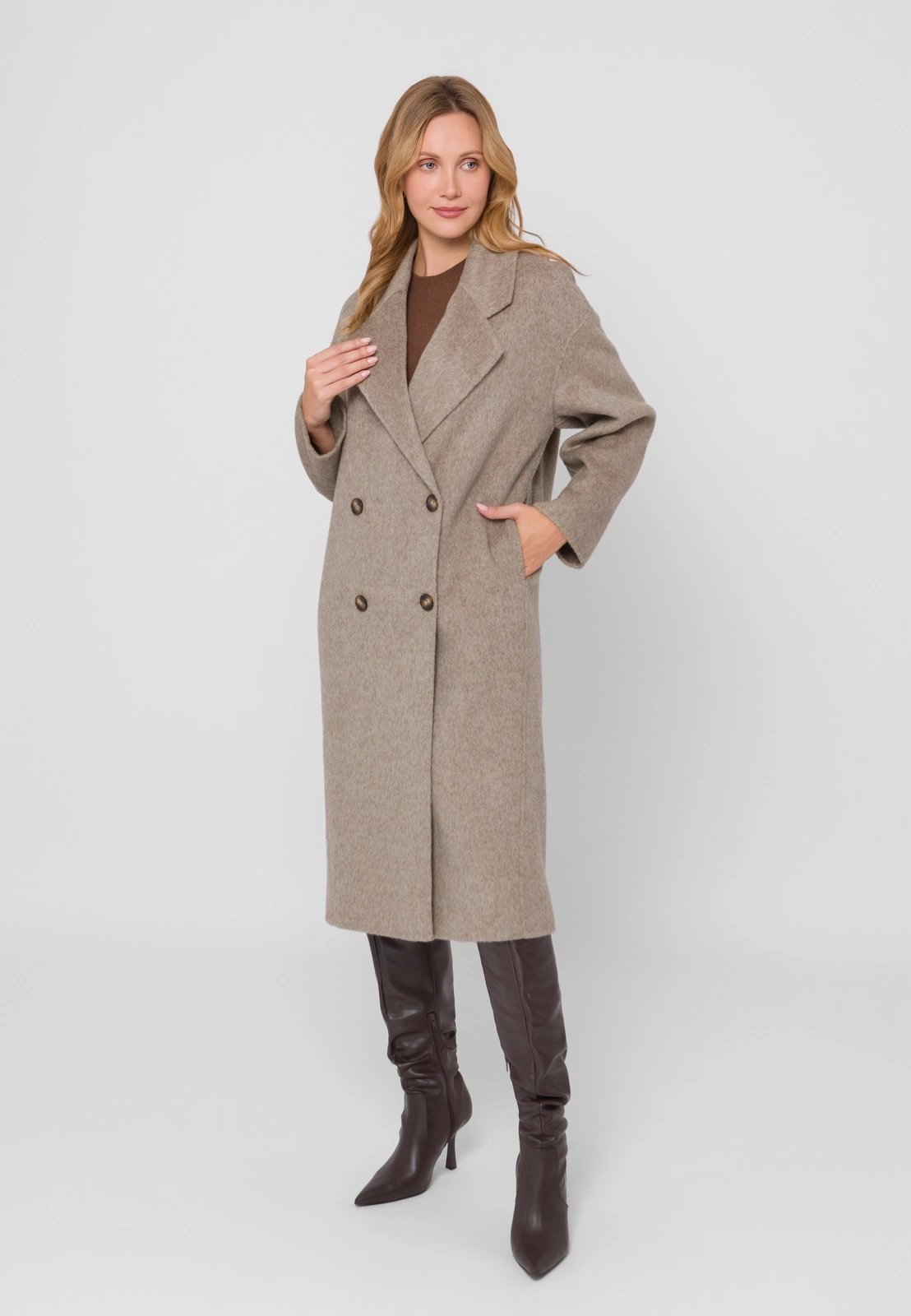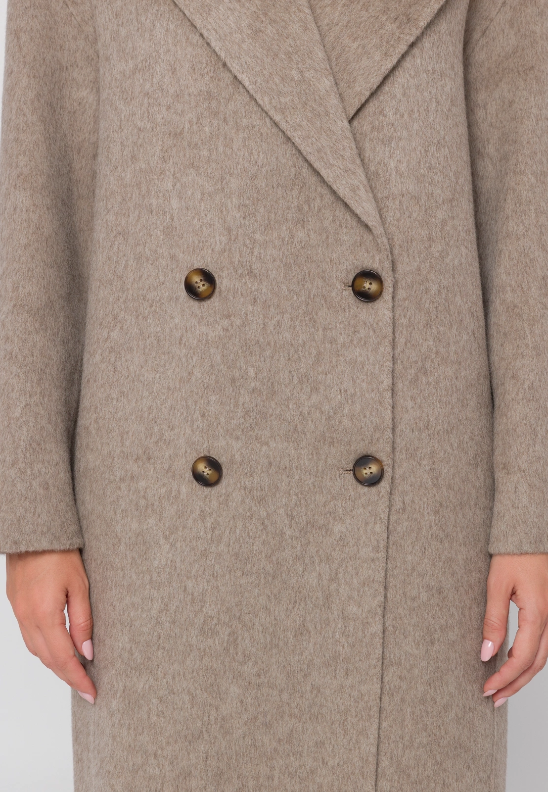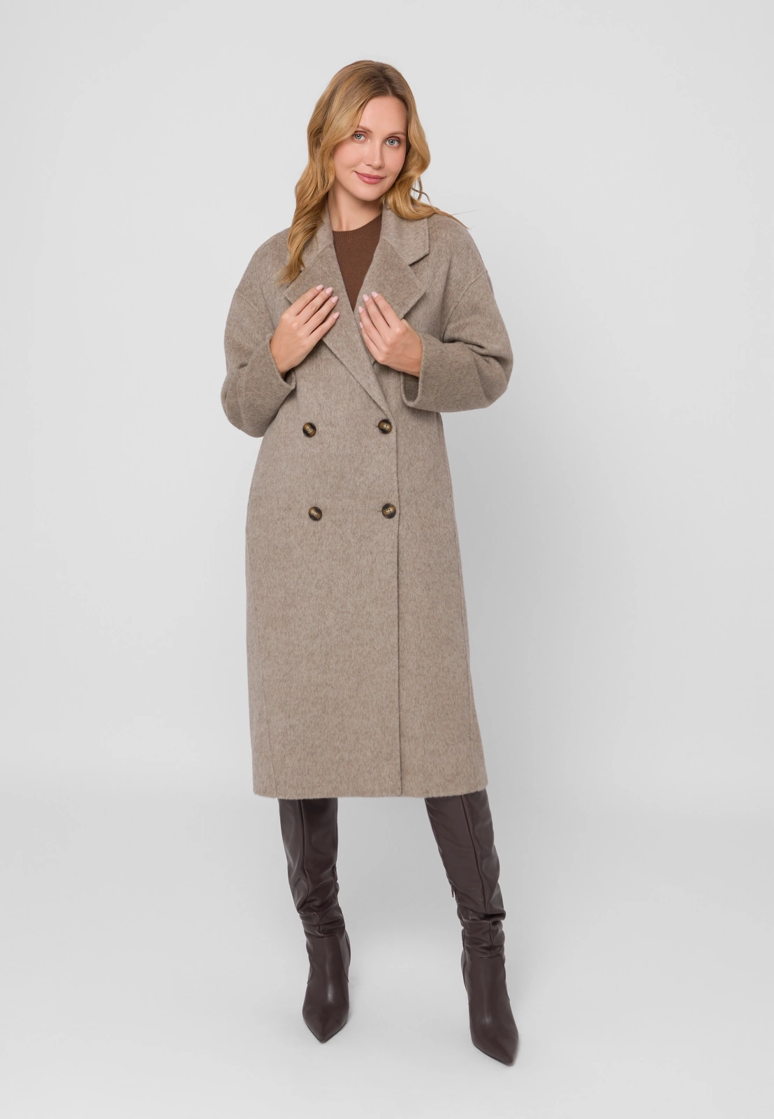 Długi, jasnobrązowy płaszcz wykonany w 100% z najwyższej jakości wełny zachwyca subtelną fakturą i wyjątkową miękkością materiału double face. Lekki, a zarazem ciepły i przyjemny w noszeniu, doskonale łączy elegancję z wygodą. Dwurzędowe zapięcie na guziki, klasyczny fason i praktyczne kieszenie nadają mu ponadczasowy charakter, a długość do kolan sprawia, że idealnie uzupełnia zarówno codzienne, jak i bardziej wyrafinowane stylizacje.