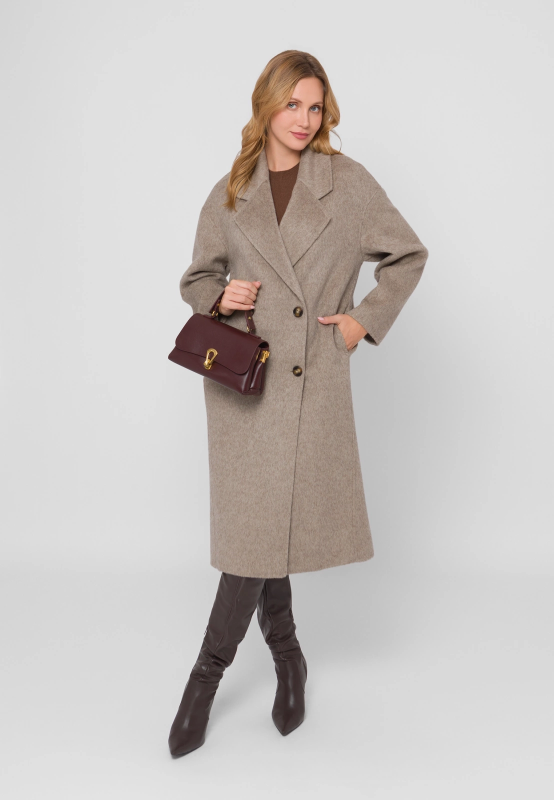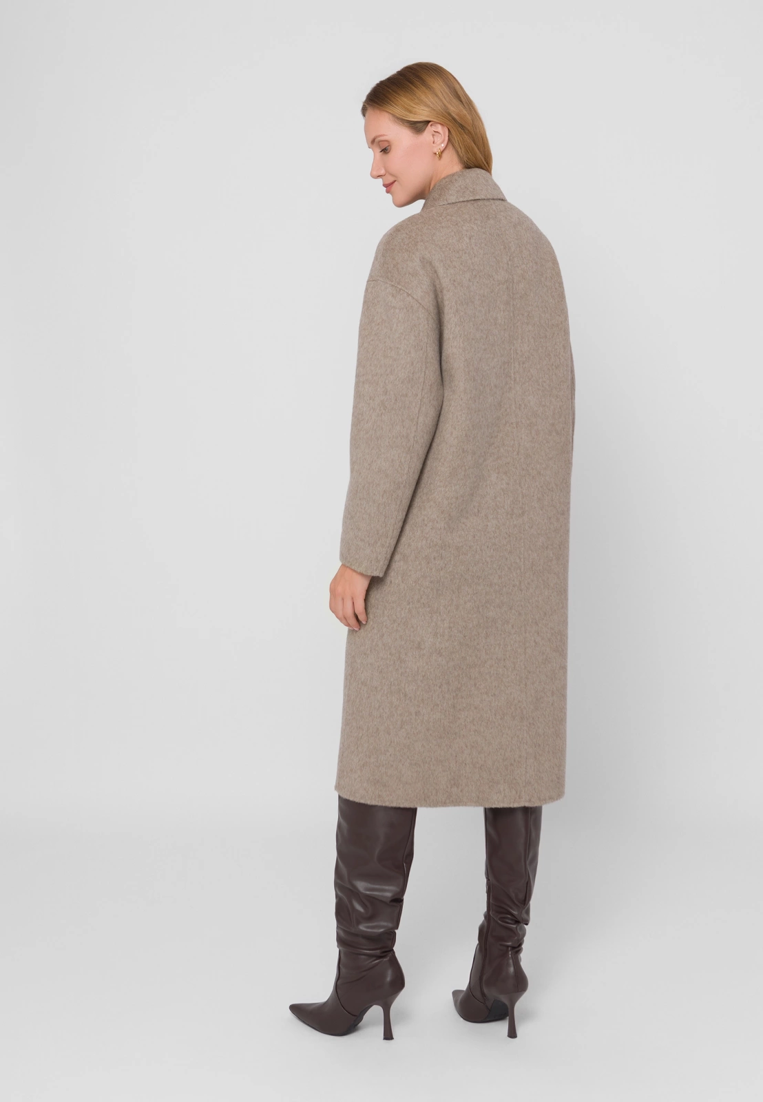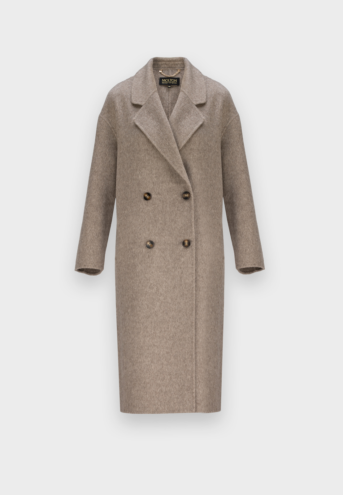 Długi, jasnobrązowy płaszcz wykonany w 100% z najwyższej jakości wełny zachwyca subtelną fakturą i wyjątkową miękkością materiału double face. Lekki, a zarazem ciepły i przyjemny w noszeniu, doskonale łączy elegancję z wygodą. Dwurzędowe zapięcie na guziki, klasyczny fason i praktyczne kieszenie nadają mu ponadczasowy charakter, a długość do kolan sprawia, że idealnie uzupełnia zarówno codzienne, jak i bardziej wyrafinowane stylizacje.
