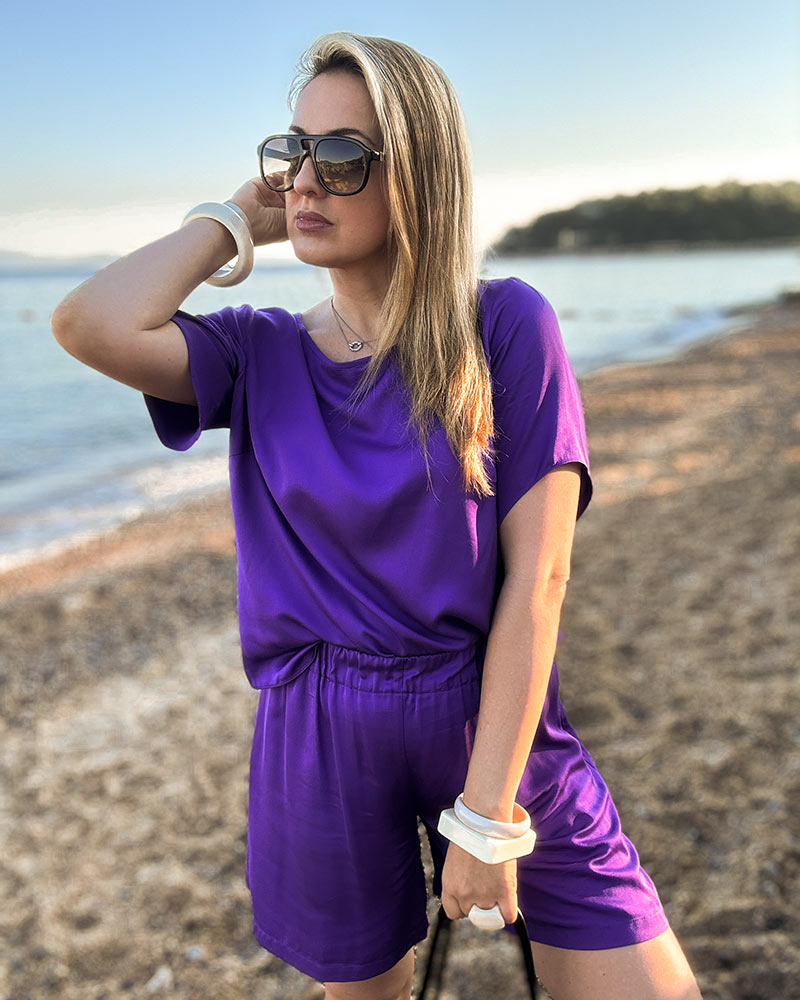 Krótkie spodenki z wysokim stanem mają szerokie, luźne nogawki do połowy uda. Są wykonane z wysokiej jakości wiskozowej dzianiny, która miękko opływa sylwetkę. Podwyższona talia sprawia, że optycznie wysmuklają nogi. Szorty mają nasycony odcień fioletu, który spodoba się wielbicielkom wyrazistych kolorów. Możesz je łączyć w komplet z fioletową bluzką z tej samej kolekcji lub dobrać do nich neutralny bawełniany T-shirt lub top.