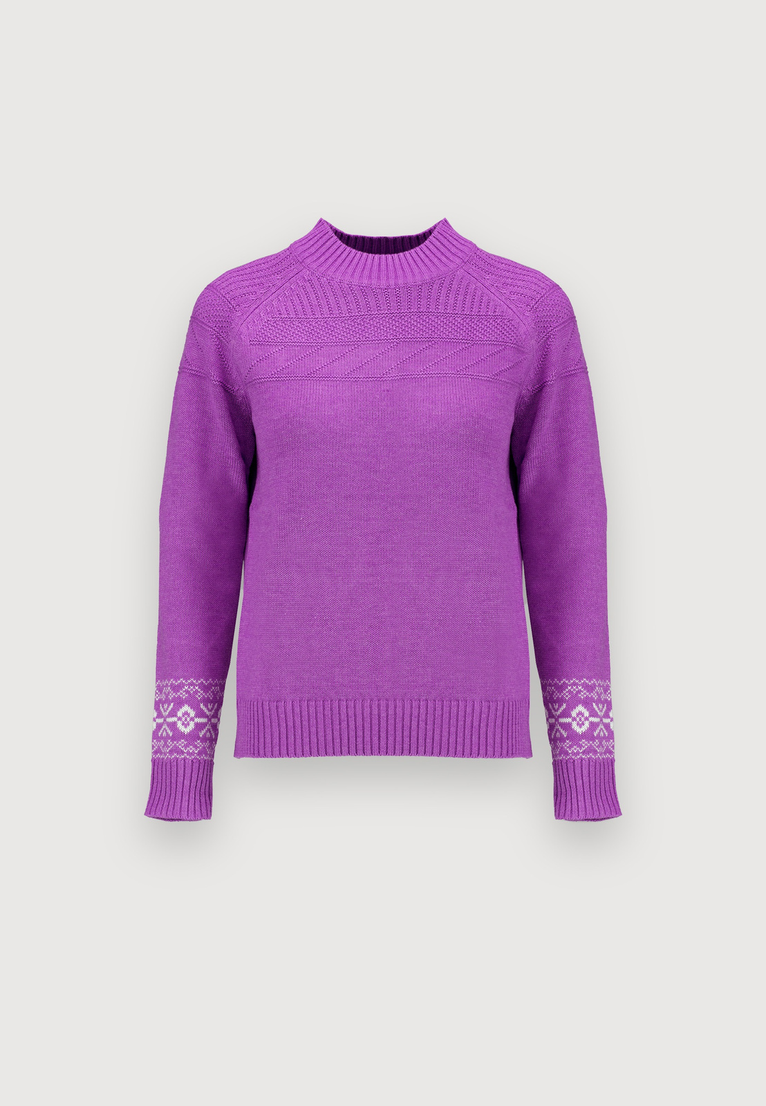 Sweter z półgolfem w pięknym jagodowym odcieniu fioletu to propozycja miękkiego i wygodnego ubioru do niezobowiązujących stylizacji. Zimowy motyw w stylu skandynawskim doskonale komponuje się z klimatami alpejskimi, a przyjemny w dotyku materiał z dodatkiem wełny zapewnia komfort noszenia i swobodę. Fioletowy sweter świetnie będzie wyglądał z wygodnymi jeansami lub z dzianinowymi spodniami. Model występuje jeszcze w kolorze niebieskim.