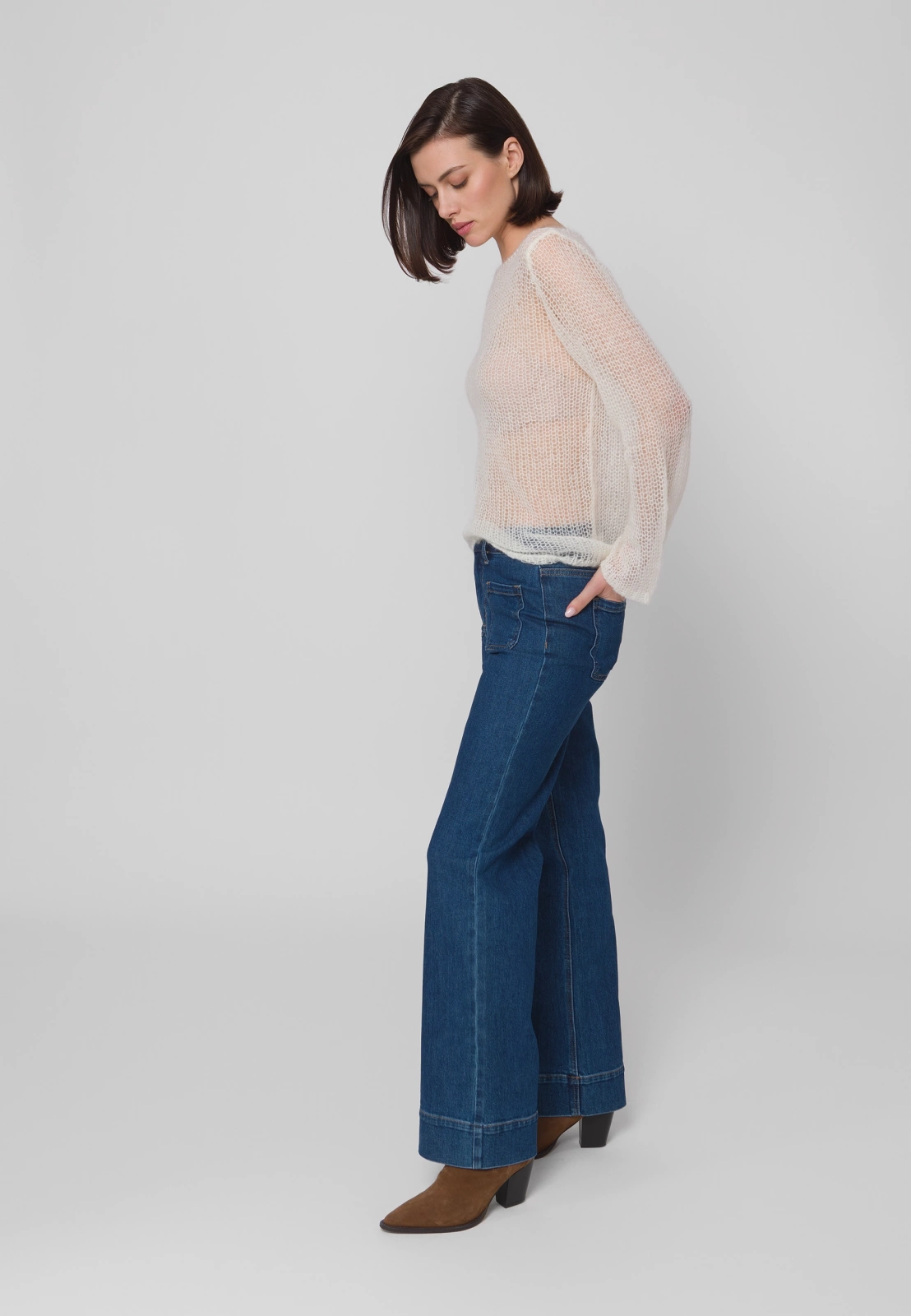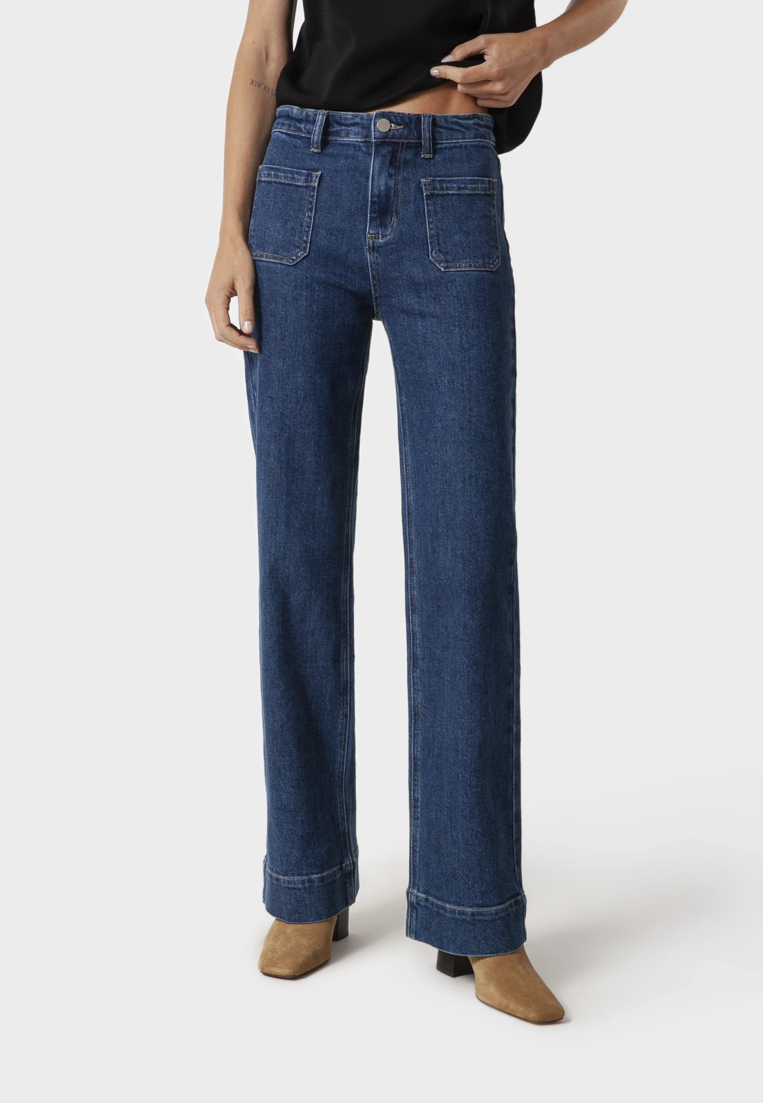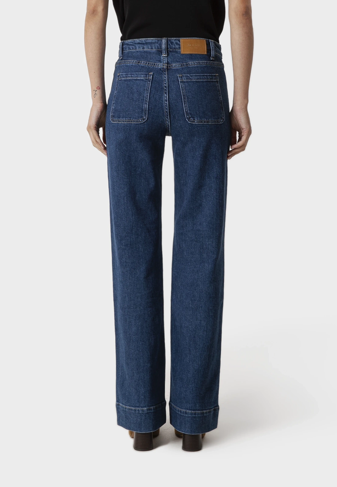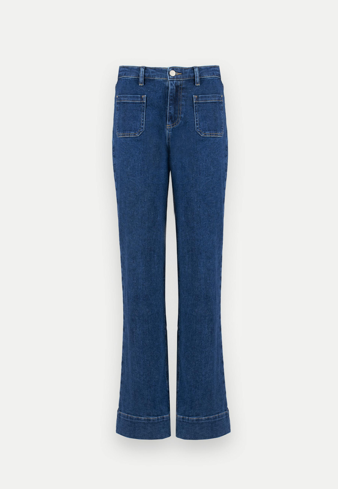 Spodnie jeansowe wide leg z wysokim stanem wykonane z wysokogatunkowej bawełny z dodatkiem elastycznych włókien. Mają szerokie nogawki pełnej długości, wykończone na dole przeszyciem. Posiadają naszyte kieszenie z przodu i z tyłu, pięknie prezentują się na sylwetce. Granatowy, uniwersalny odcień jeansu dobrze komponuje się z szeroką paletą barw. Wysoki stan spodni optycznie wysmukla sylwetkę. Dostępne są również w kolorze czarnym i szarym.
