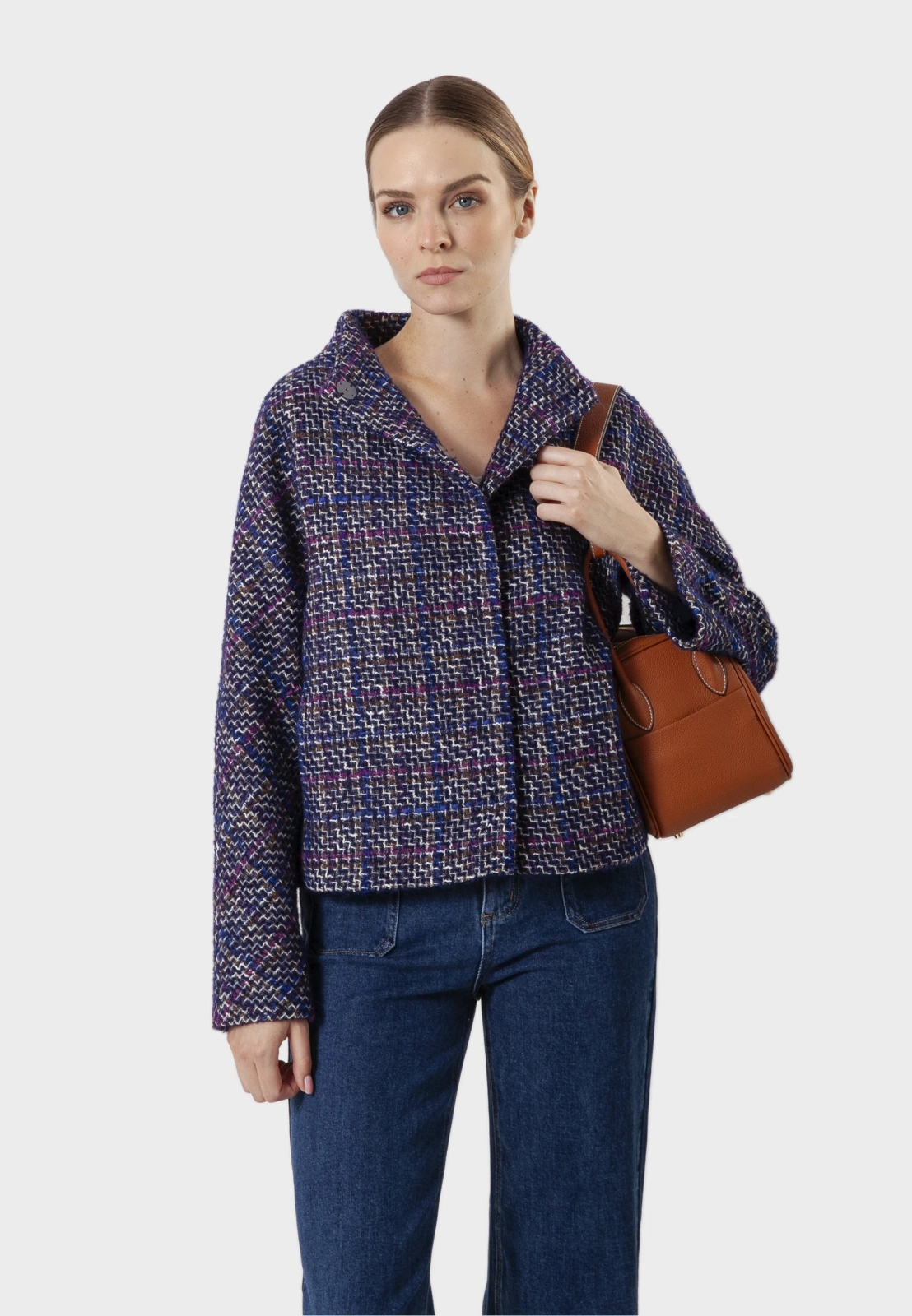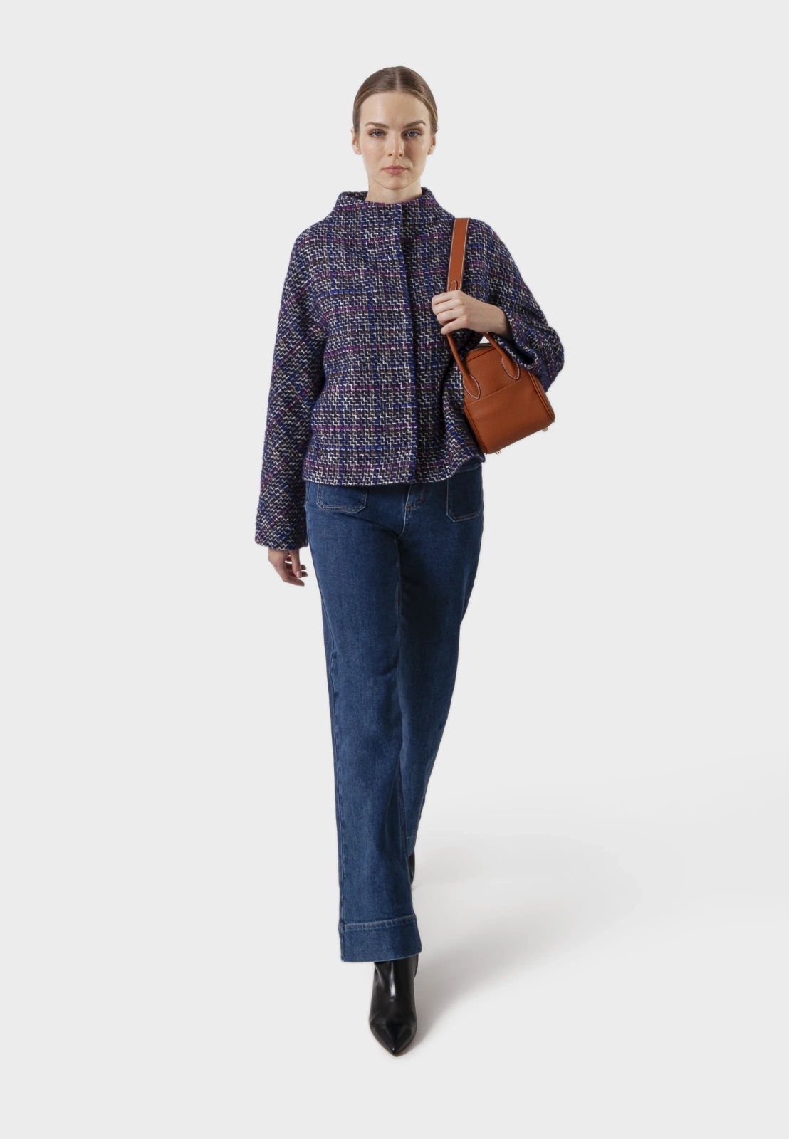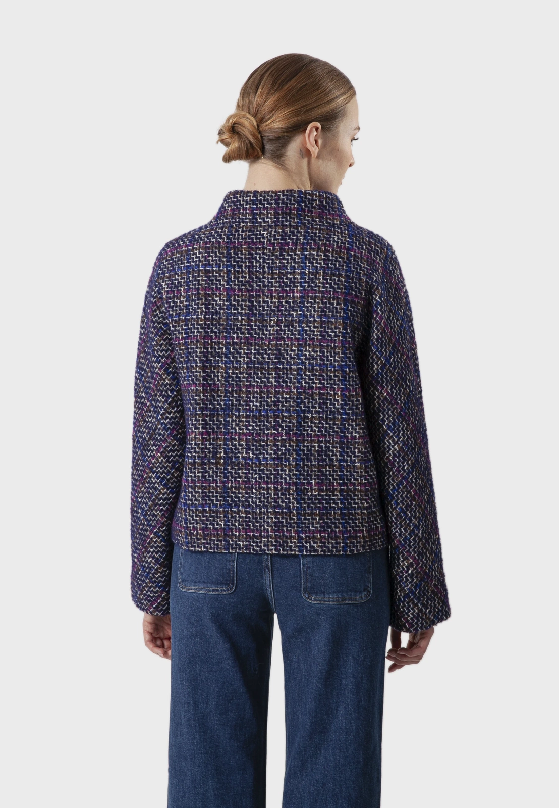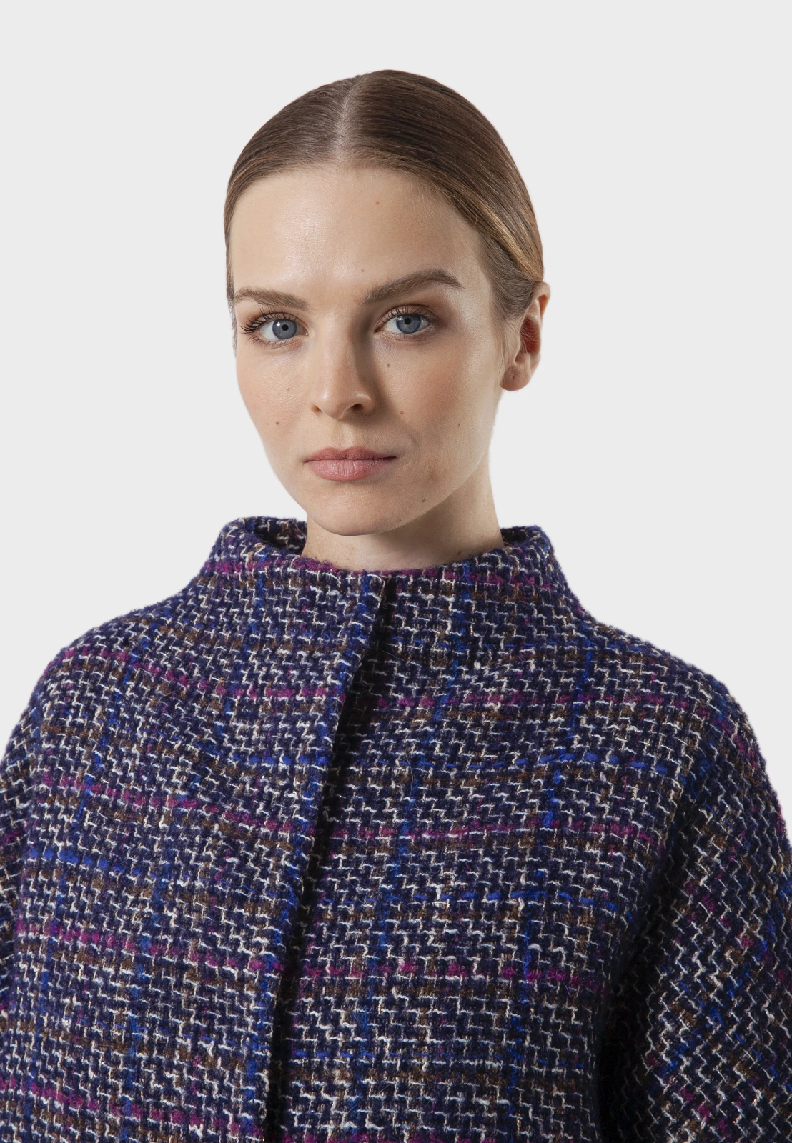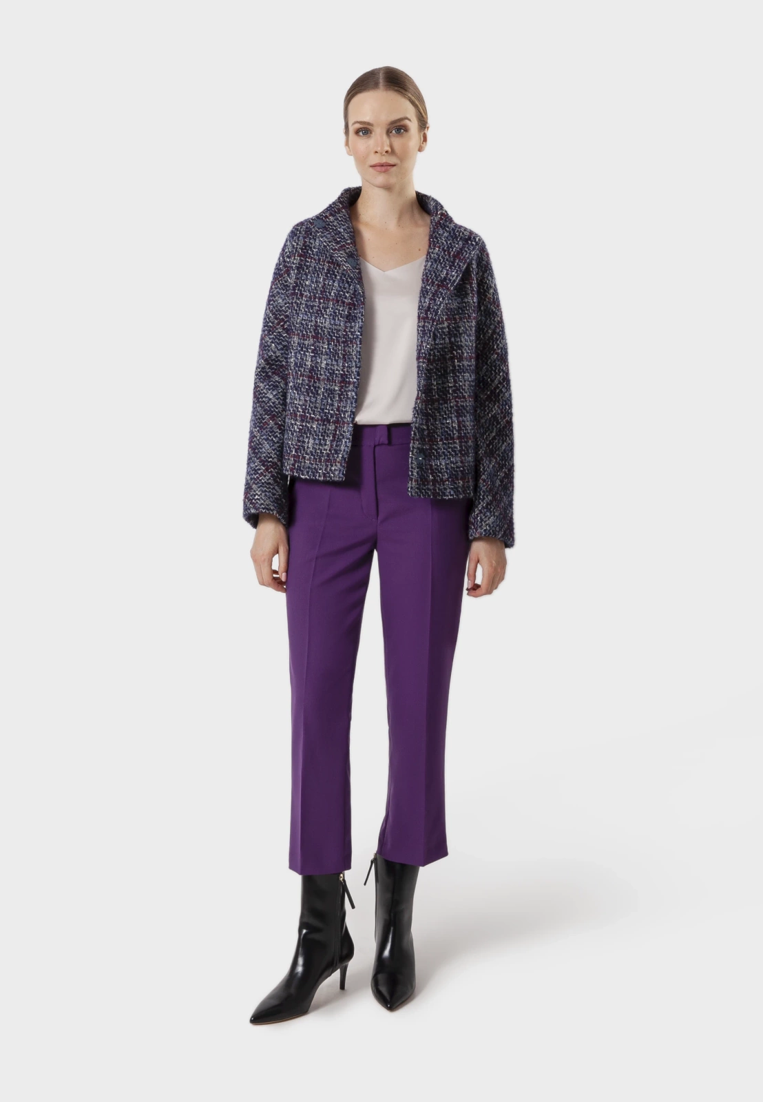 Pudełkowa kurtka bouclé w kratę wykonana z tkaniny z wełną jagnięcą i moherową. Ma prosty fason ze stójką, którą możesz wywijać, dodając całości oryginalnego charakteru. Łączy w sobie odcienie fioletu i granatu. Jest zapinana na zatrzaski. Świetnie prezentuje się zarówno w casualowych zestawach z jeansowymi spodniami, jak i z eleganckimi cygaretkami.