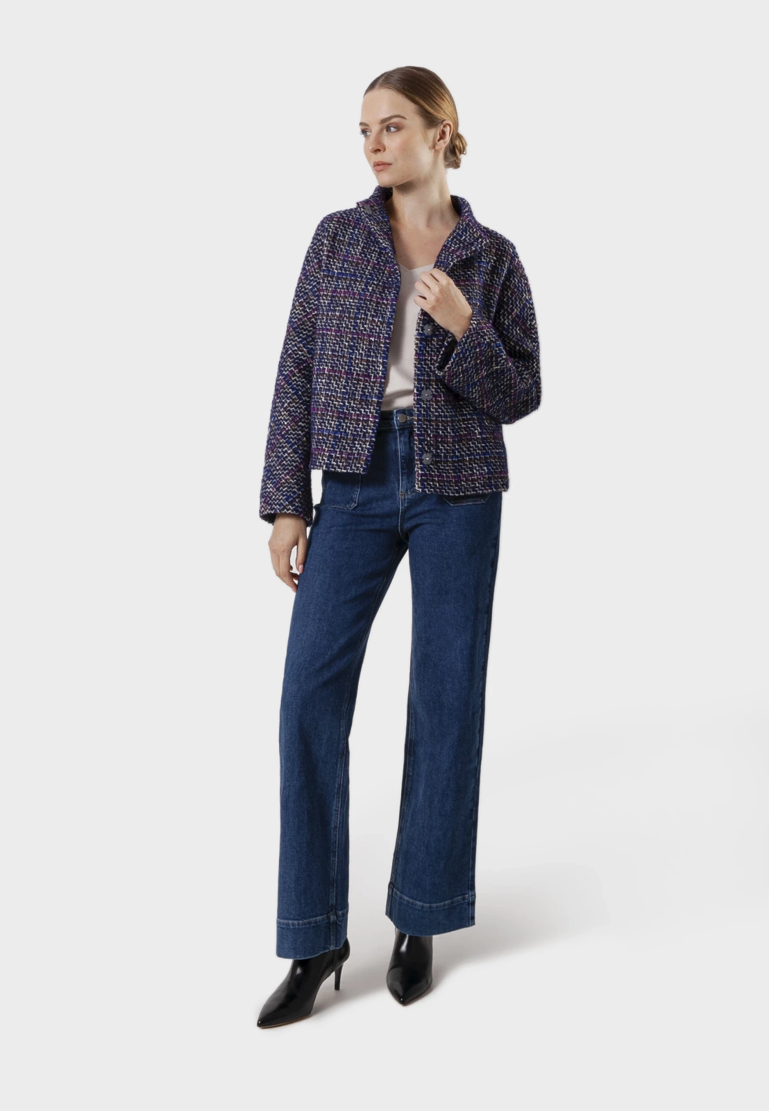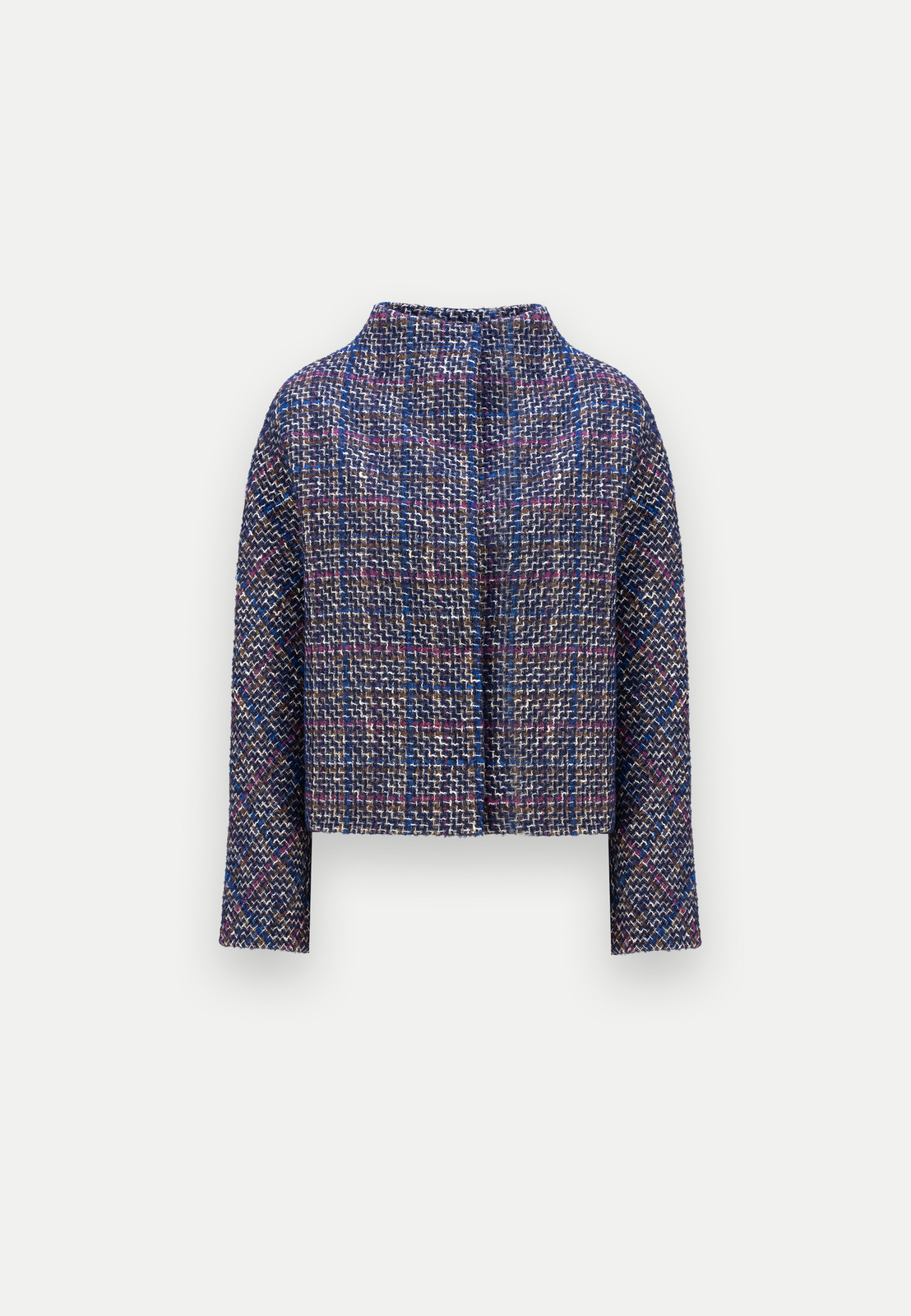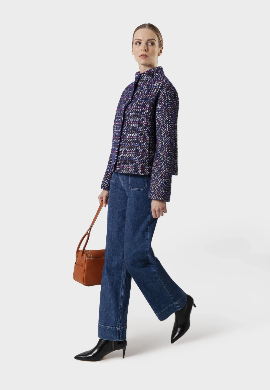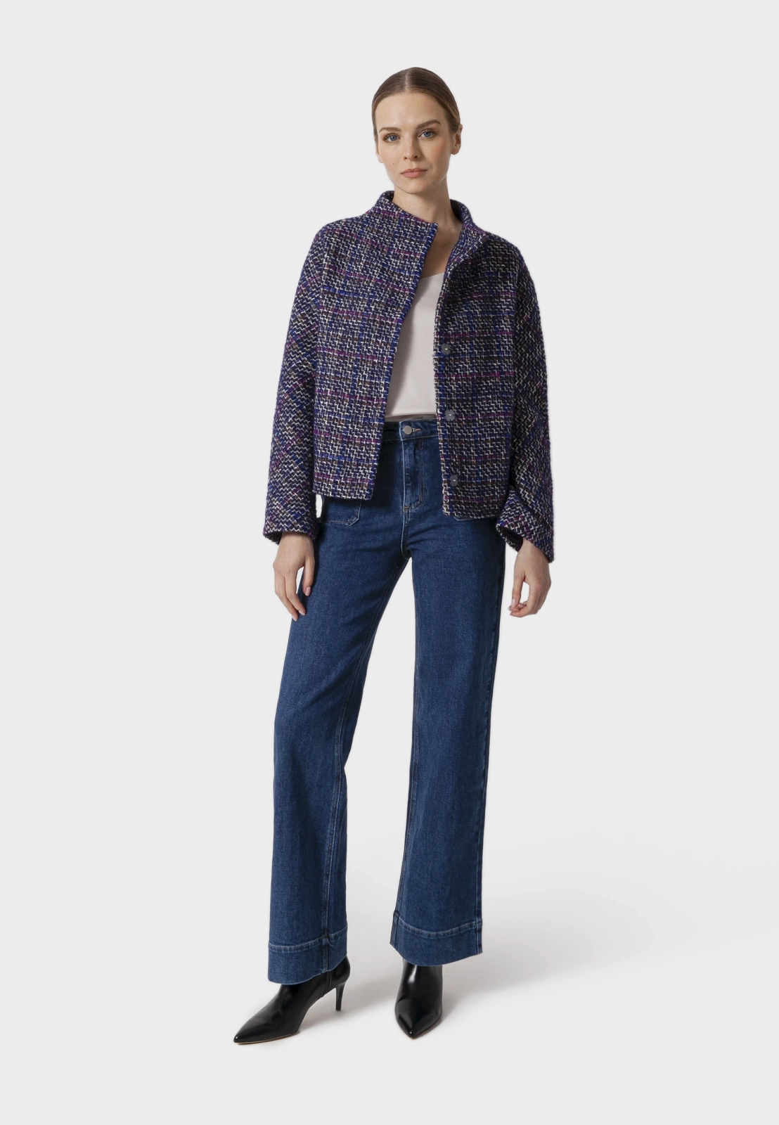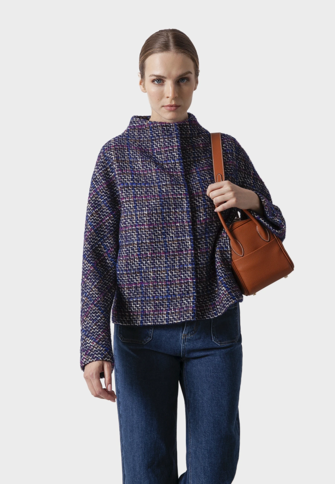 Pudełkowa kurtka bouclé w kratę wykonana z tkaniny z wełną jagnięcą i moherową. Ma prosty fason ze stójką, którą możesz wywijać, dodając całości oryginalnego charakteru. Łączy w sobie odcienie fioletu i granatu. Jest zapinana na zatrzaski. Świetnie prezentuje się zarówno w casualowych zestawach z jeansowymi spodniami, jak i z eleganckimi cygaretkami.