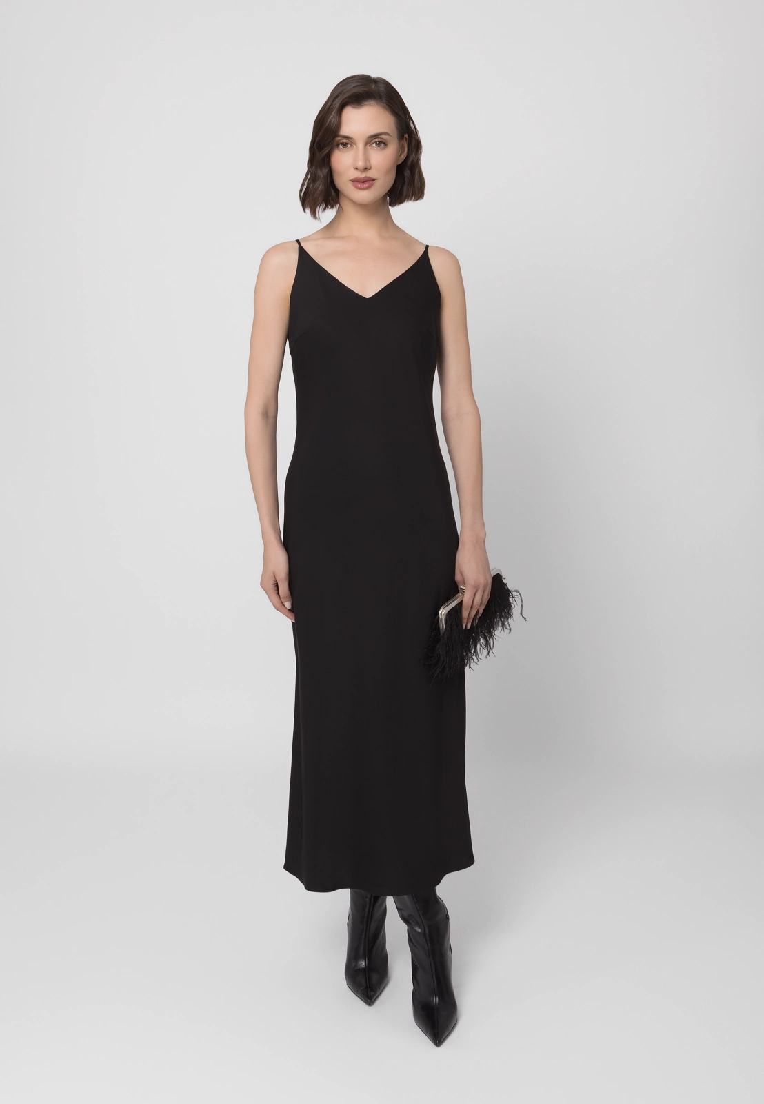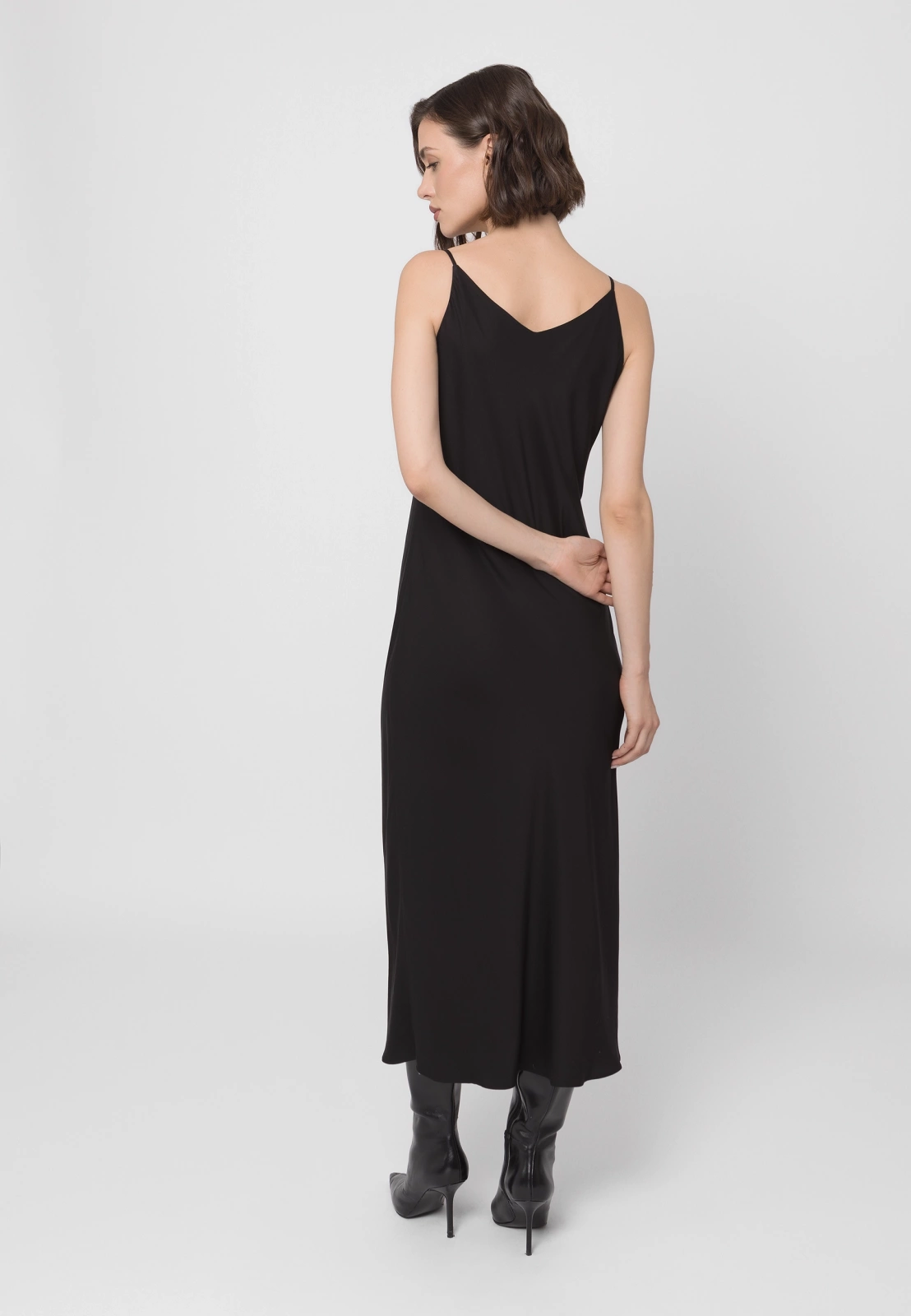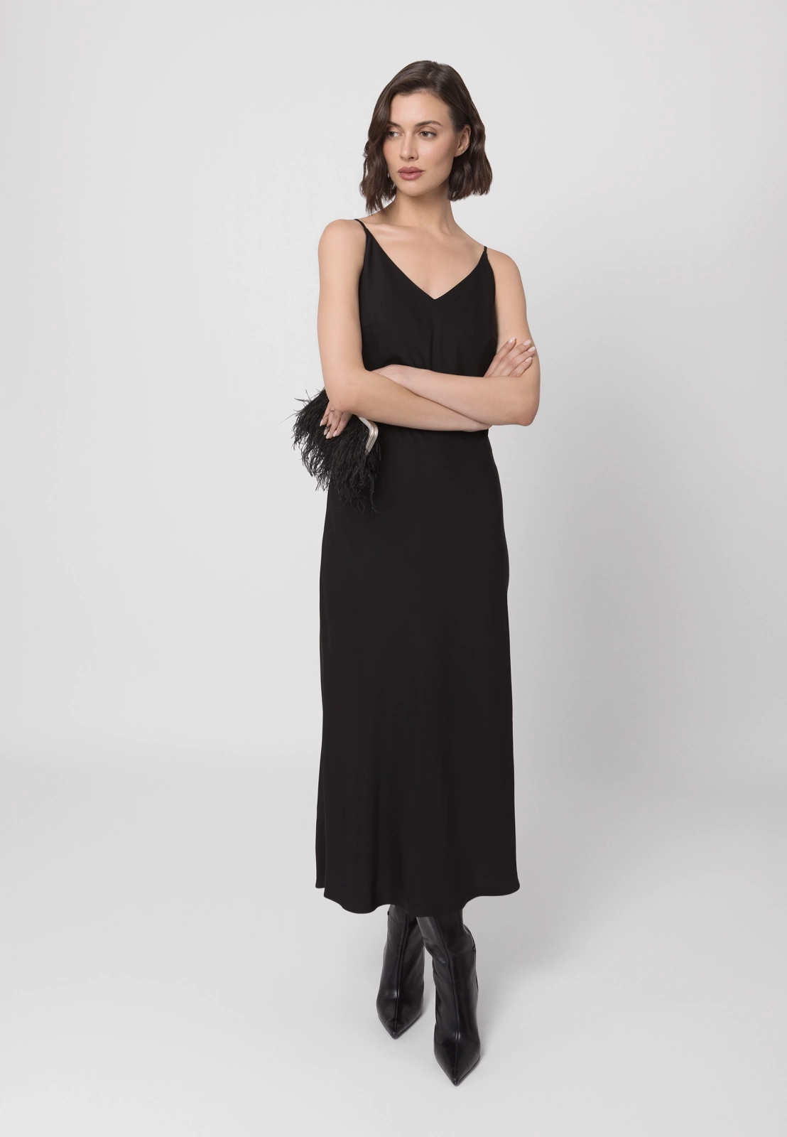 Gładka, lekko błyszcząca satynowa sukienka, która idealnie dopasowuje się do ciała, podkreślając naturalne linie figury. Delikatne, cienkie ramiączka oraz dekolt w kształcie litery V nadają sylwetce lekkości i wysmuklają szyję. Ta sukienka to połączenie minimalistycznego designu z subtelną kobiecością.