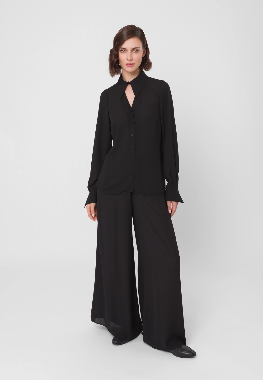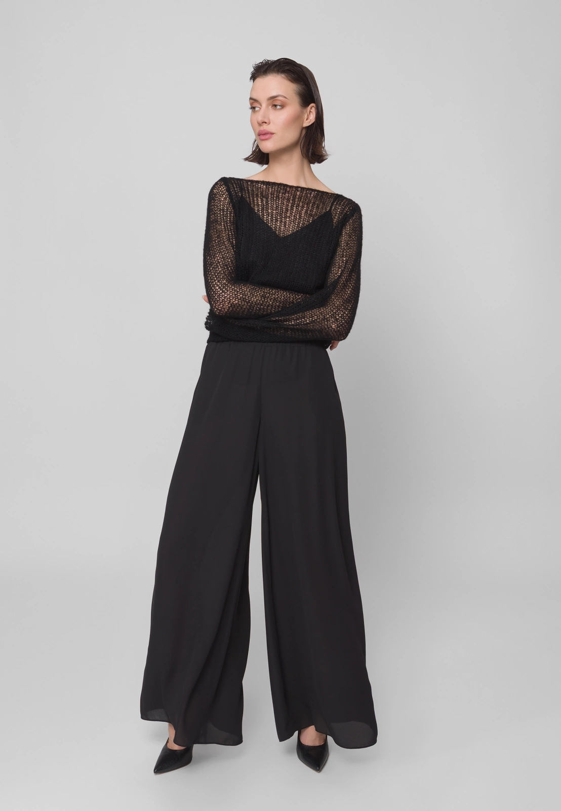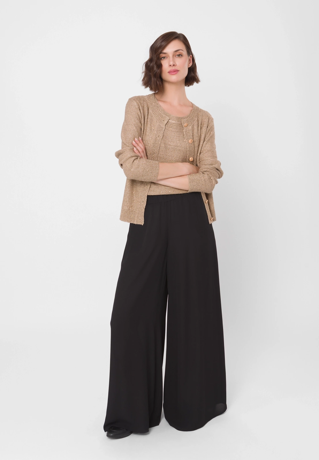 Spodnie palazzo z szeroką nogawką, zostały uszyte z lekkiej, lejącej tkaniny, która pięknie układa się w ruchu i nadaje sylwetce lekkości. Bardzo szeroka nogawka tworzy efektowne linie, a elastyczna talia na gumkę zapewnia wygodę i idealne dopasowanie.