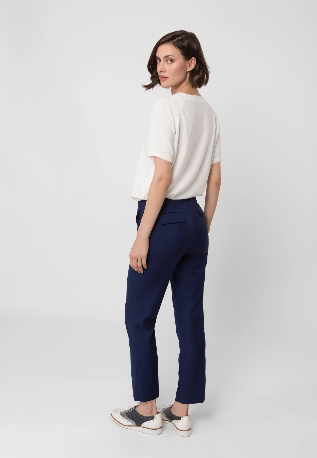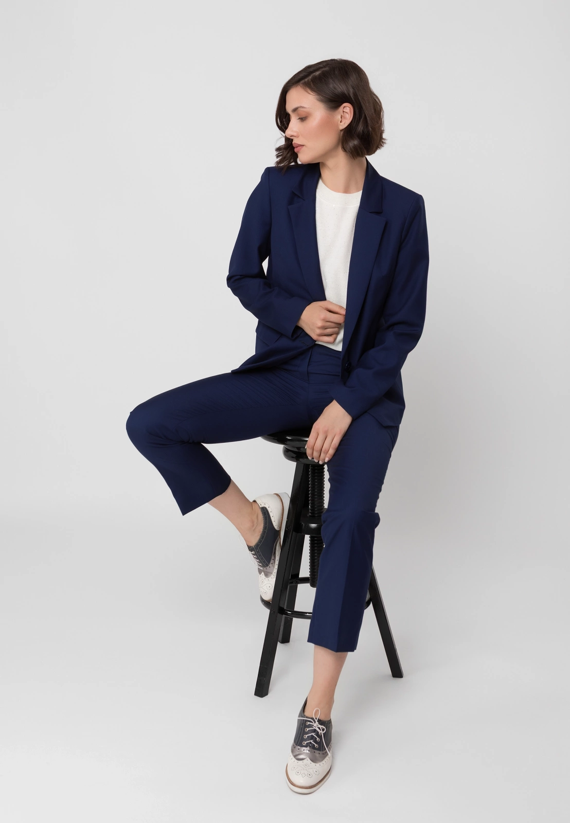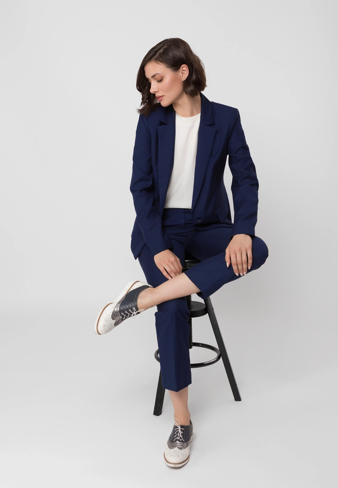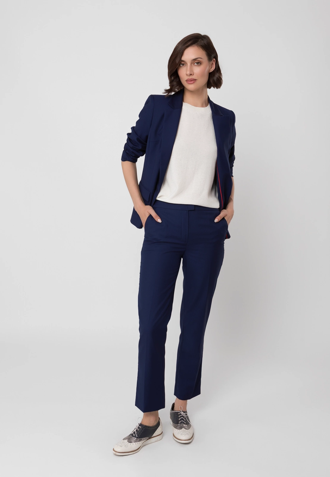 Granatowe spodnie w kant o prostej nogawce to klasyka w nowoczesnym wydaniu. Wykonane z tkaniny z domieszką wiskozy, zapewniają komfort noszenia i elegancki wygląd. Model wyposażony w praktyczne kieszenie z przodu oraz ozdobne klapy z tyłu, które dodają charakteru i podkreślają staranne wykończenie. Doskonale komponują się z marynarką uszytą z tego samego materiału i w tym samym odcieniu, tworząc spójny damski garnitur idealny na biznesowe wyjścia, spotkania i formalne stylizacje.