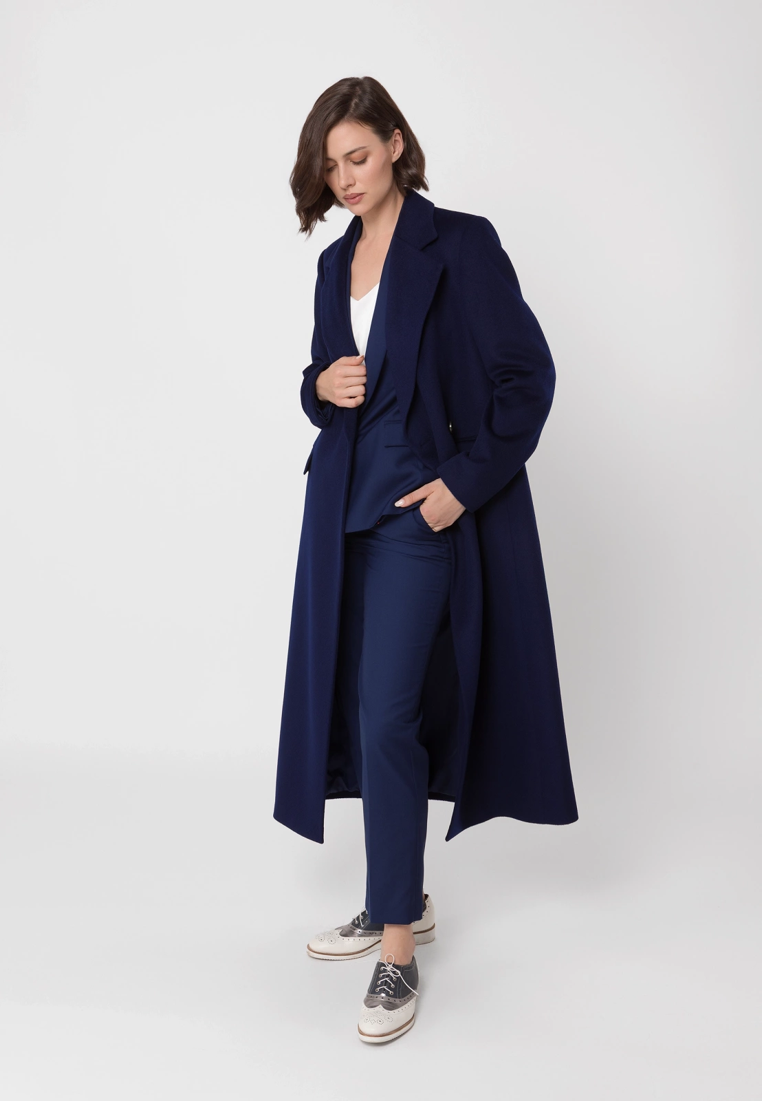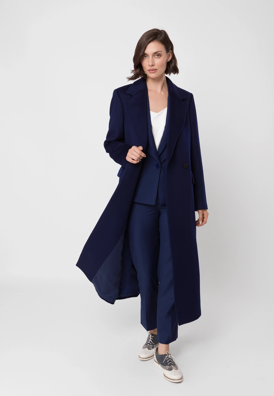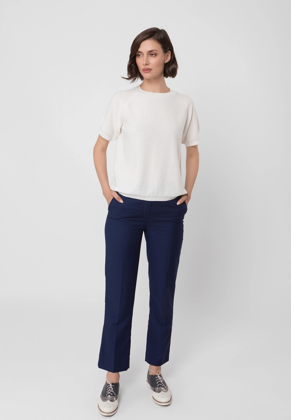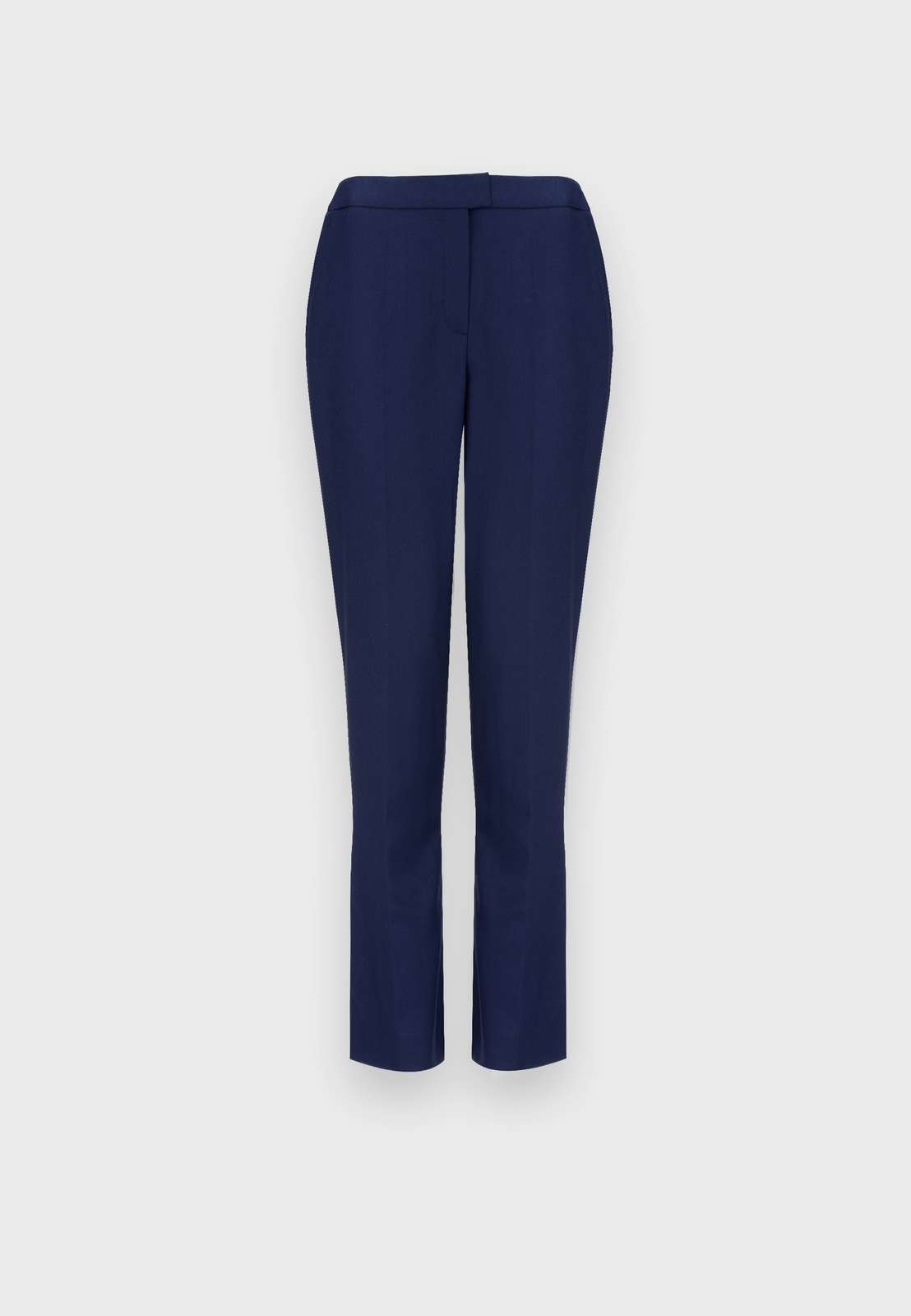 Granatowe spodnie w kant o prostej nogawce to klasyka w nowoczesnym wydaniu. Wykonane z tkaniny z domieszką wiskozy, zapewniają komfort noszenia i elegancki wygląd. Model wyposażony w praktyczne kieszenie z przodu oraz ozdobne klapy z tyłu, które dodają charakteru i podkreślają staranne wykończenie. Doskonale komponują się z marynarką uszytą z tego samego materiału i w tym samym odcieniu, tworząc spójny damski garnitur idealny na biznesowe wyjścia, spotkania i formalne stylizacje.