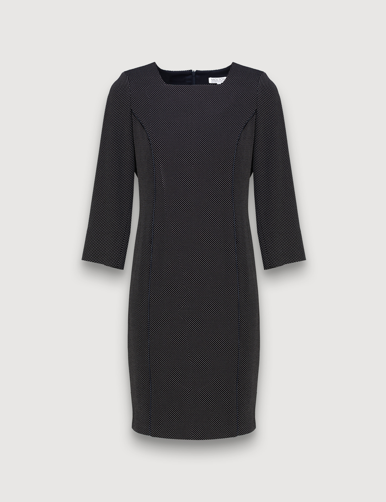 Oficjalne spotkanie, ważny dzień w pracy lub innego rodzaju uroczystość to okazje, które wymagają przyłożenia szczególnej uwagi do stylizacji. Klasyczna biznesowa sukienka sprawdzi się wtedy idealnie. Dopasowany, taliowany krój o ołówkowej dolnej części subtelnie podkreśla kobiecą sylwetkę. Tkanina wierzchnia jest pokryta drobnym wzorem w białe groszki.