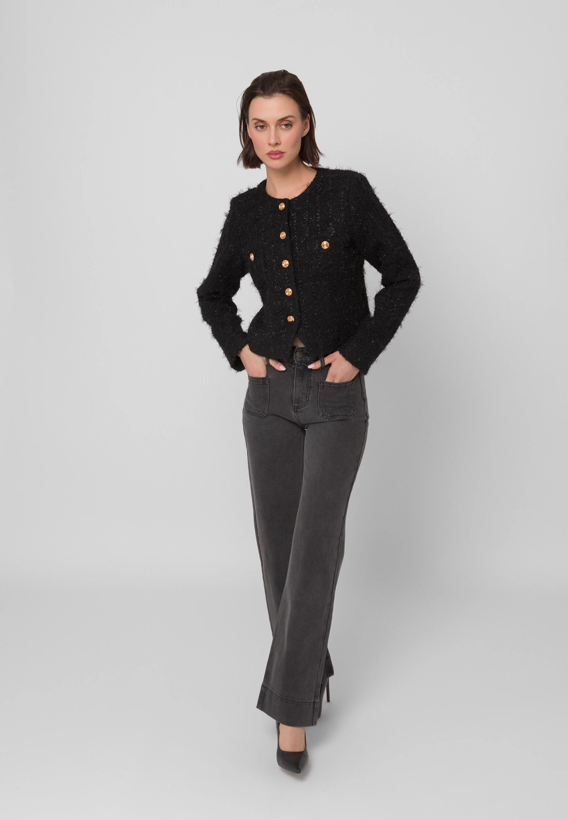 Ciemnoszare jeansy o szerokiej nogawce i wysokim stanie to stylowy wybór dla osób ceniących wygodę i nowoczesny look. Wykonane z miękkiej, elastycznej bawełny, zapewniają komfort noszenia przez cały dzień. Długie, luźne nogawki nadają sylwetce lekkości i swobodnego charakteru, a praktyczne kieszenie z przodu i z tyłu dodają funkcjonalności. Ciemnoszary odcień jest uniwersalny, łatwo łączy się z innymi elementami garderoby, a wysoki stan optycznie wydłuża nogi. Jeansy dostępne również w klasycznym granatowym kolorze.