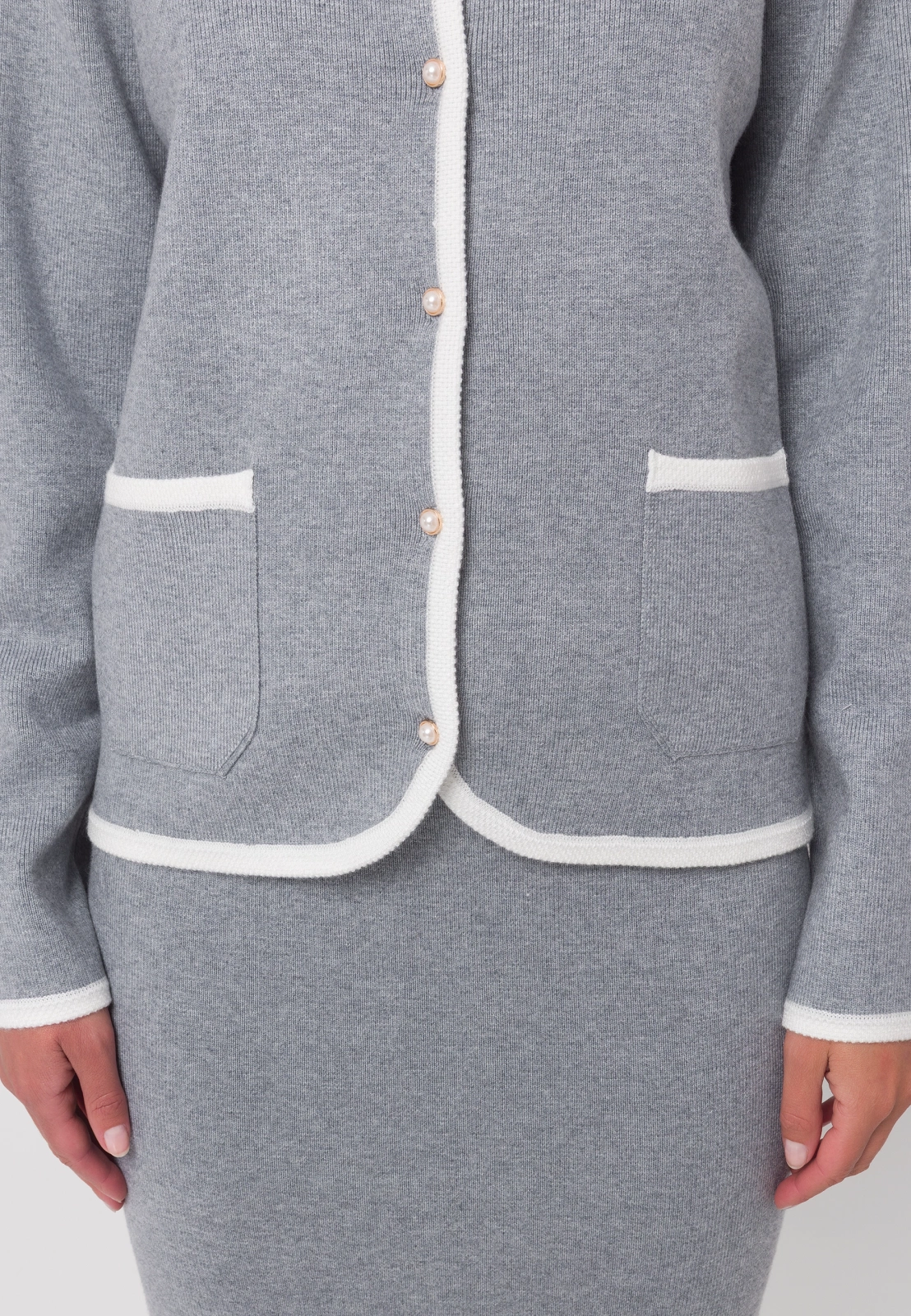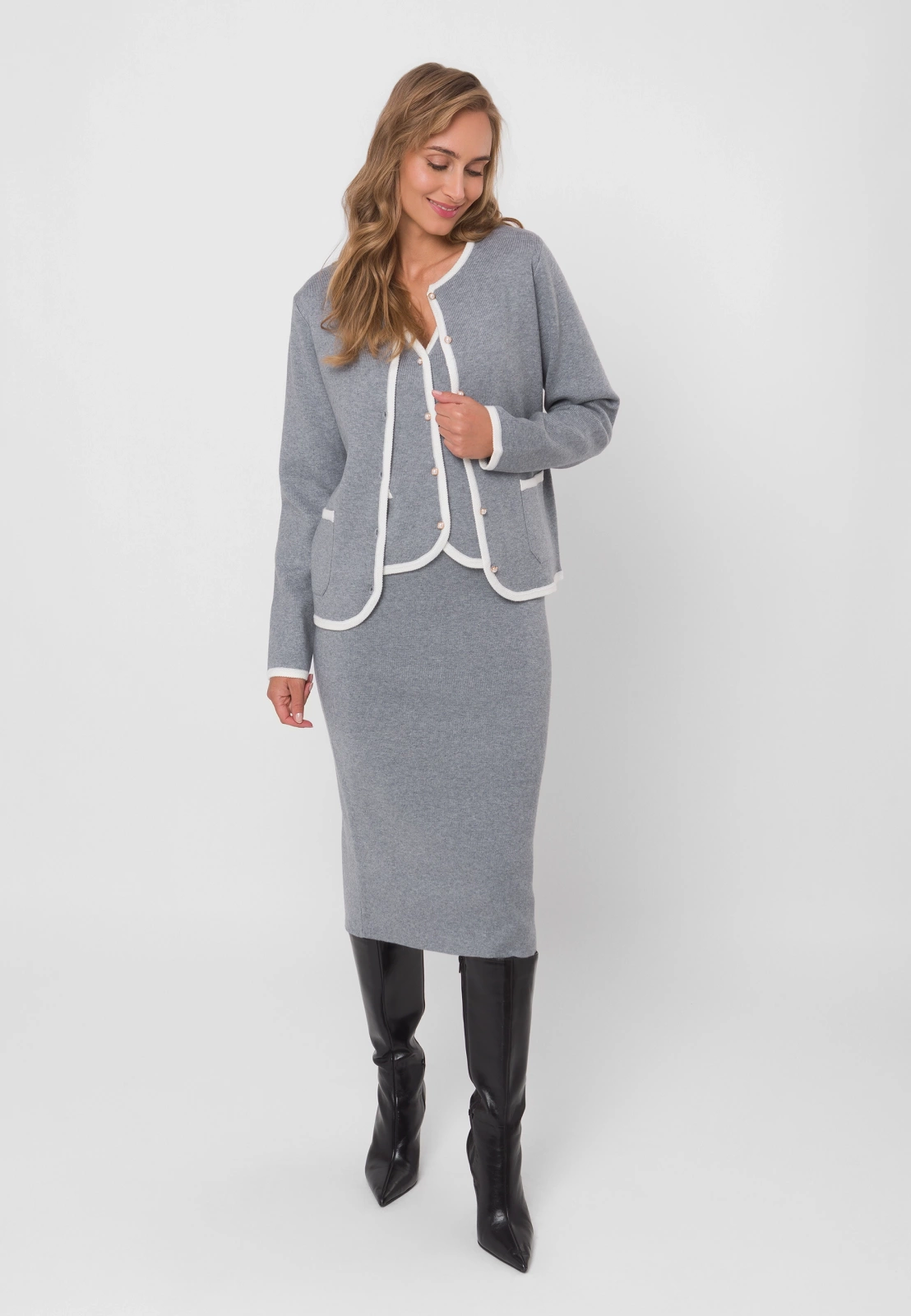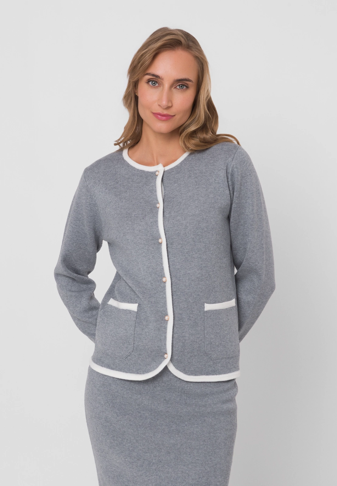 Szary dzianinowy kardigan z białym obszyciem i kieszonkami to elegancka i praktyczna propozycja na chłodniejsze dni. Wykonany z domieszką wełny, jest ciepły i przyjemny w dotyku, zapewniając komfort noszenia. Okrągłe wykończenie przy szyi nadaje mu subtelnej elegancji, a kontrastujące białe obszycie podkreśla szykowny charakter kardigana. Idealny do codziennych stylizacji oraz jako stylowy element biurowego. W zestawie z szarą dzianinową kamizelką z białym obszyciem oraz dopasowaną spódnicą, stworzą spójny i modny komplet – idealny zarówno do codziennych, jak i eleganckich stylizacji.