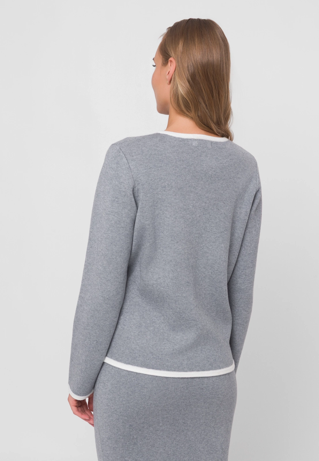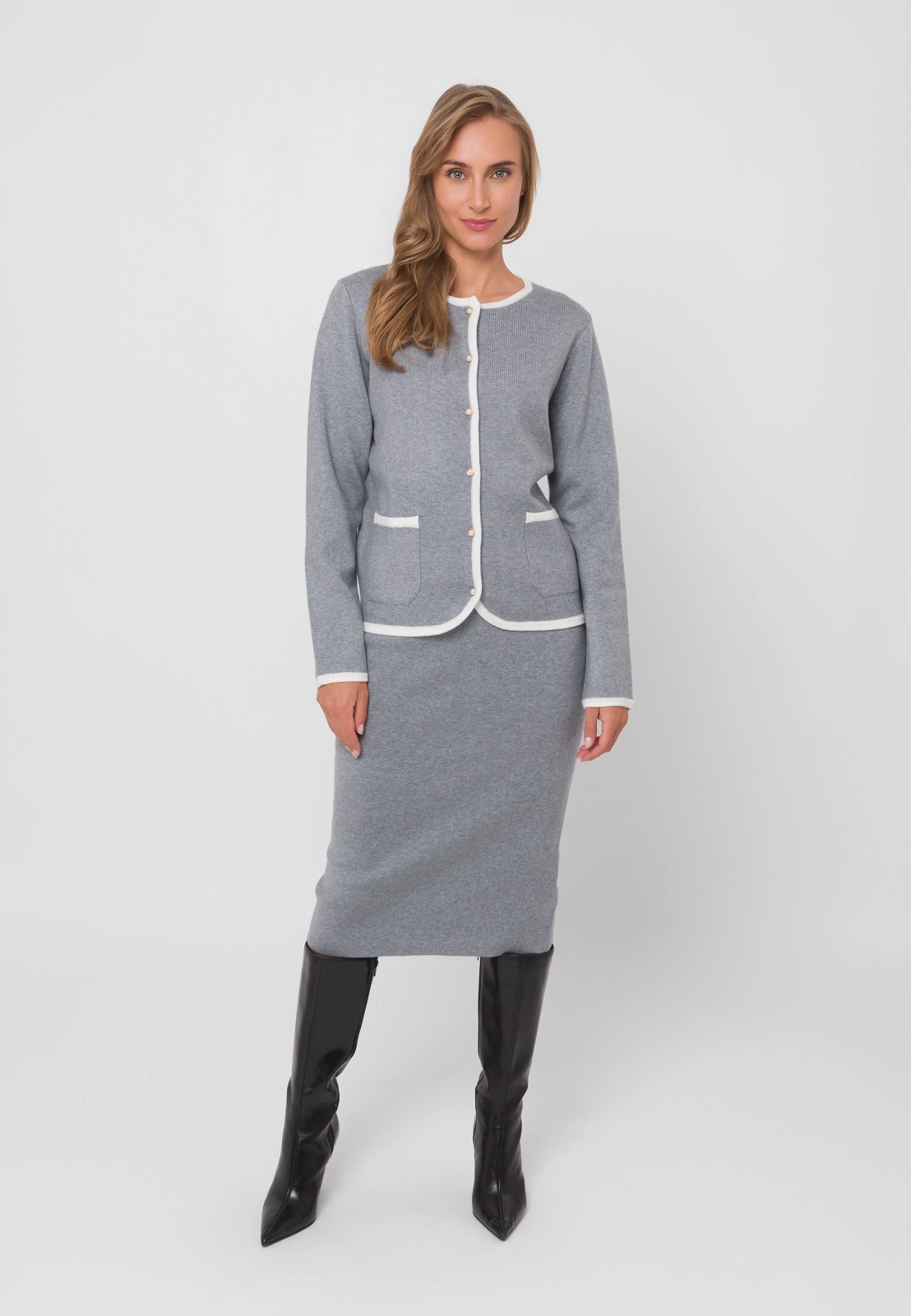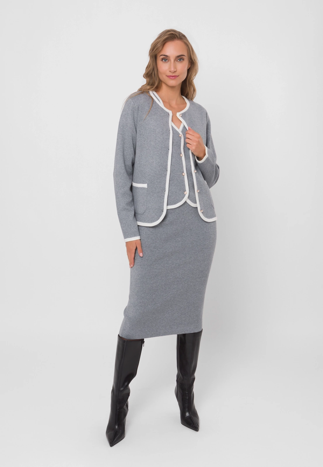 Szary dzianinowy kardigan z białym obszyciem i kieszonkami to elegancka i praktyczna propozycja na chłodniejsze dni. Wykonany z domieszką wełny, jest ciepły i przyjemny w dotyku, zapewniając komfort noszenia. Okrągłe wykończenie przy szyi nadaje mu subtelnej elegancji, a kontrastujące białe obszycie podkreśla szykowny charakter kardigana. Idealny do codziennych stylizacji oraz jako stylowy element biurowego. W zestawie z szarą dzianinową kamizelką z białym obszyciem oraz dopasowaną spódnicą, stworzą spójny i modny komplet – idealny zarówno do codziennych, jak i eleganckich stylizacji.