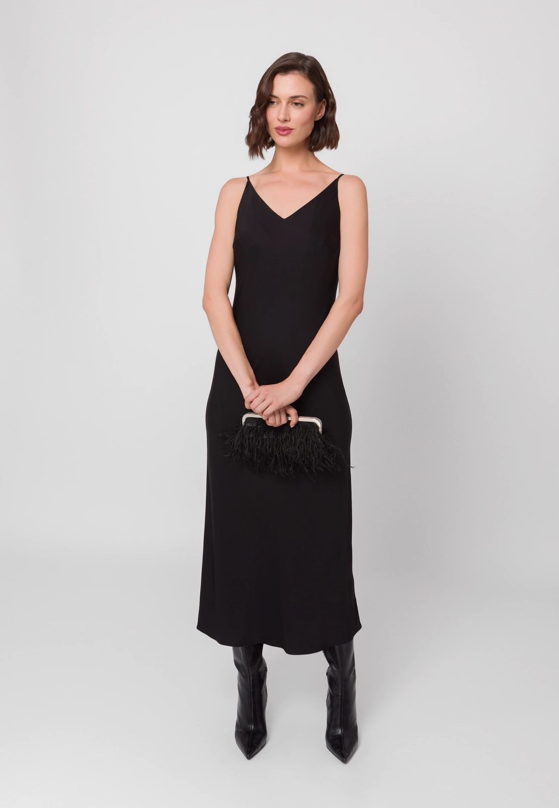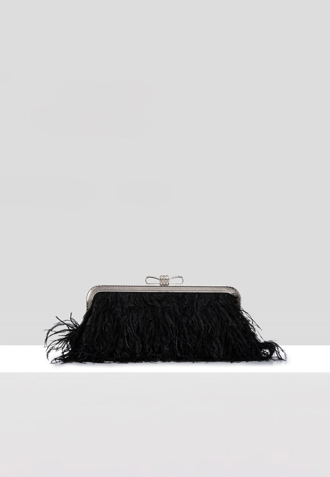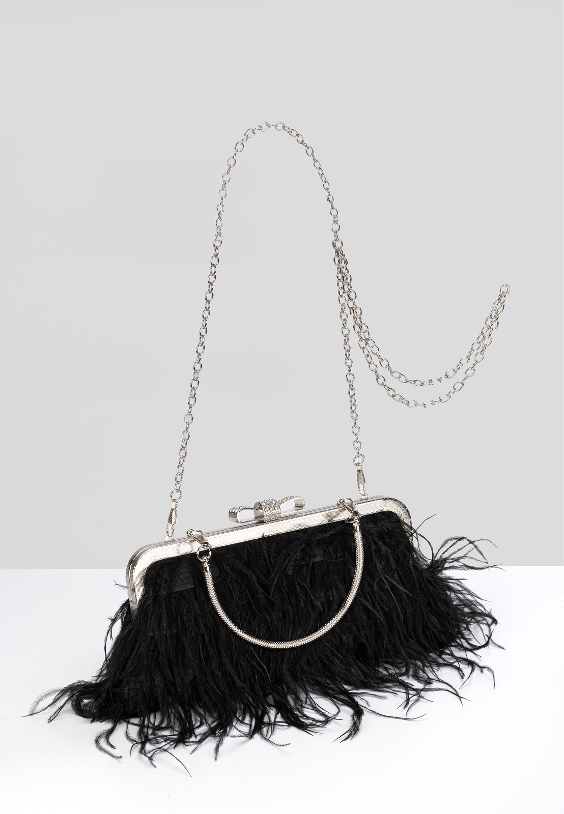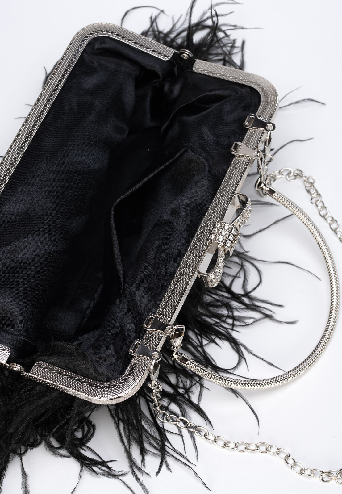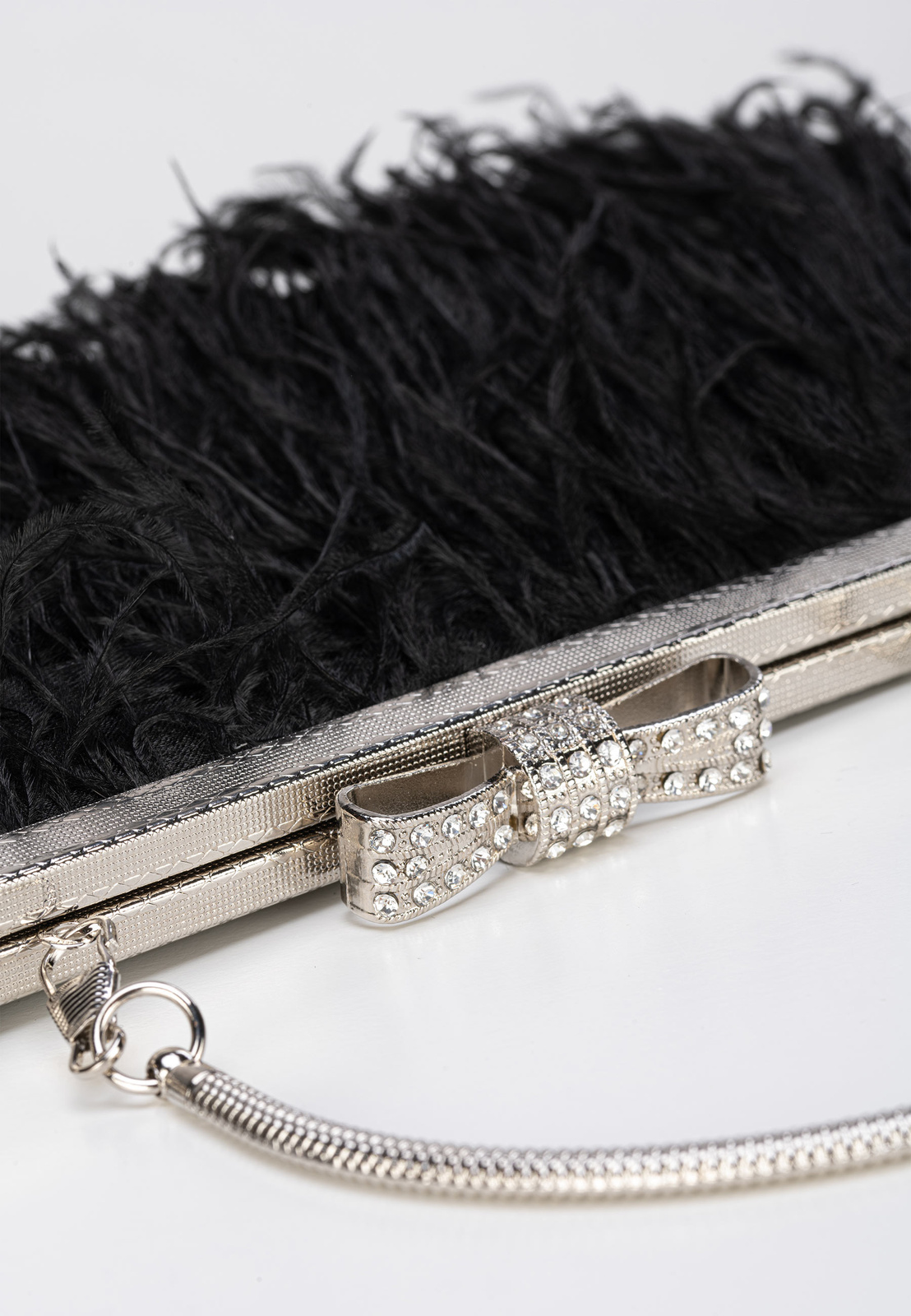 Czarna wieczorowa torebka z ozdobnymi piórami to kwintesencja elegancji i szyku. Przyciąga wzrok delikatnymi, czarnymi piórami oraz subtelnym srebrnym zapięciem w kształcie kokardki, które dodaje jej wyjątkowego uroku. Kompaktowa forma sprawia, że doskonale leży w dłoni, a dwa srebrne łańcuszki pozwalają nosić ją na różne sposoby – krótki łańcuszek do eleganckiego trzymania w dłoni, a dłuższy do wygodnego noszenia na ramieniu. To efektowny dodatek, który doskonale dopełni wieczorowe stylizacje – idealny na kolacje, przyjęcia i wyjątkowe okazje, gdy chcesz podkreślić swój niepowtarzalny styl.
