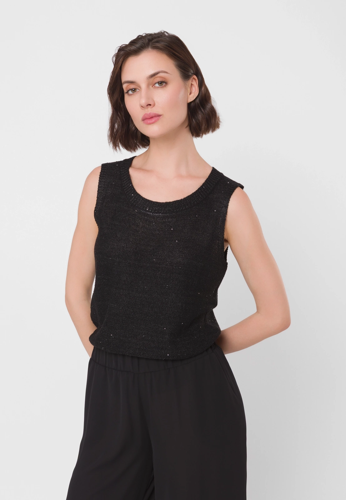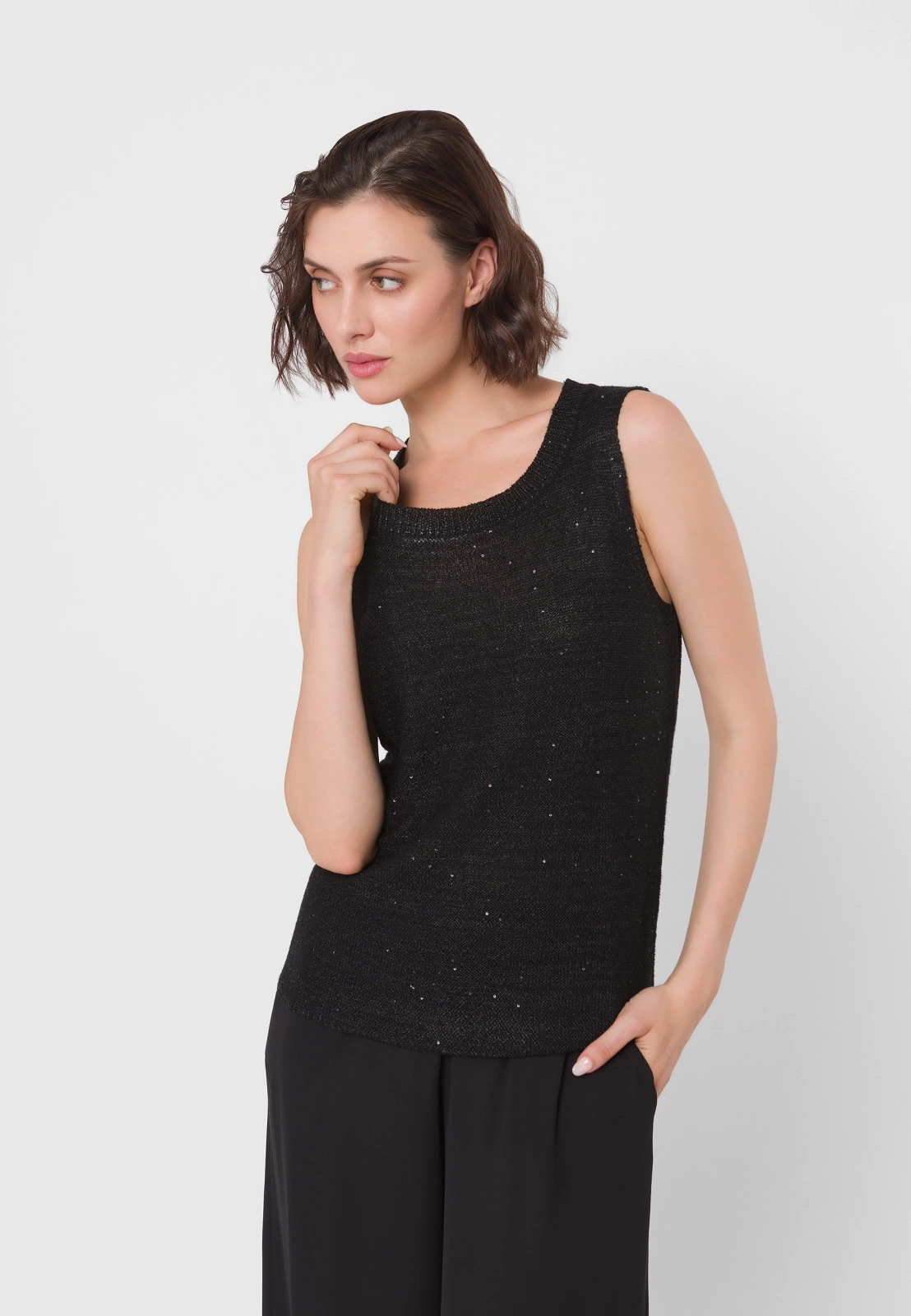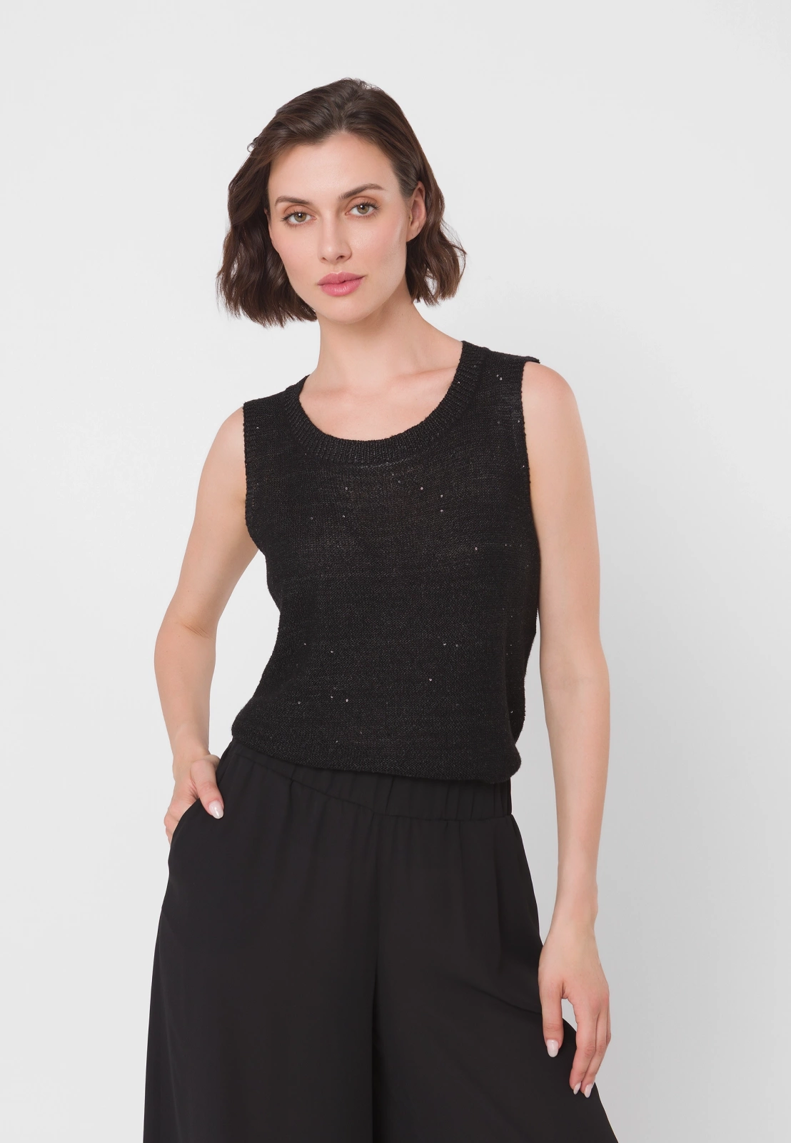 Dzianinowa bluzka z wiskozy w eleganckim, głębokim czarnym odcieniu. Prosty fason bez rekawów z okrągłym dekoltem podkreśla uniwersalny charakter ubrania. Całość zdobią drobne cekiny, które pięknie kontrastują z ciemnym materiałem, dodając bluzce szyku i elegancji. Doskonale sprawdzi się solo lub w duecie z cekinowym kardiganem z tej samej kolekcji. Model dostępny również w kolorze beżowym.