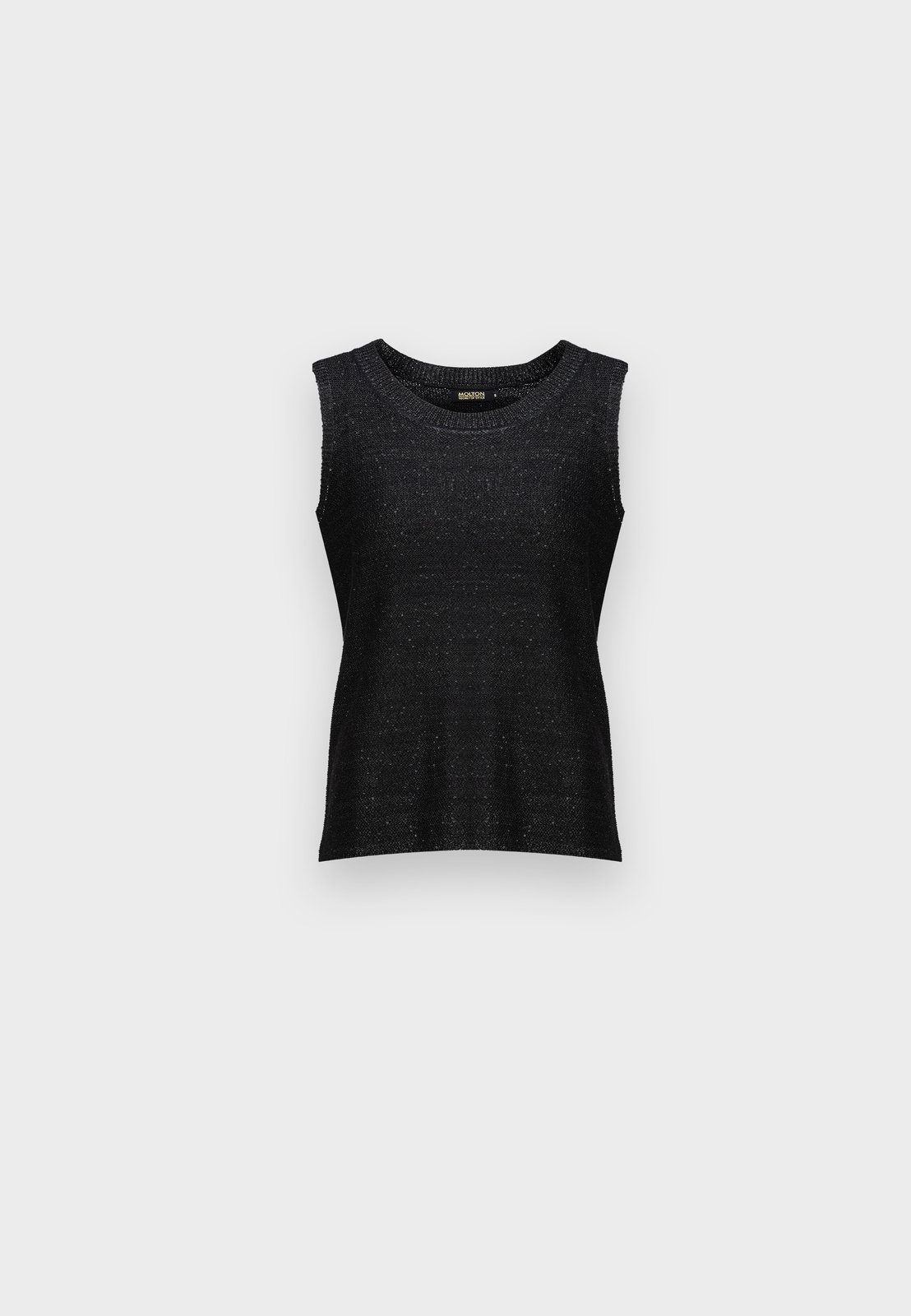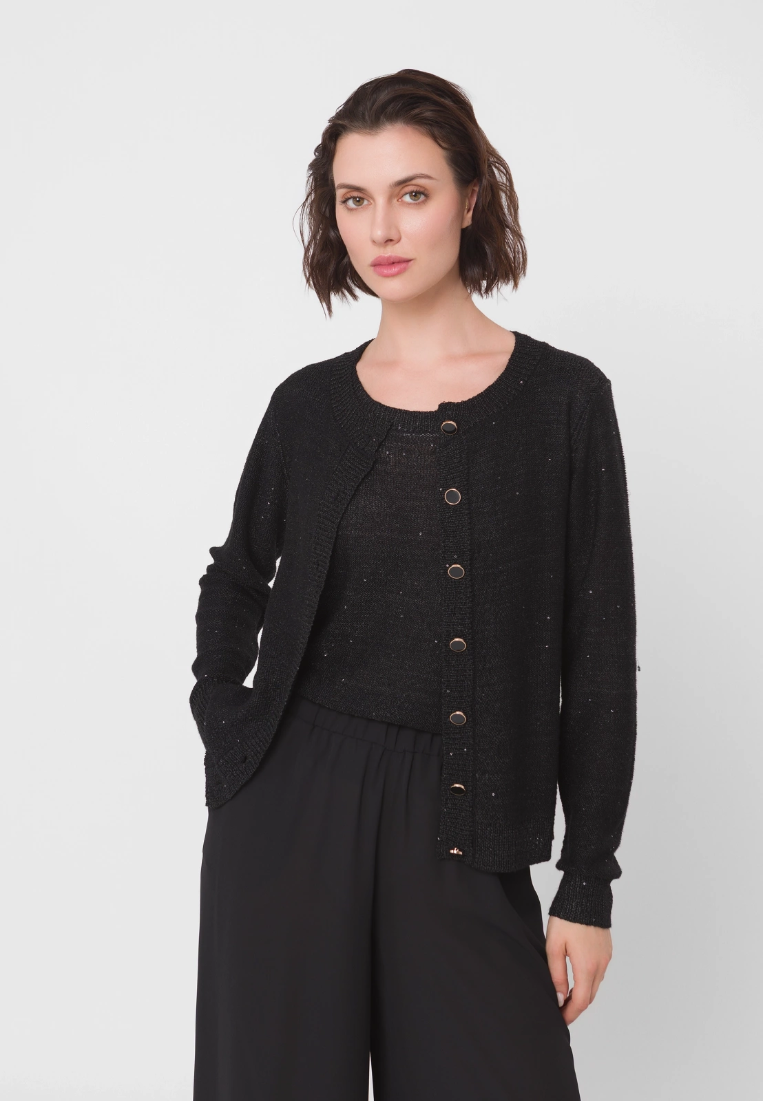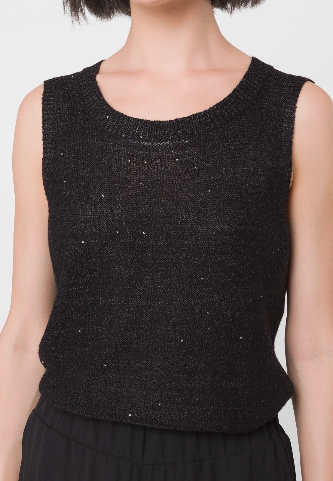 Dzianinowa bluzka z wiskozy w eleganckim, głębokim czarnym odcieniu. Prosty fason bez rekawów z okrągłym dekoltem podkreśla uniwersalny charakter ubrania. Całość zdobią drobne cekiny, które pięknie kontrastują z ciemnym materiałem, dodając bluzce szyku i elegancji. Doskonale sprawdzi się solo lub w duecie z cekinowym kardiganem z tej samej kolekcji. Model dostępny również w kolorze beżowym.