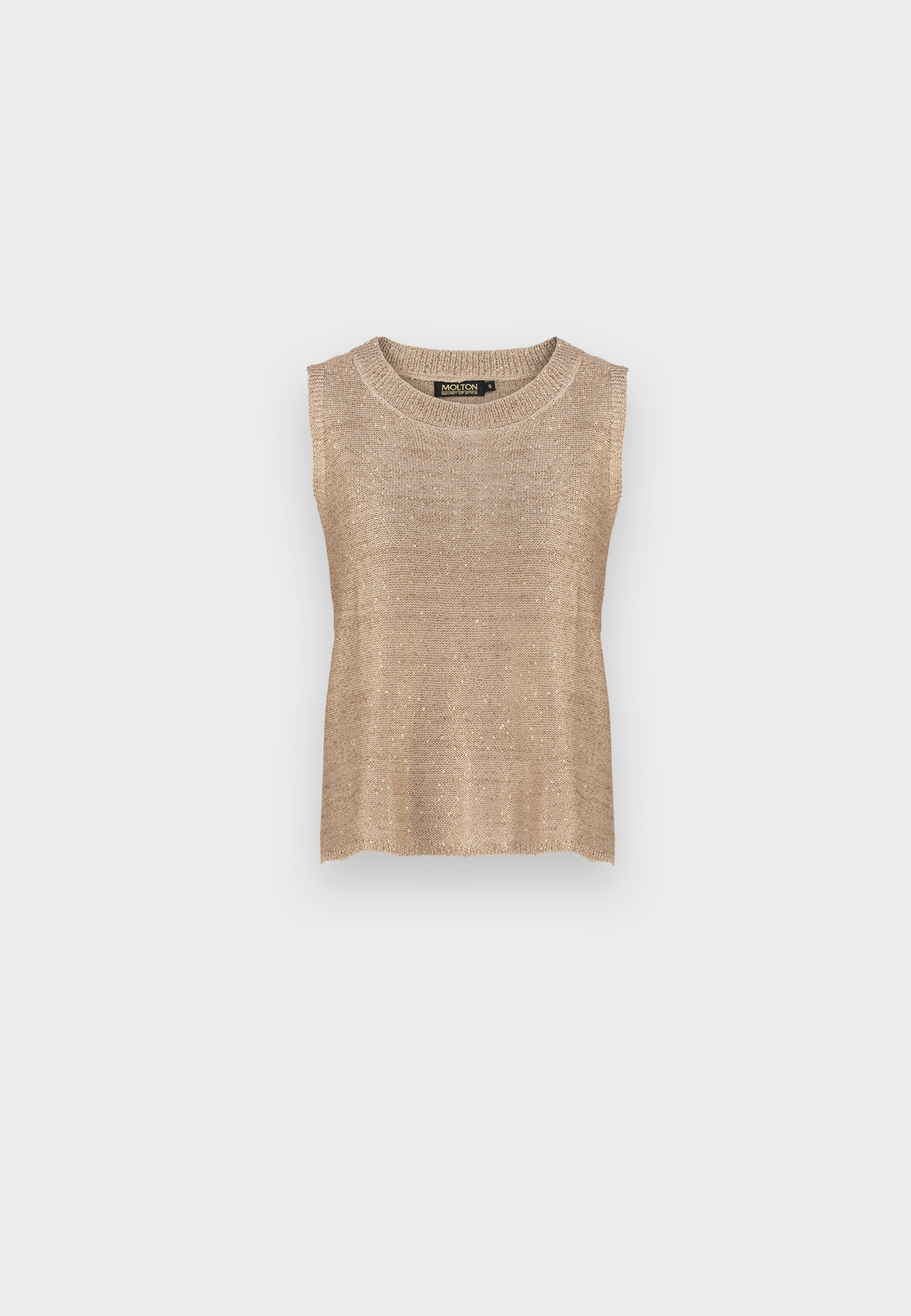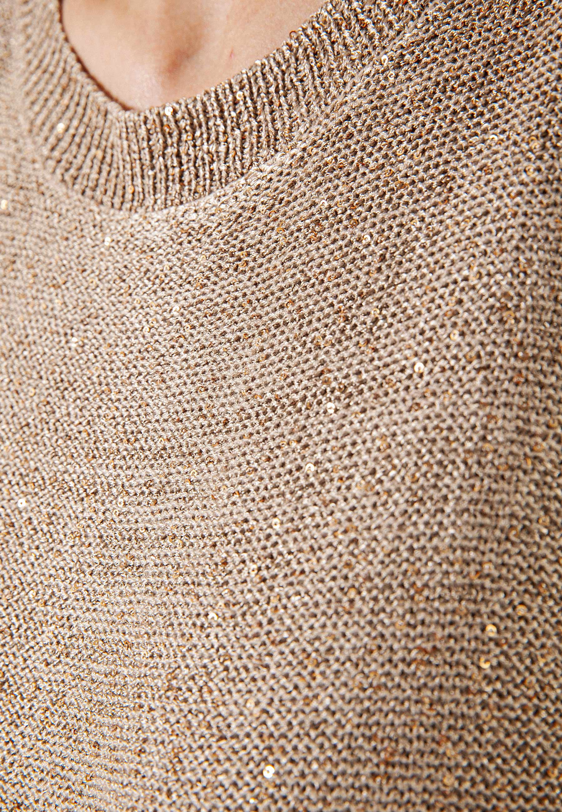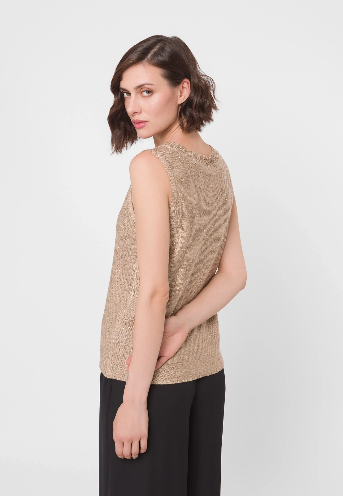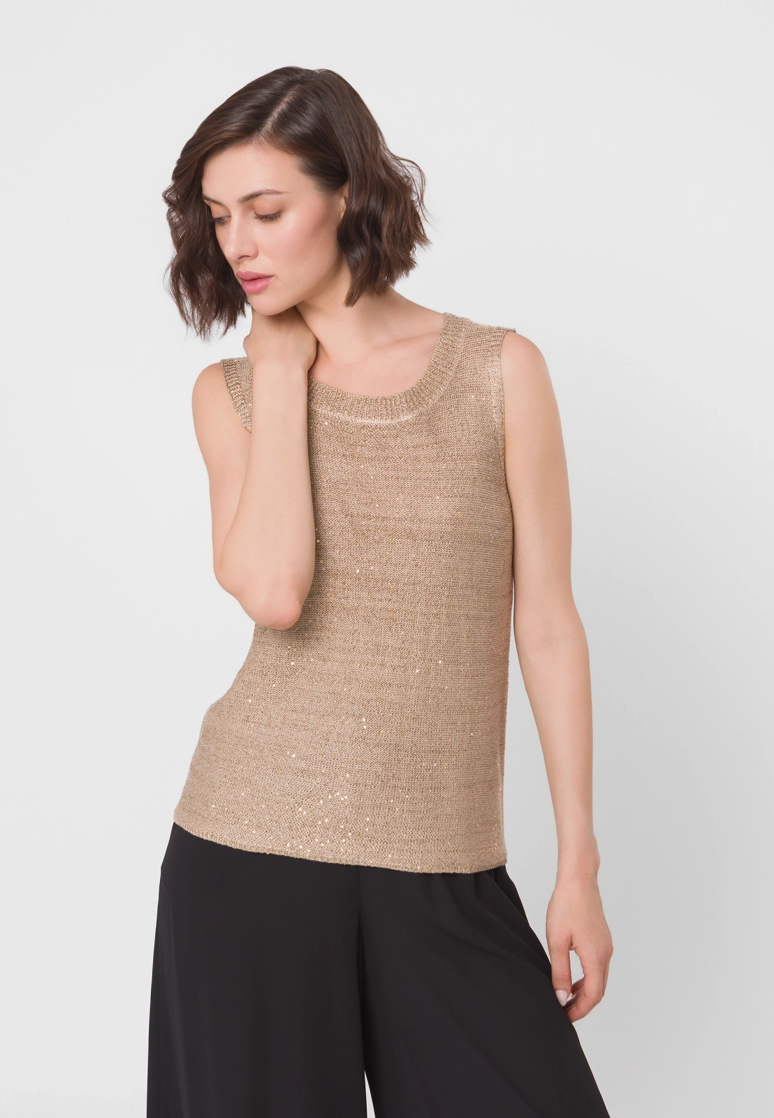 Dzianinowa bluzka z wiskozy w eleganckim, neutralnym odcieniu złotego beżu. Ma prosty fason bez rękawów z okrągłym dekoltem. Materiał zdobią złote cekiny, wplecione w całość, które doskonale się komponują z odcieniem przędzy. Bluzka sprawdzi się zarówno w wersji solo, jak i noszona w duecie z cekinowym kardiganem z tej samej kolekcji. Pasuje na sylwetki o różnych kształtach.