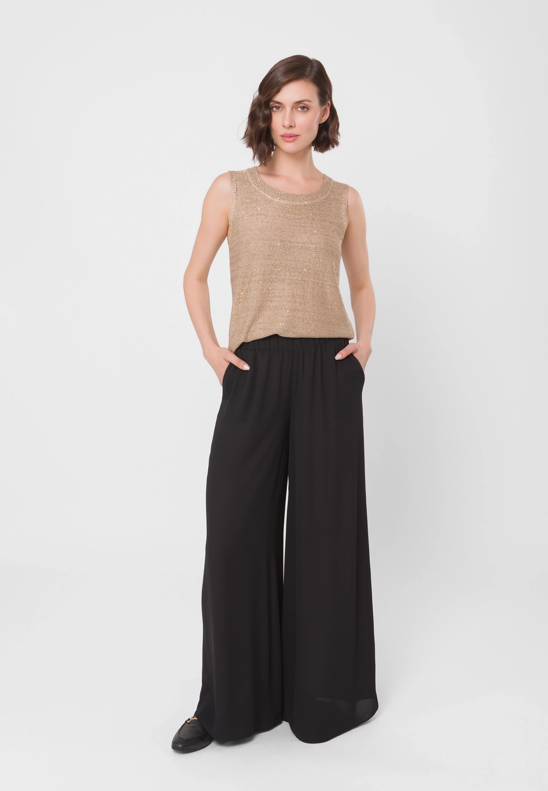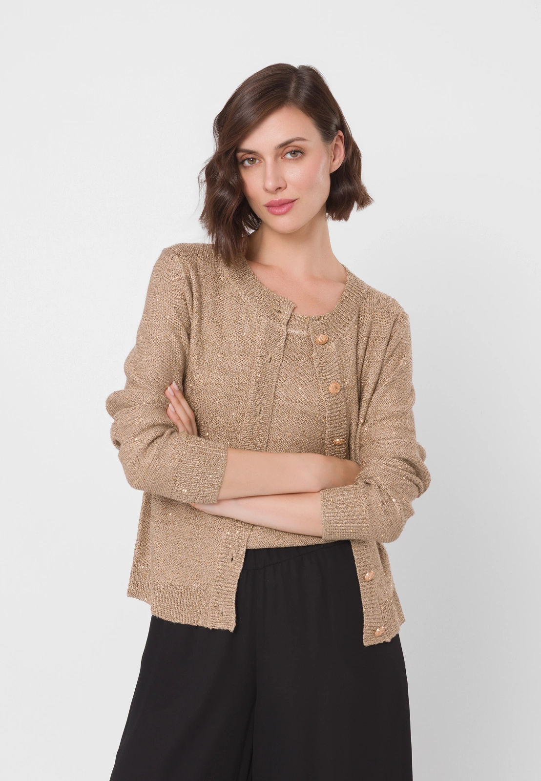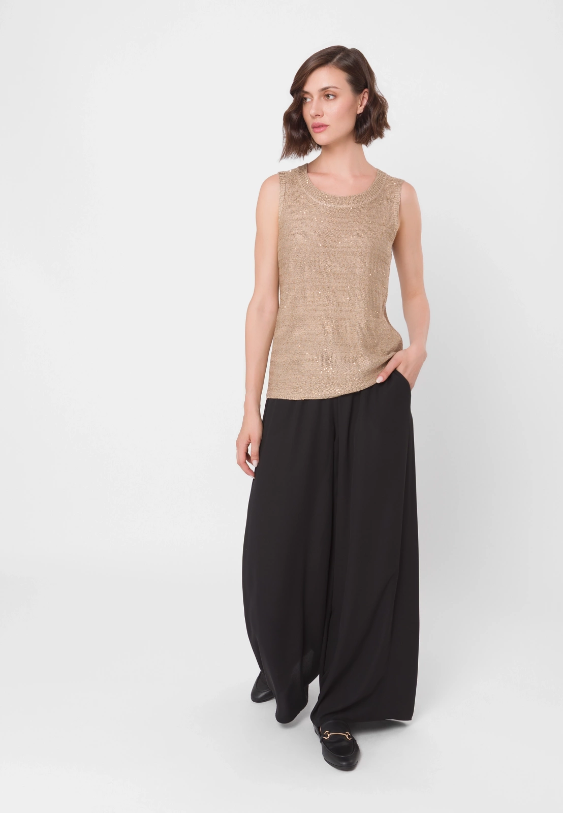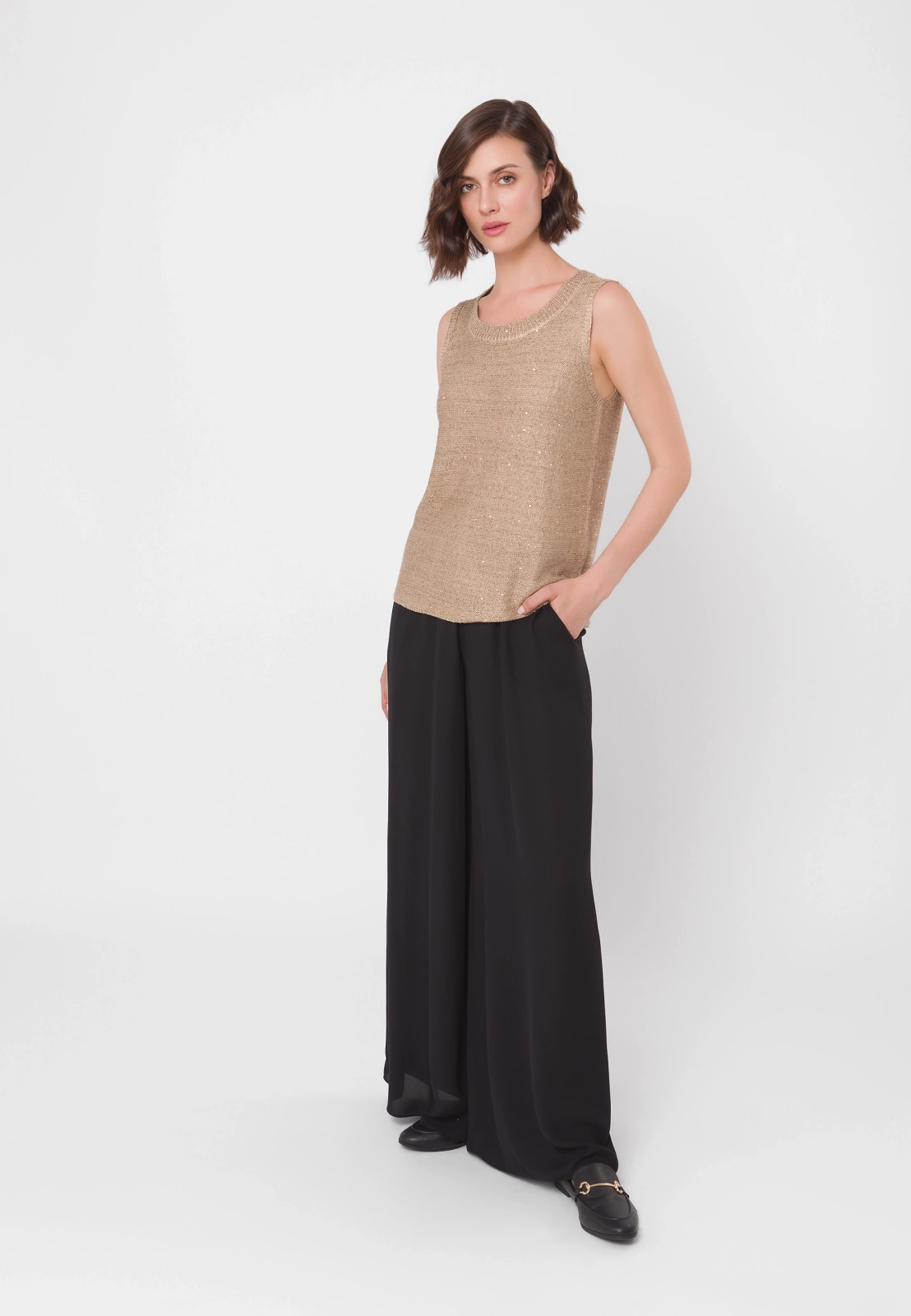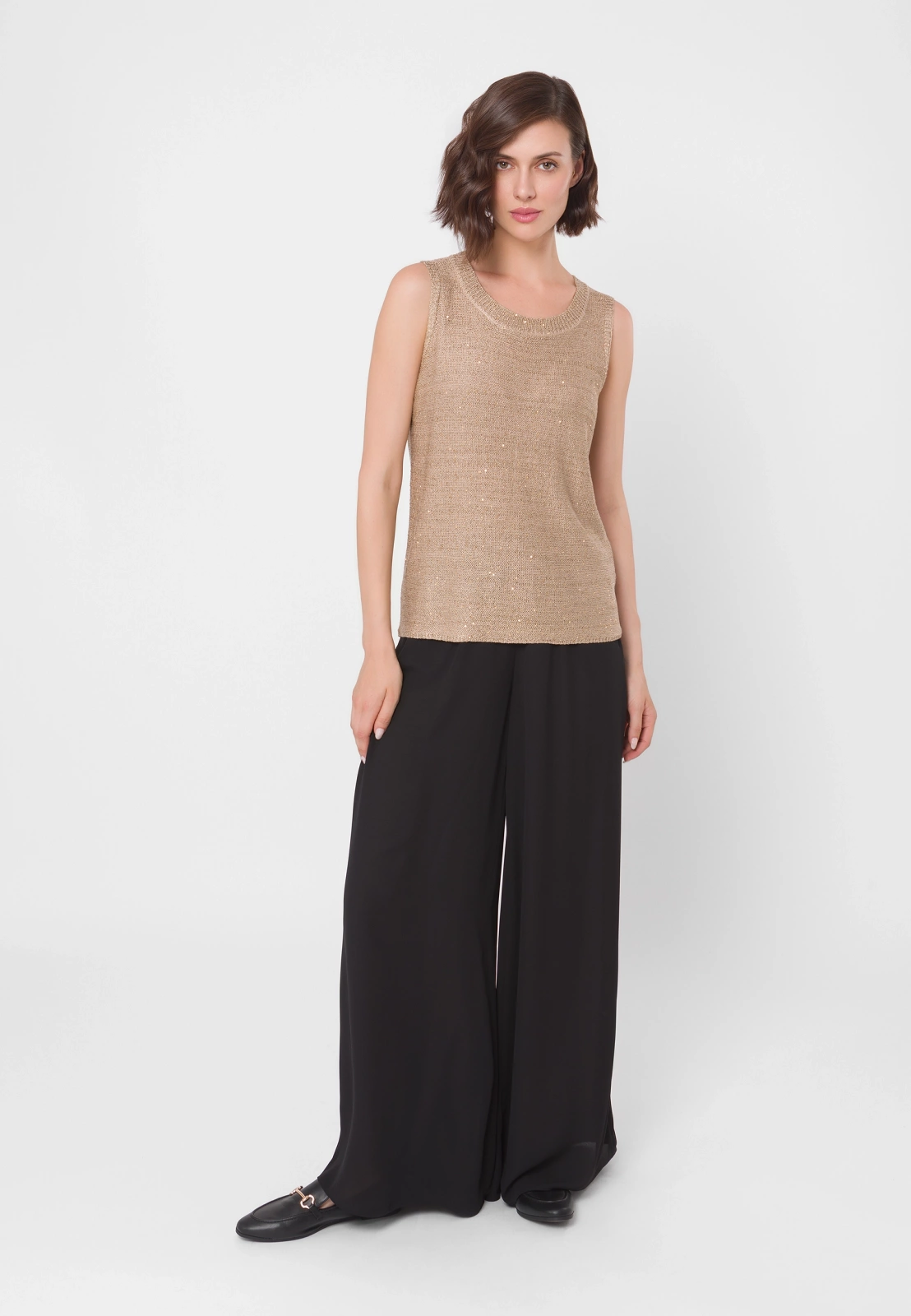 Dzianinowa bluzka z wiskozy w eleganckim, neutralnym odcieniu złotego beżu. Ma prosty fason bez rękawów z okrągłym dekoltem. Materiał zdobią złote cekiny, wplecione w całość, które doskonale się komponują z odcieniem przędzy. Bluzka sprawdzi się zarówno w wersji solo, jak i noszona w duecie z cekinowym kardiganem z tej samej kolekcji. Pasuje na sylwetki o różnych kształtach.