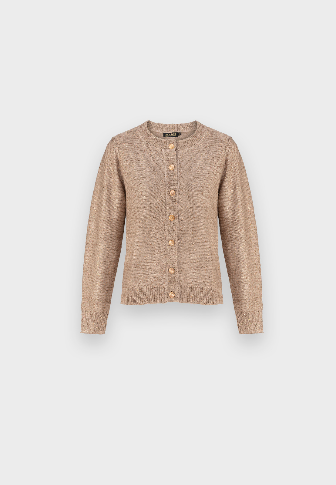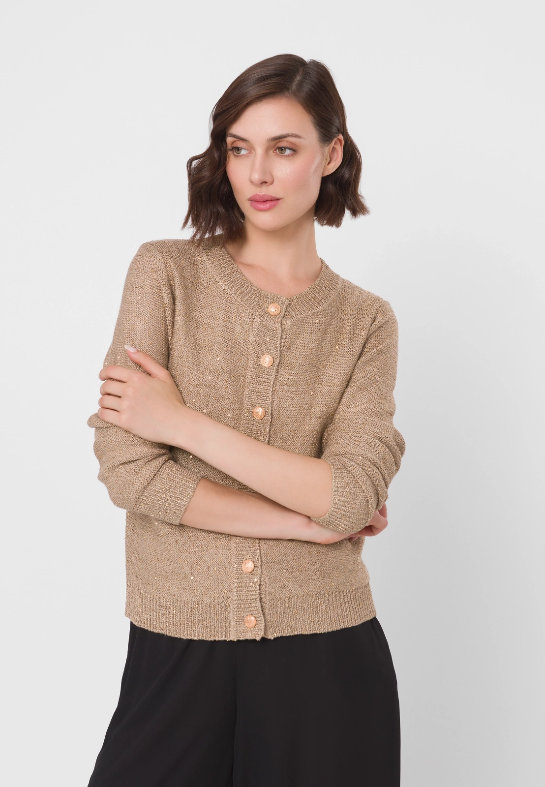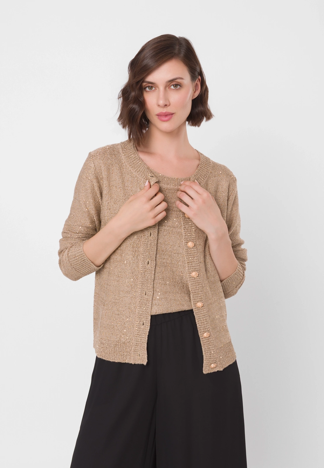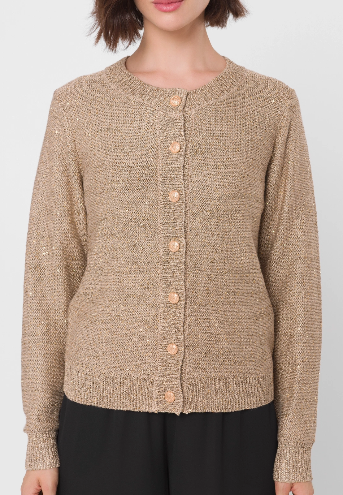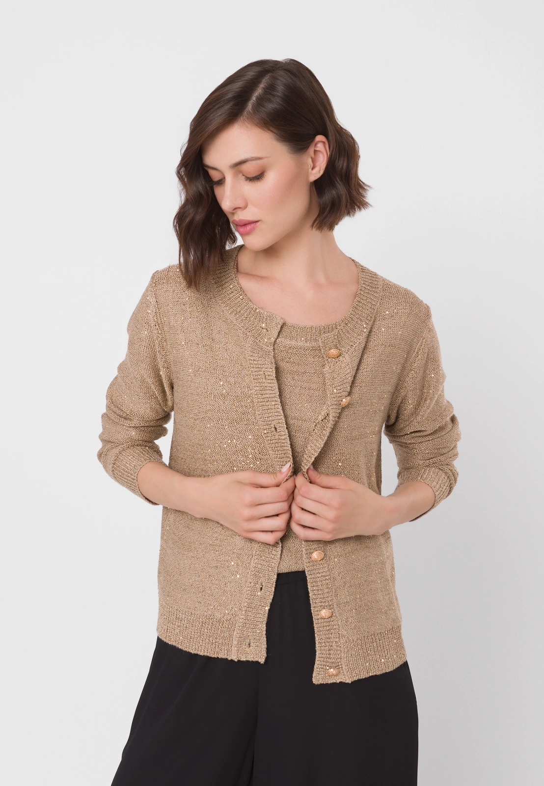 Beżowy kardigan  z miękkiej, lekkiej dzianiny to całoroczny klasyk damskiej garderoby. W wydaniu zdobionym złotymi cekinami zyskuje oryginalny charakter i doda wyjątkowości Twoim stylizacjom. Ma prosty fason z okrągłym dekoltem i ściągaczami na dole oraz na końcach długich rękawów. Jest zapinany na ozdobne guziki. Do kompletu możesz dobrać top wykonany z tego samego materiału. Kardigan dostępny również w kolorze czarnym.